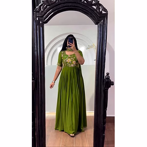 This full-stitched gown boasts a length of 56" with a beautiful flair of 3.50Mtr and a chest size of 44", ensuring a flattering silhouette that enhances your confidence and charm.