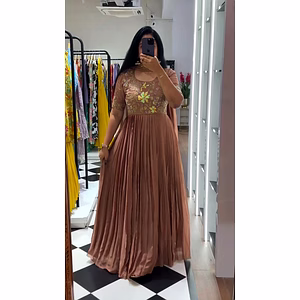 Indulge in luxury with our Faux Georgette Gown, featuring delicate fancy thread work and intricate sequence details on soft Micro Cotton inner lining for a comfortable fit.