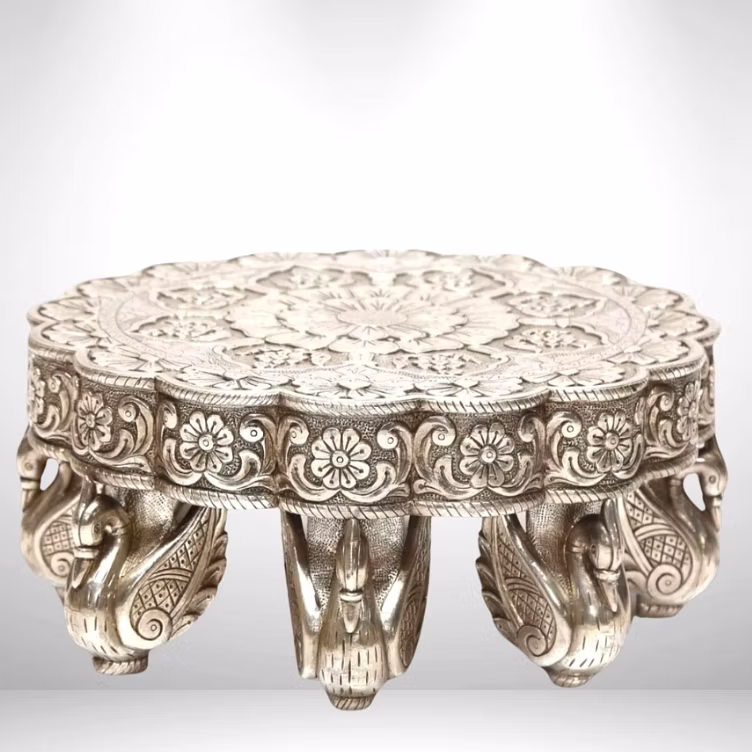 Introducing our exquisite Low-Height Round Chowki, adorned with silver cladding and supported by intricately crafted peacock statue legs, all crafted from high-quality wood.