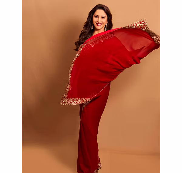 Drape yourself in elegance with the Madhuri Dixit Red Saree. This exquisite piece exudes grace and sophistication, perfect for any special occasion.