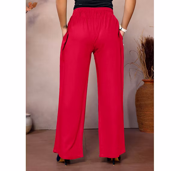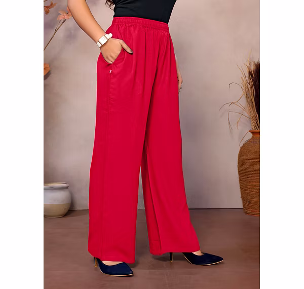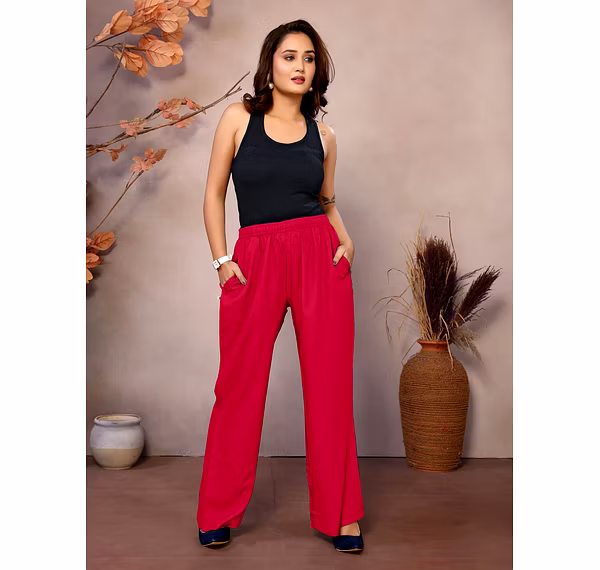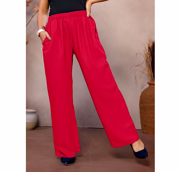 Upgrade your everyday wardrobe with these stylish and ultra-comfortable Women's Viscose Rayon Palazzo Pants. Designed with a mid-rise elastic waistband for a perfect fit, these wide-leg, ankle-length bottoms offer a relaxed and flowy silhouette that flatters every body type. Crafted from soft and breathable viscose rayon, they ensure all-day comfort, while functional side pockets add convenience. Ideal for casual outings, lounging, or travel, these solid-color palazzos are a versatile must-have for effortless, chic dressing.