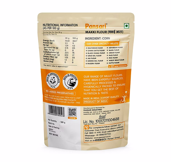 Makki Atta 500g is a high-quality maize flour made from carefully selected corn grains, offering authentic taste and nutritional benefits. It is widely used in traditional Indian cooking, especially for making makki ki roti, often served with sarson ka saag.