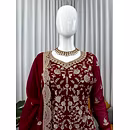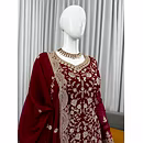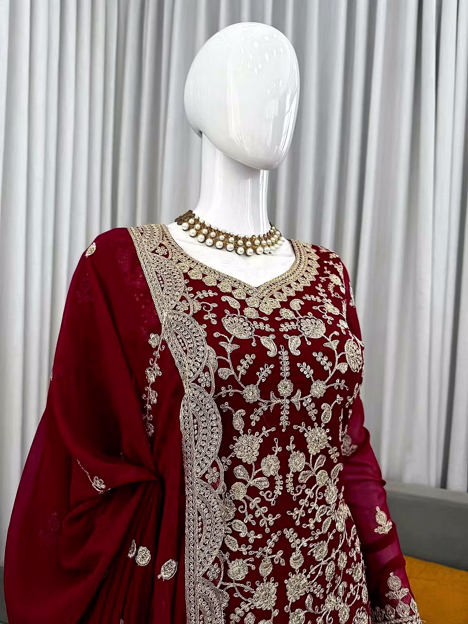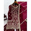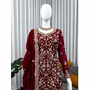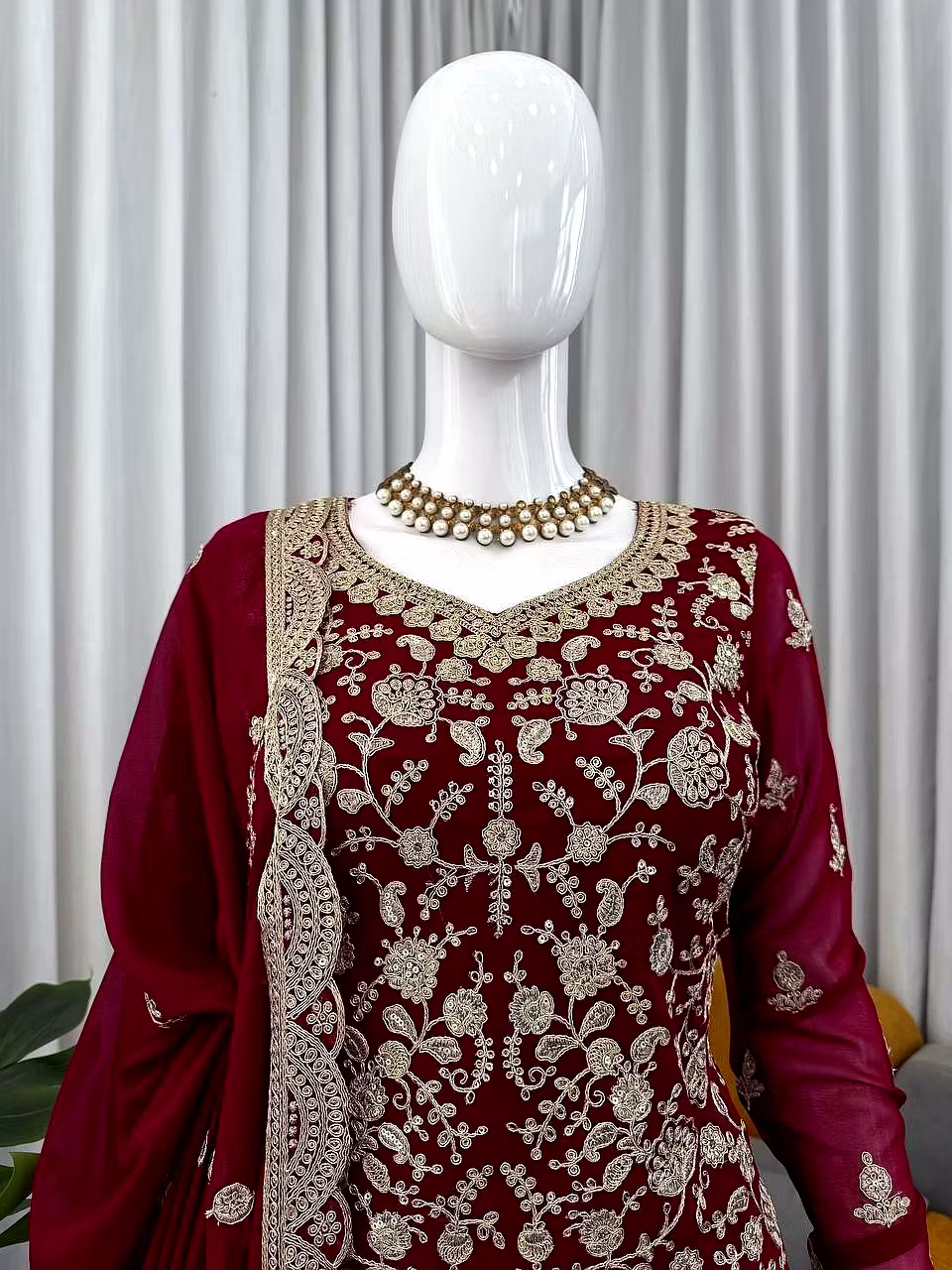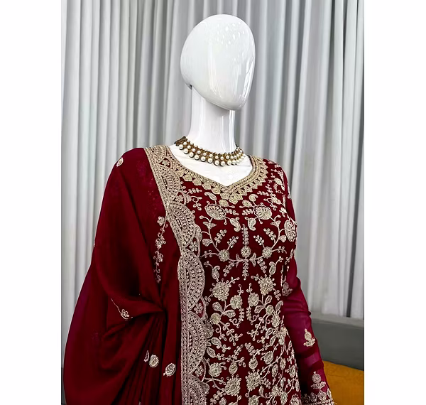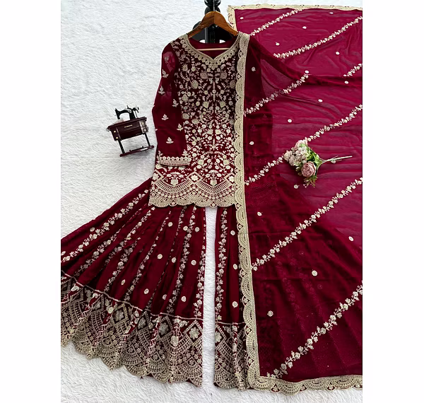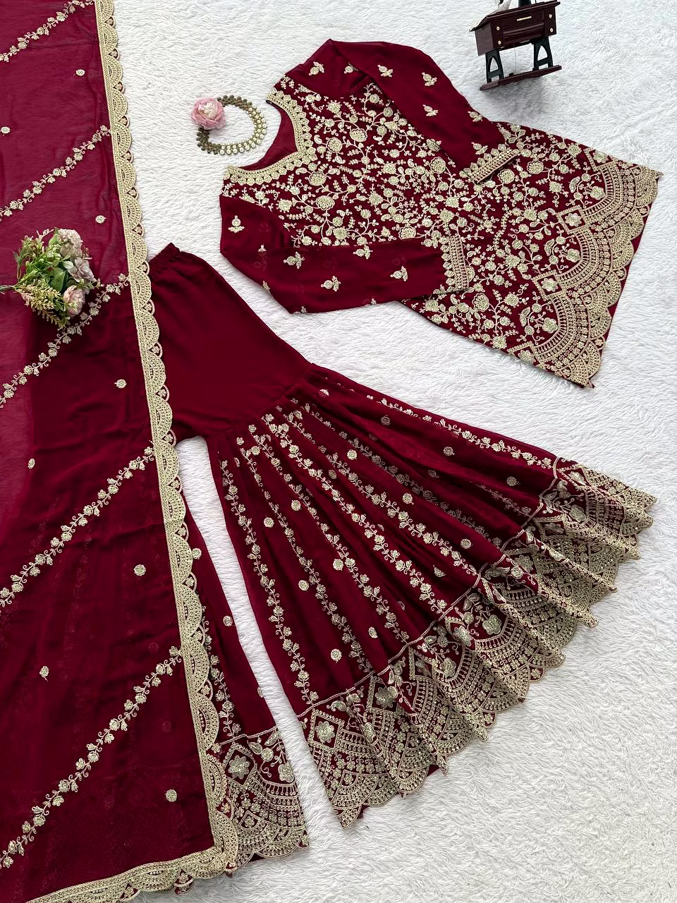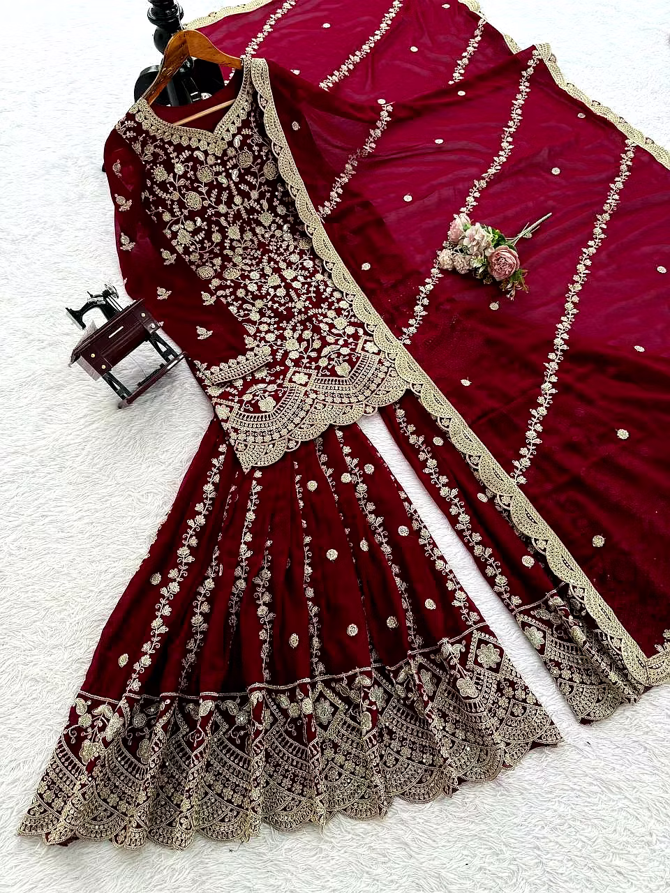 Indulge in the allure of the Maroon Georgette Sharara Suit with Dupatta that features intricate embroidery and a flattering silhouette, making you the center of attention at every event.