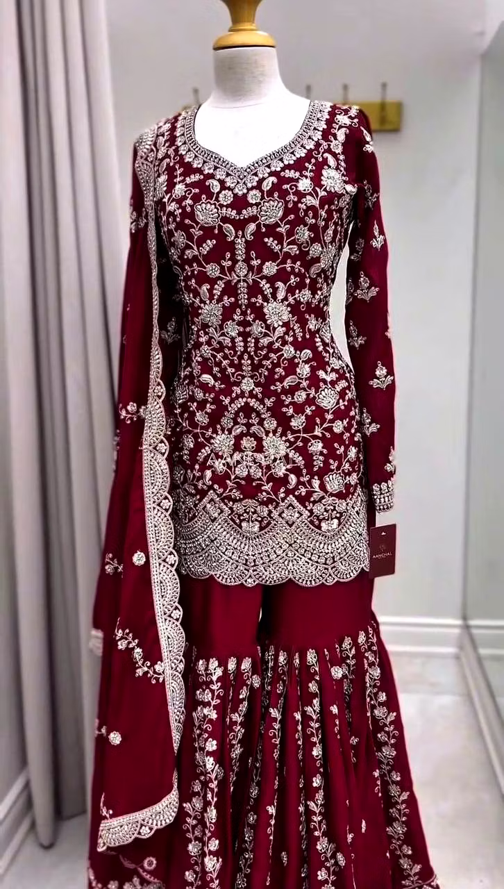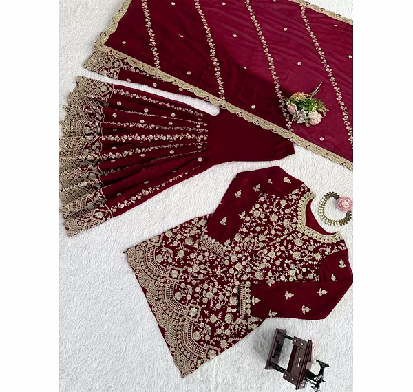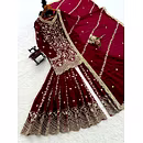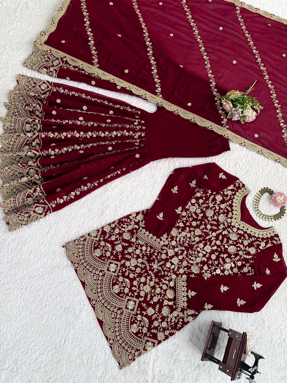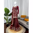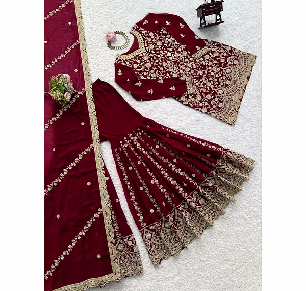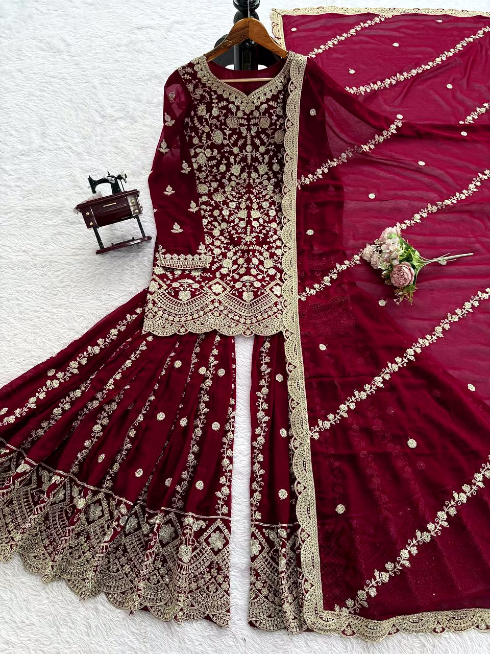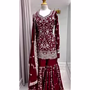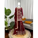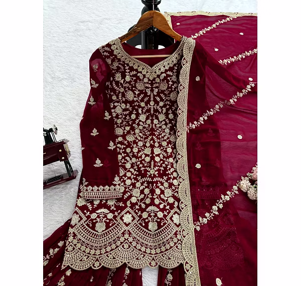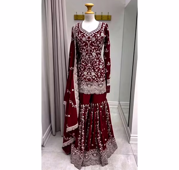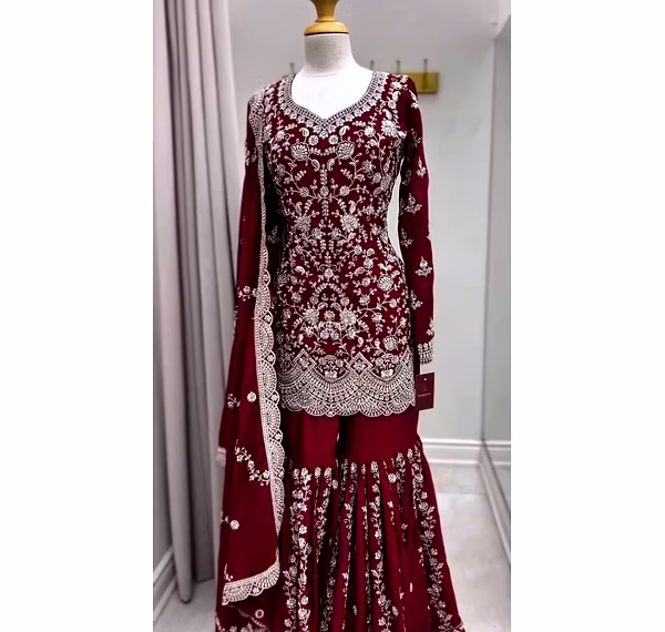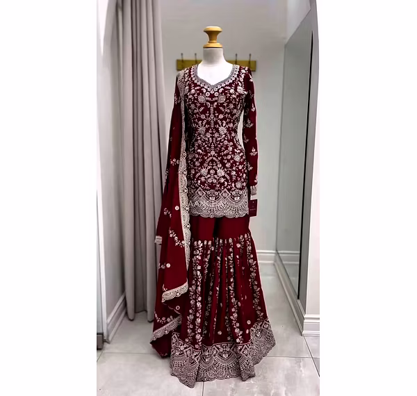 From festive celebrations to formal gatherings, this maroon georgette sharara suit offers versatile styling options, allowing you to showcase your unique style and grace with confidence.