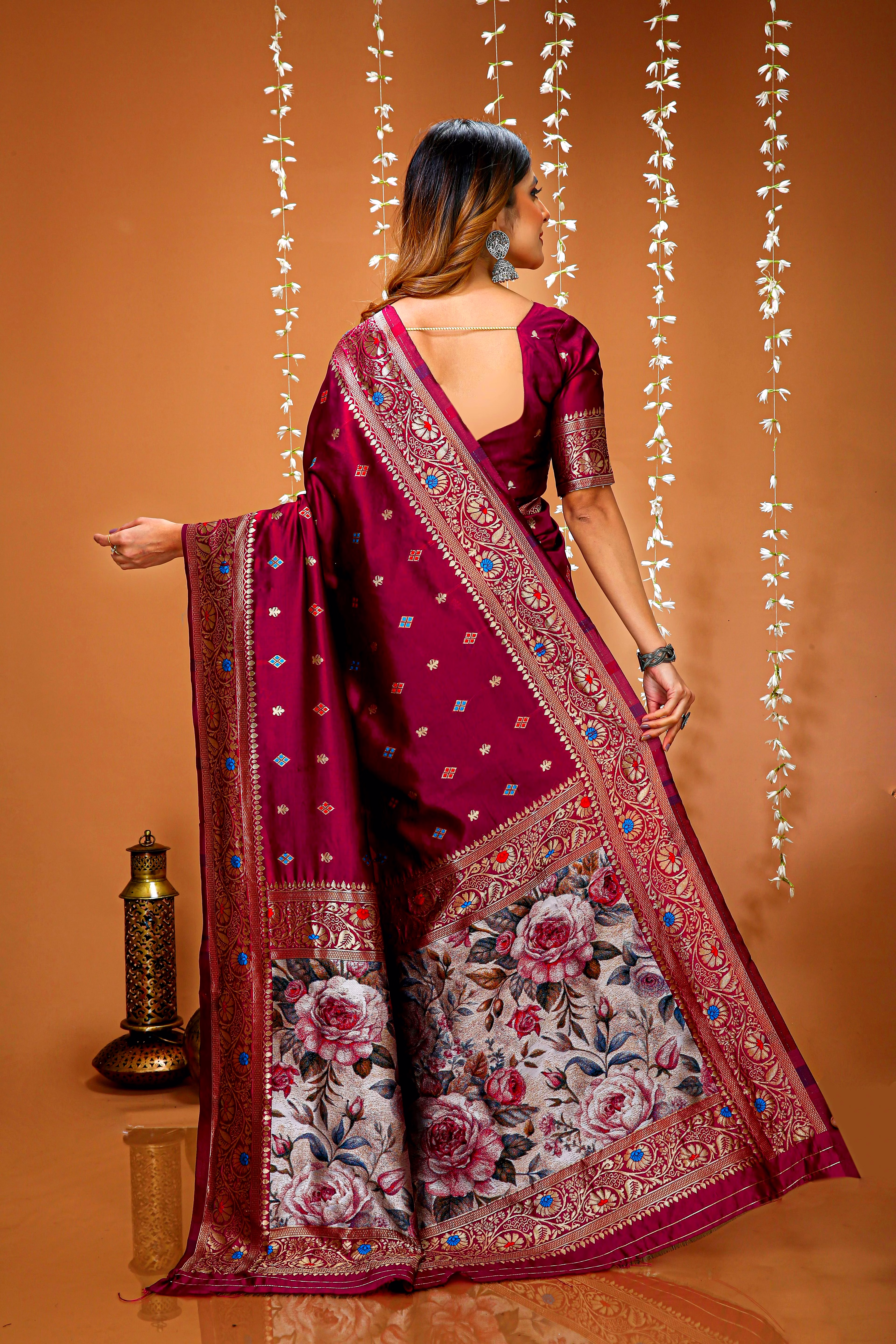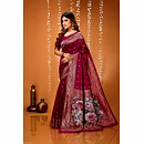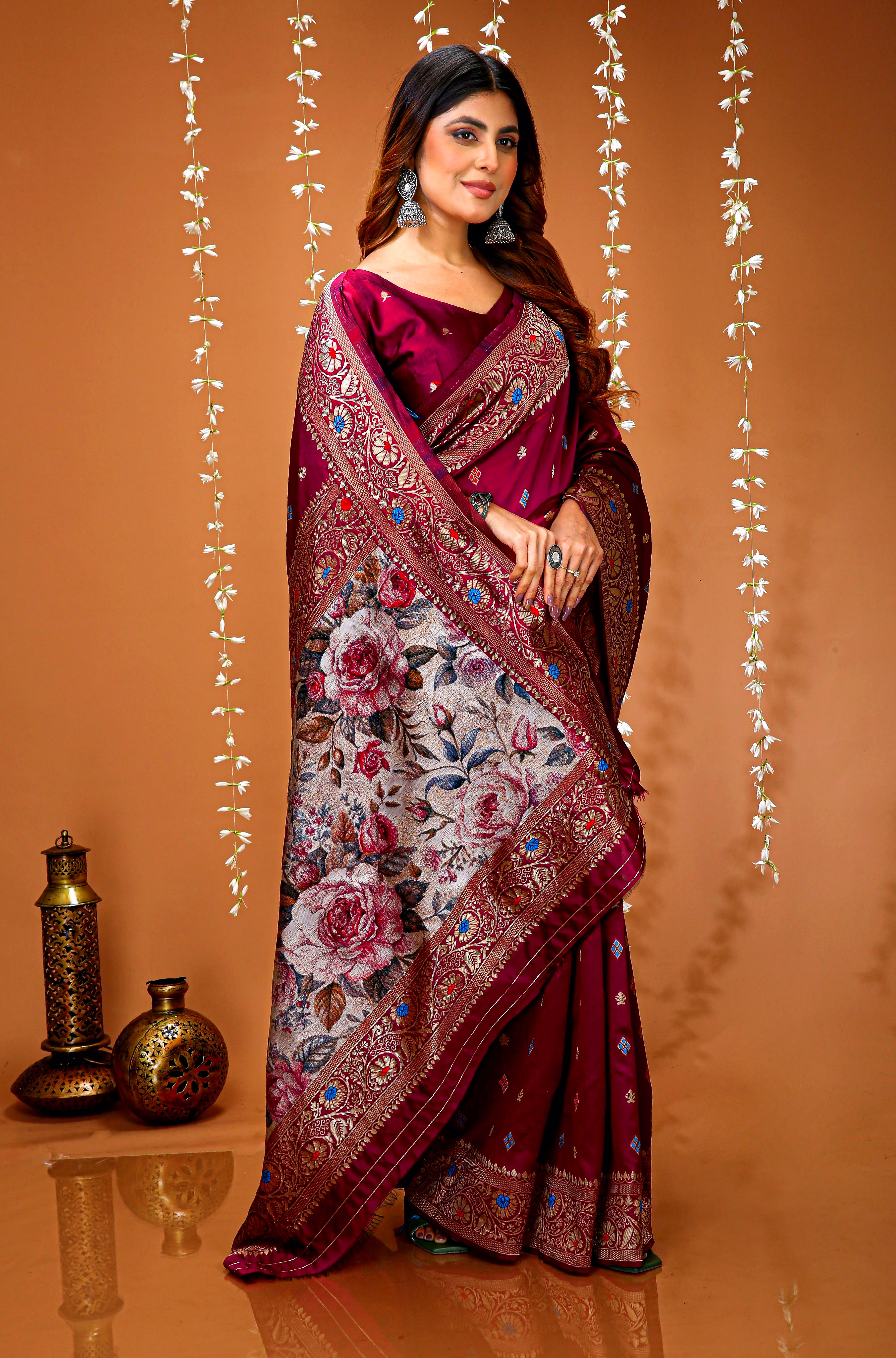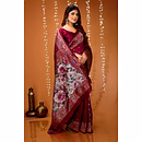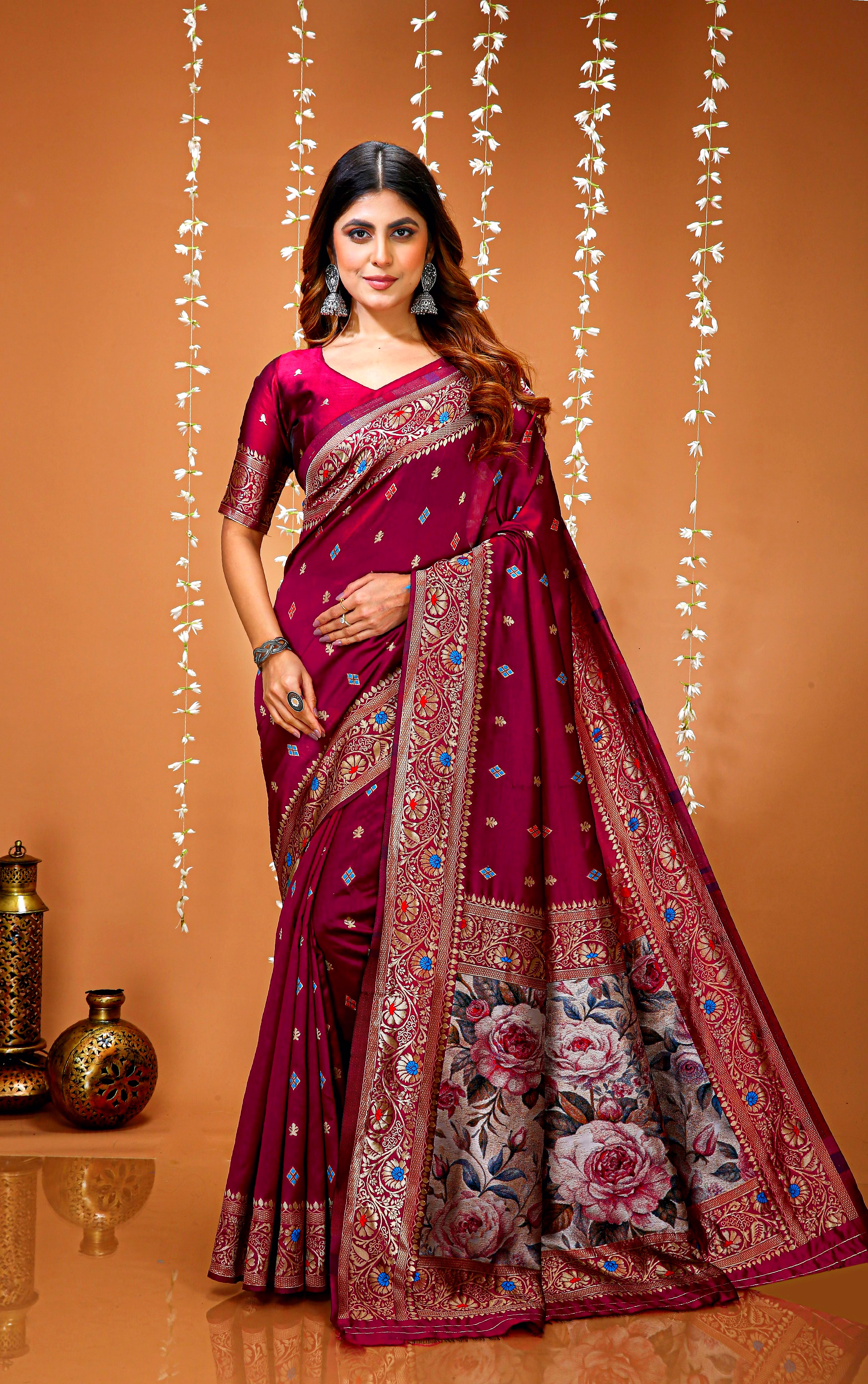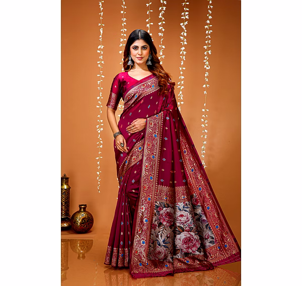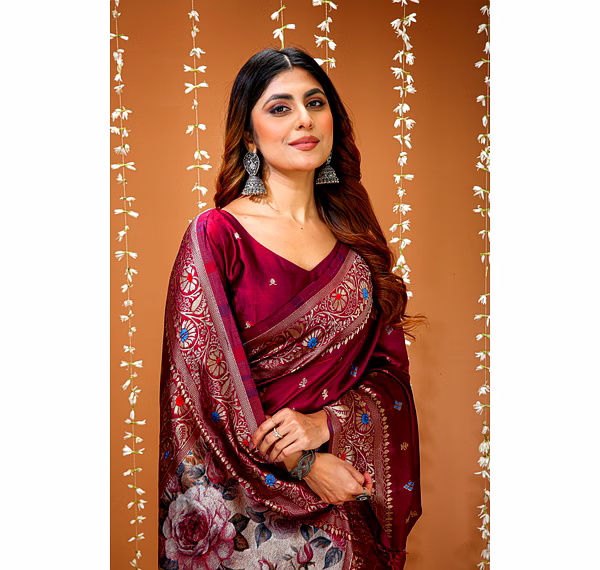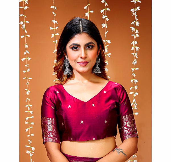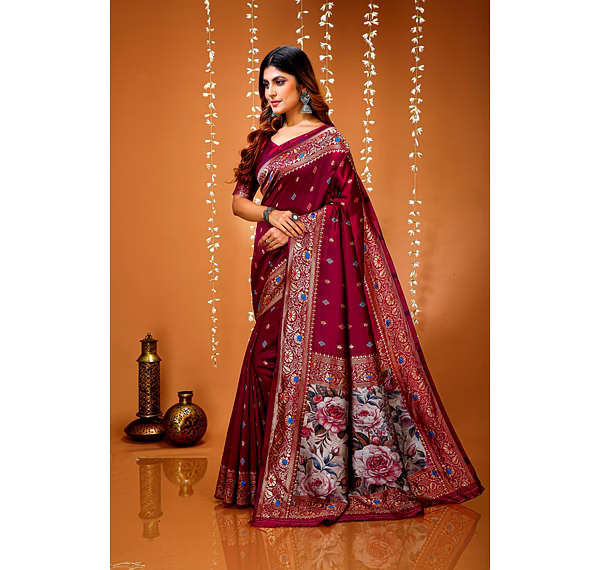Indulge in the intricate beauty of our Maroon Lichi Silk Saree. Each thread woven with precision to create a masterpiece that reflects the rich traditions of Indian textiles. Embrace the fine artistry that adorns every inch of this saree.