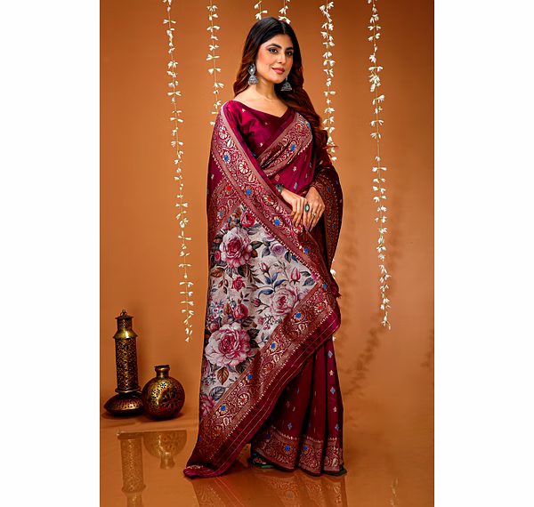 Experience the versatility of our Maroon Lichi Silk Saree. Whether you prefer a traditional look or a modern twist, this saree effortlessly complements any style. Enhance your grace and allure with this timeless piece that transcends trends.