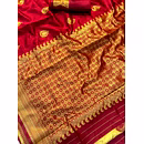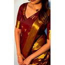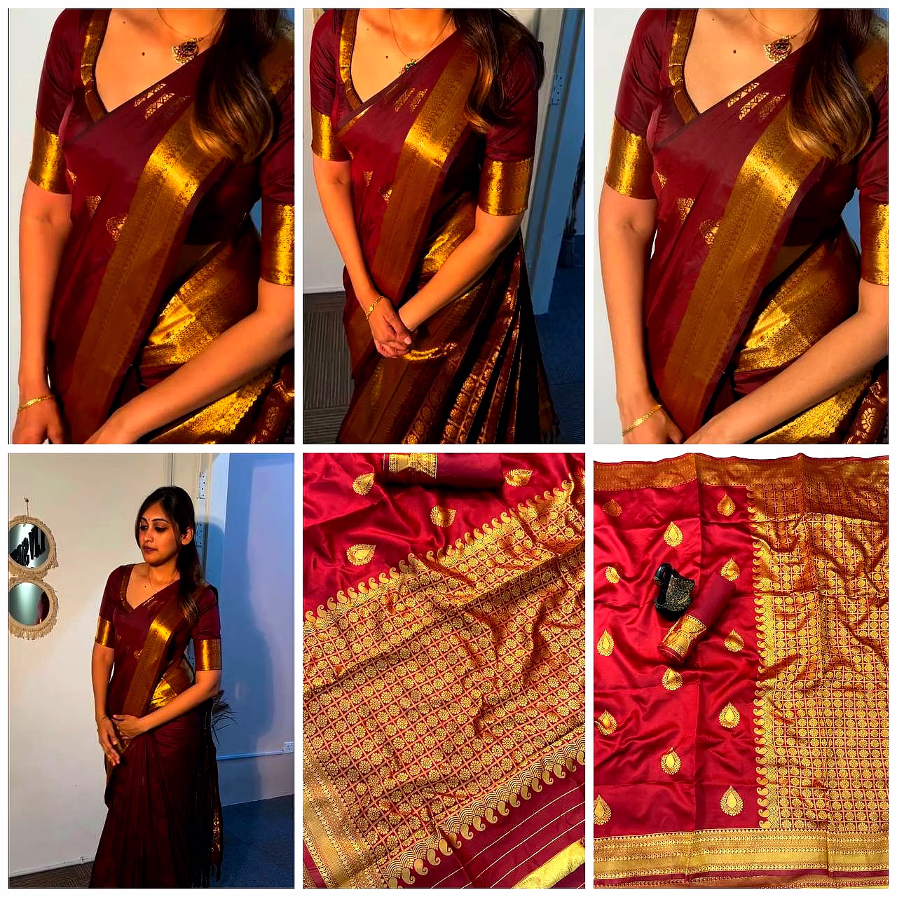 Drape yourself in the timeless elegance of our Maroon Lichi Silk Saree. Perfectly blending traditional Banarasi motifs with modern comfort, this saree is designed for the woman who loves to make a sophisticated statement.