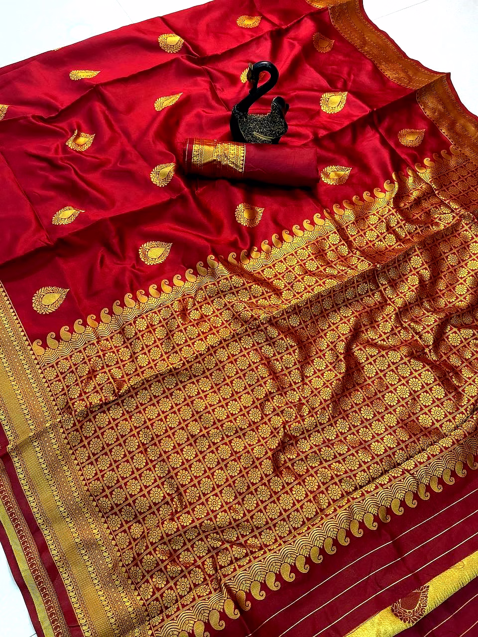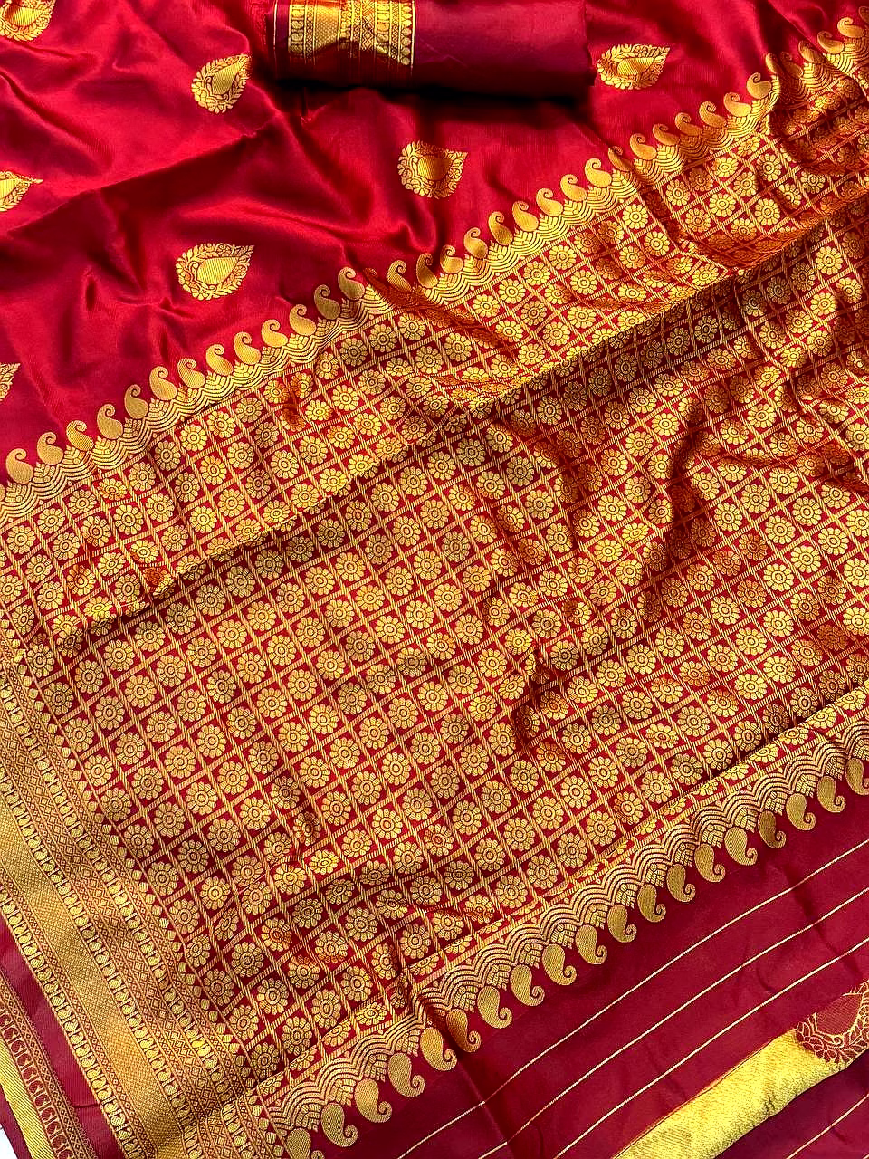 Work Type: Intricate Jacquard Weaving with Gold Zari accents