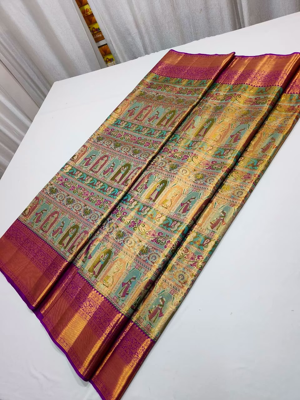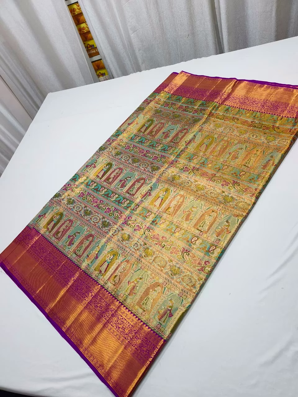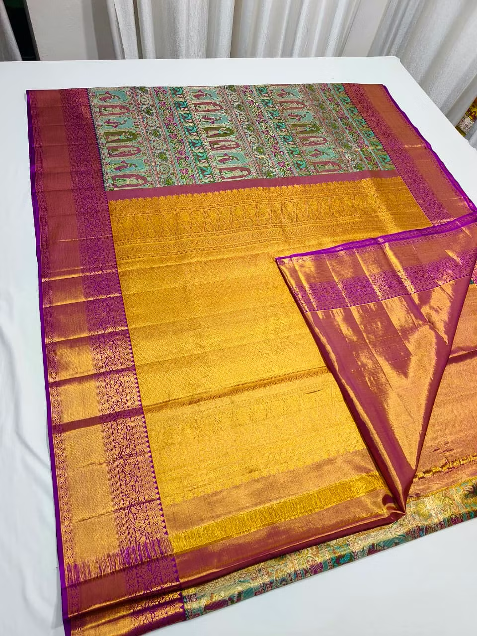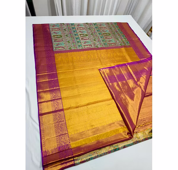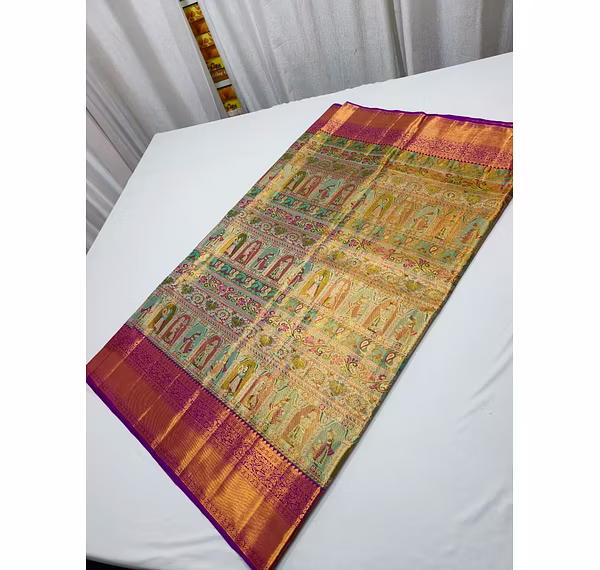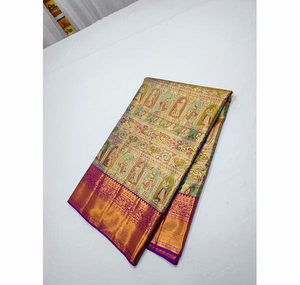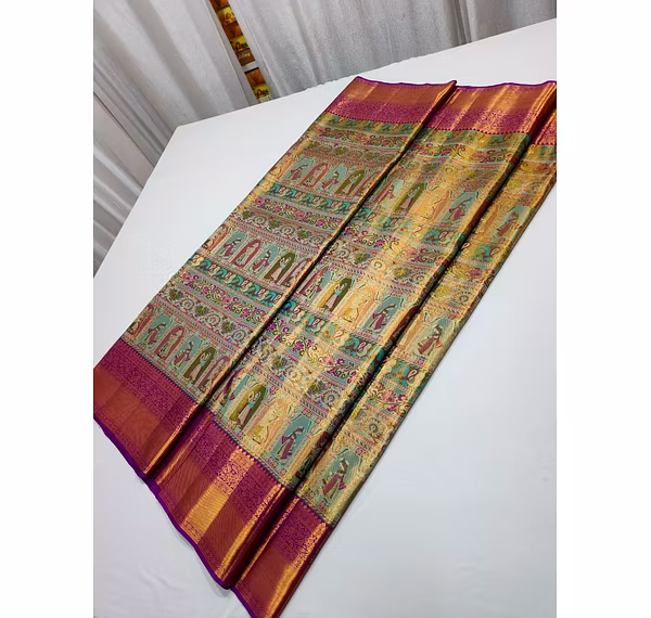 Elevate your elegance with the Meenakari designer saree, a masterpiece of Dharmavaram handloom weaving. Perfect for weddings and bridal occasions.
