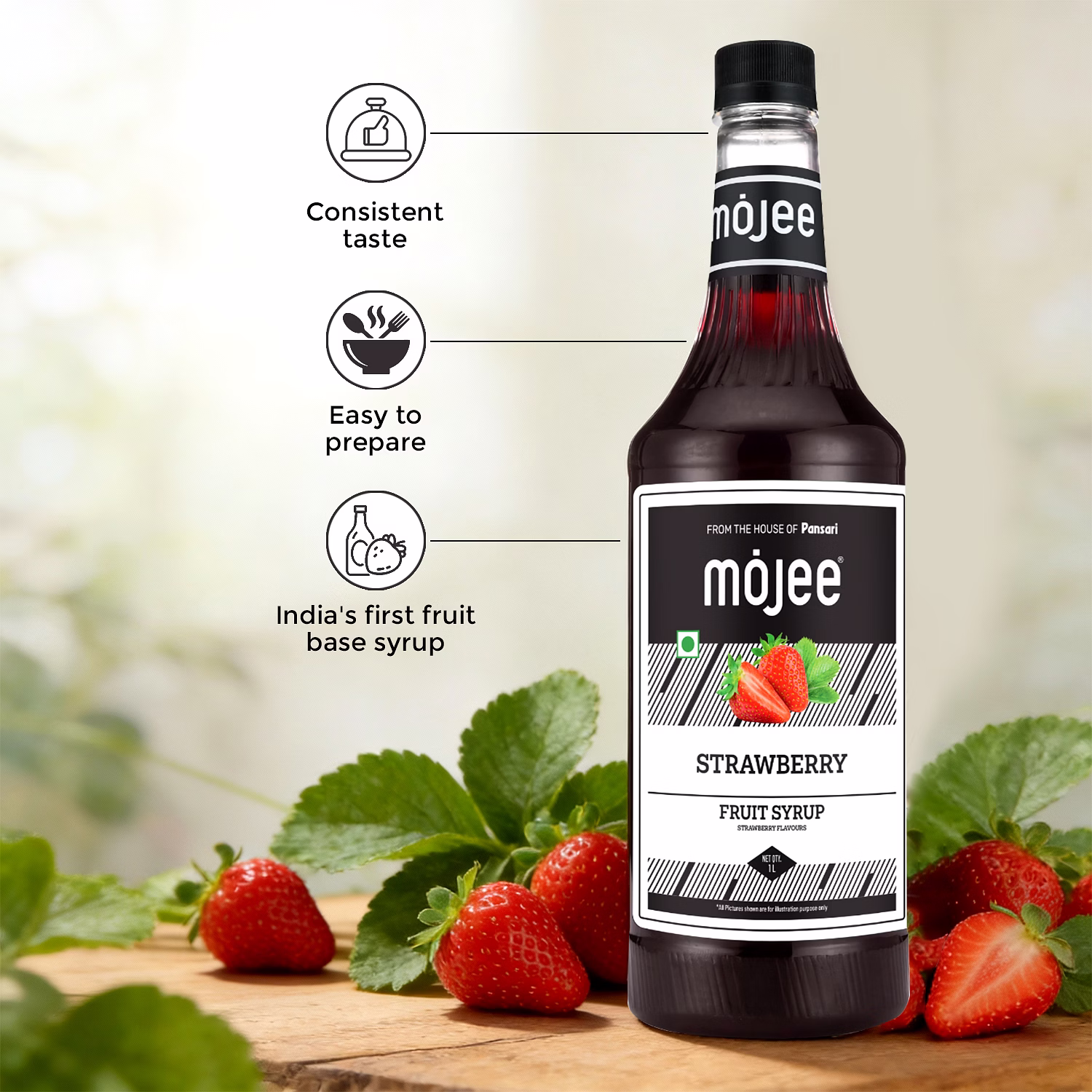 Mojee Strawberry Syrup 1L brings a soft and fruity strawberry taste that fits well in many everyday recipes. Its smooth texture helps it mix easily with water, milk, or soda, making it a simple choice for preparing refreshing drinks.