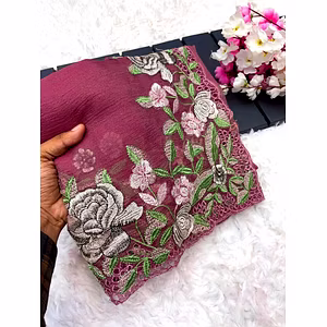 Moss chiffon silk with digital print and aari mirror work on body with a perfect border with a super rich design with a full fancy blouse