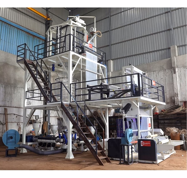 Multilayer Blown Film Machines incorporate advanced features like grooved feed barrel. Barrier screw, dosing system, Liquid PIB dosing system, manual as well as automatic screen changer, Rotating Die / platform/ Haul-off Unit, internal bubble cooling, automatic bubble cage, online thickness monitoring and control, 2/4 station surface and center winders, Auto Tension Control, Corona Treaters etc. for longer life, higher productivity and better quality