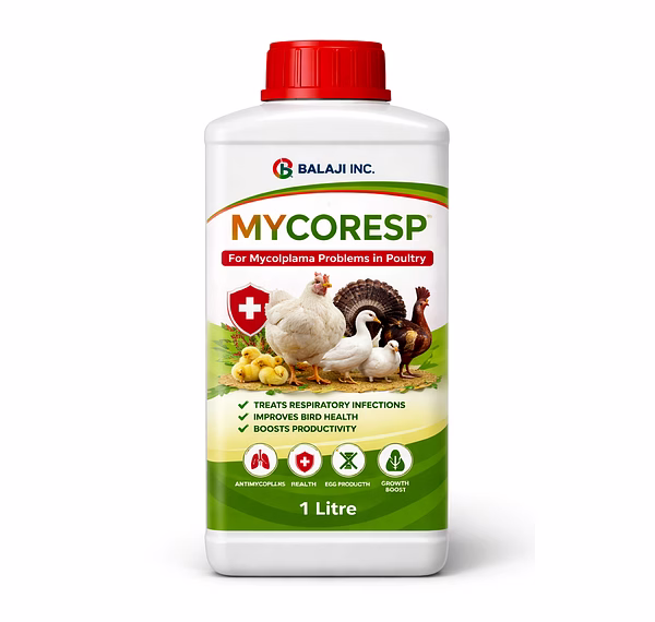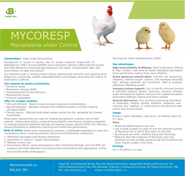 MYCORESP 1 LTR, containing ZnO-NPs, is a game-changer in poultry health. Its significant role in reducing clinical signs and lesions caused by Mycoplasma gallisepticum makes it a go-to choice for maintaining flock health.