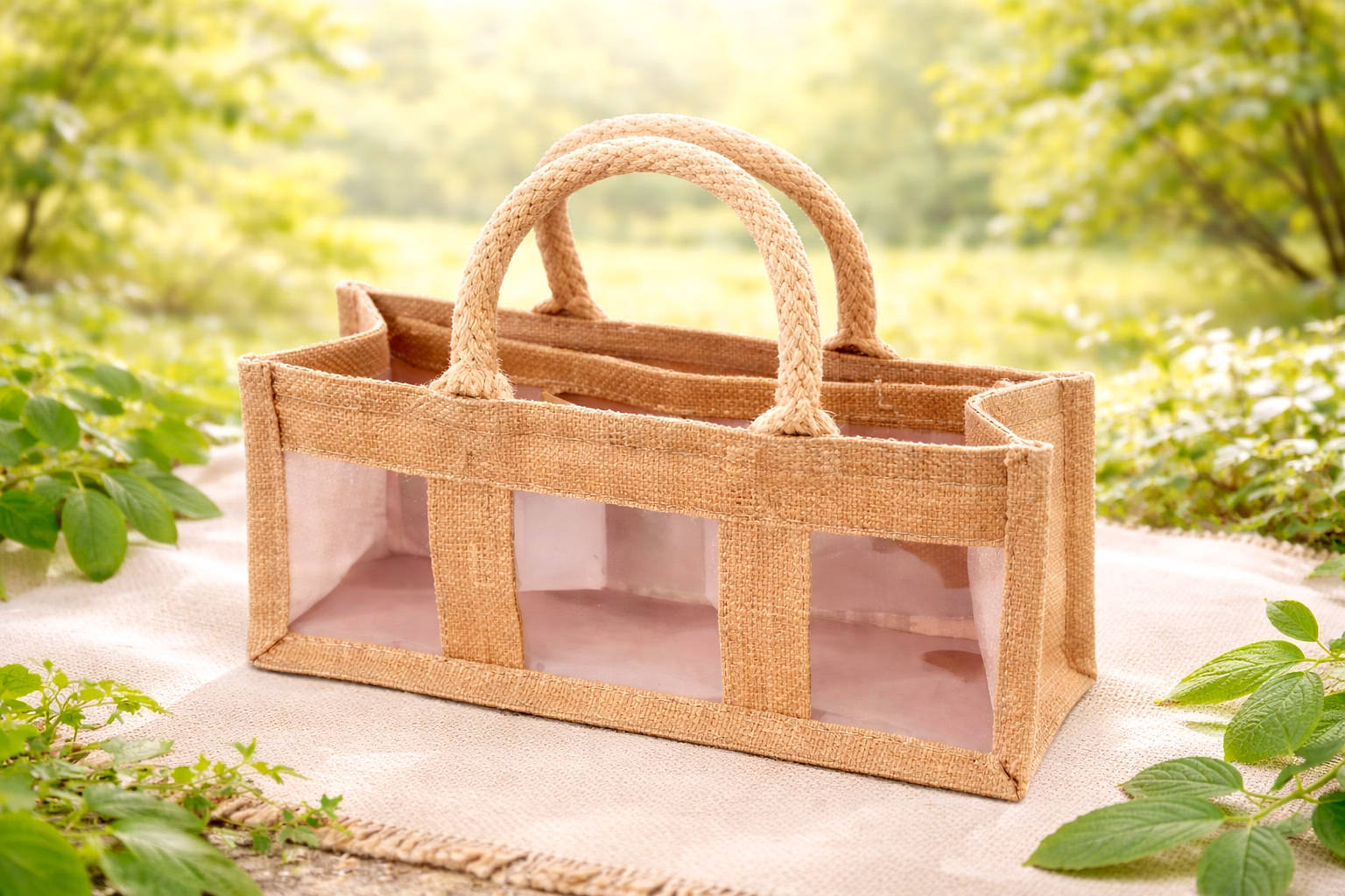 Elevate your wine packaging with our Natural Jute 3-Bottle Promotional Bag. Crafted from eco-conscious natural jute fabric, this bag holds up to three bottles securely with stitched internal dividers. The transparent front windows not only showcase your products but also add a touch of elegance. The reinforced padded cotton rope handles provide a comfortable grip, making it perfect for corporate gifting, retail stores, and festive occasions.