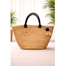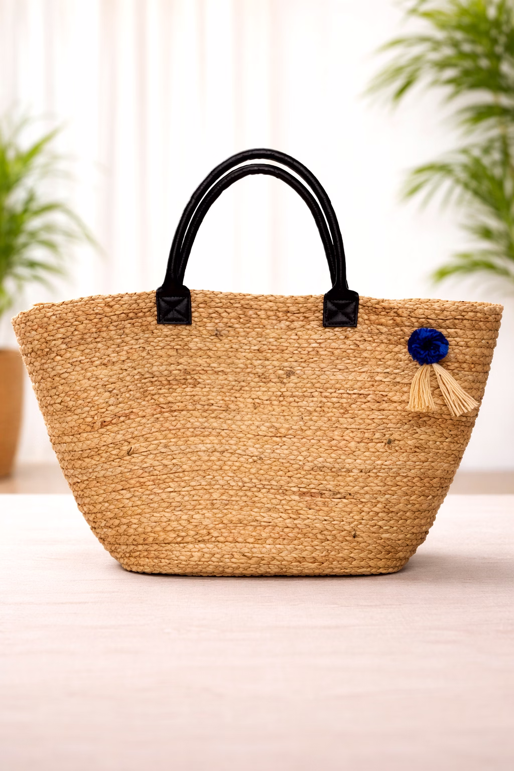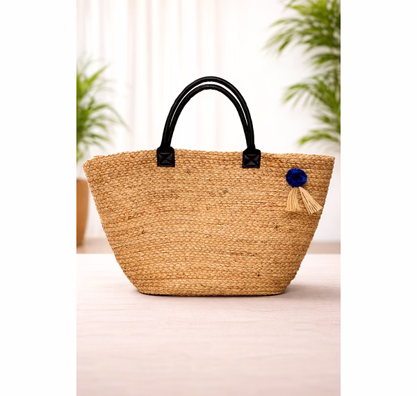 Indulge in eco-luxury with our Natural Jute Woven Tote Bag. Crafted from premium jute fiber, this elegant handbag exudes sophistication with its handwoven texture and artisanal finish. The striking blue tassel adds a touch of playful charm to your everyday look.