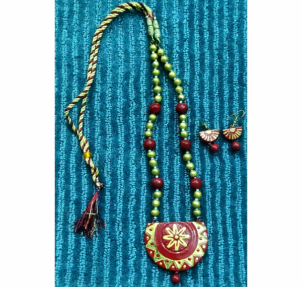 This stunning terracotta necklace and earring set celebrates the artistry of traditional Indian craftsmanship from Uttar Pradesh. Hand-sculpted from natural clay and painted in rich red and golden hues, the necklace features a beautifully carved floral half-moon pendant that exudes elegance and cultural charm.
