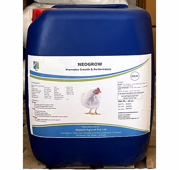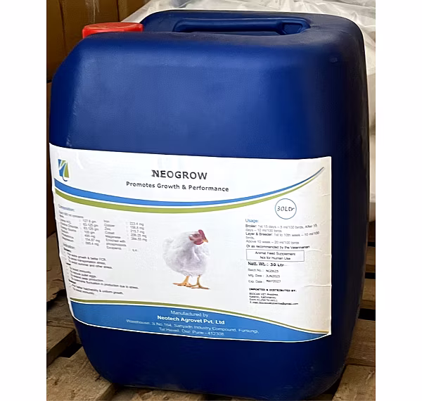 NEOGROW LIQ as growth promoters in poultry are used to enhance growth, improve feed conversion, and boost overall health and productivity in chickens. They can improve body weight, egg production, and reduce mortality, while also supporting the immune system and improving nutrient absorption.Growth promoters help achieve faster and more uniform body weight gain in broilers, leading to increased meat production. Enhanced Feed Efficiency: They improve feed conversion ratio (FCR), meaning birds require less feed to produce the same amount of meat or eggs. Liquid growth promoters can increase egg production in layers and improve eggshell quality.