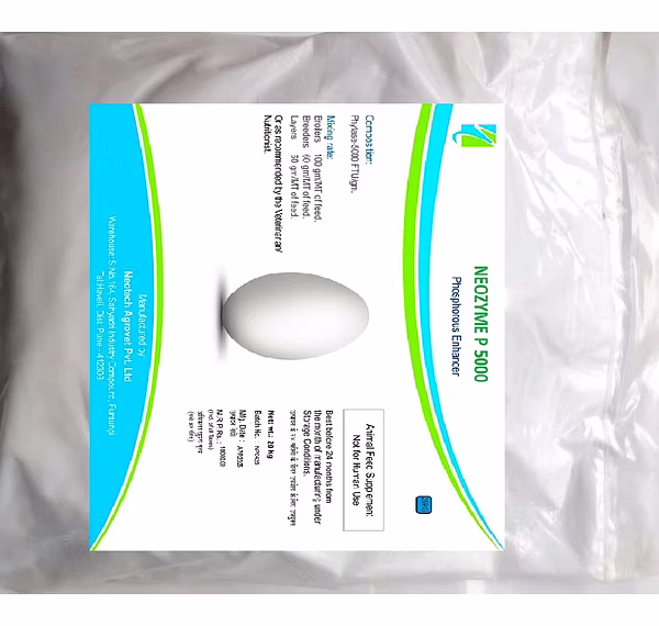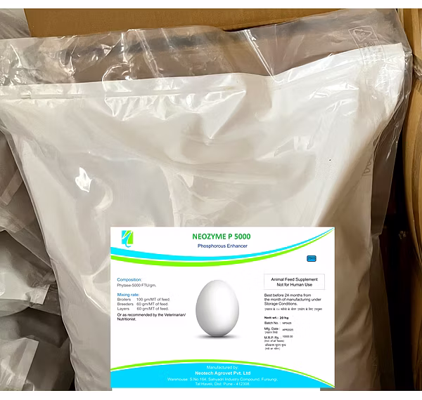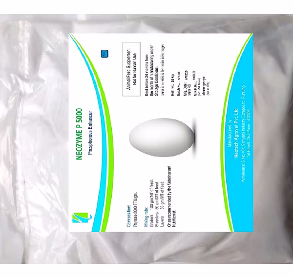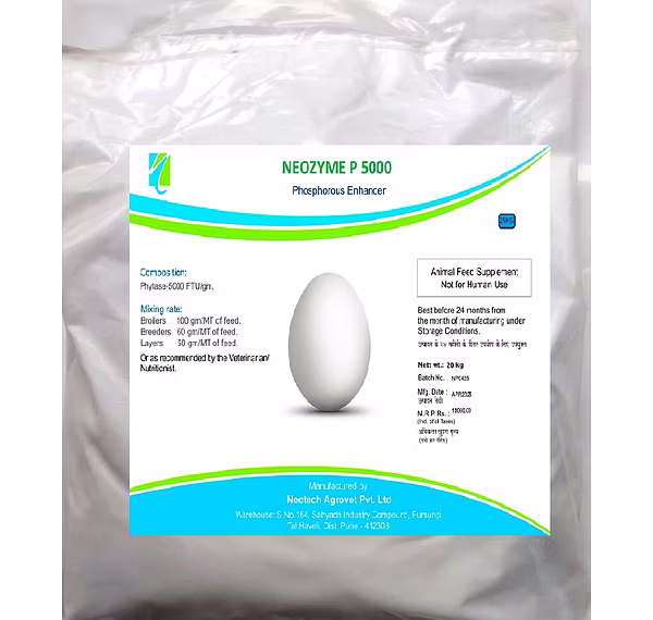 NEOZYME P 5000 - Phytase enzyme in poultry feed is an enzyme that enhances phosphorus absorption by breaking down phytic acid, a major component of plant-based feed ingredients. This improves nutrient utilization, growth, and reduces phosphorus excretion in poultry waste, minimizing environmental impact.