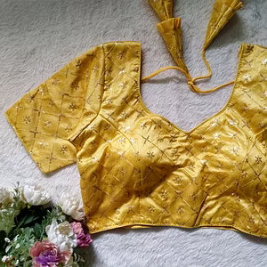 Introducing our latest addition to our collection: the designer cotton print blouse with foil print. Made from high-quality cotton fabric, this blouse is not only stylish but also comfortable to wear. With its unique foil print design, this blouse is sure to make a statement wherever you go. Featuring a size 38, this blouse can be easily self-altered to fit up to a size 42, ensuring a perfect fit for every body shape. The open-front design with side hook closure adds a touch of elegance and sophistication to this blouse, making it suitable for both formal and casual occasions. The key feature of this blouse is its exquisite foil print design. The foil print adds a shimmering effect to the blouse, making it stand out from the crowd. The intricate patterns and vibrant colors of the print are perfect for those who love to make a bold fashion statement. Not only does this blouse look stunning, but it also offers several benefits. The cotton fabric feels soft against the skin, providing all-day comfort. The breathable nature of cotton makes it ideal for warmer weather, ensuring you stay cool and comfortable throughout the day. What sets this blouse apart from others is its versatility. Whether you pair it with jeans for a casual look or dress it up with a skirt for a formal event, this blouse will effortlessly elevate any outfit. Its timeless design ensures that it will remain a wardrobe staple for years to come. In summary, our designer cotton print blouse with foil print is a must-have addition to any fashion-conscious individual's wardrobe. With its stunning foil print design, comfortable cotton fabric, and versatile styling options, this blouse offers both style and comfort. Don't miss out on the opportunity to make a fashion statement with this unique and elegant blouse.