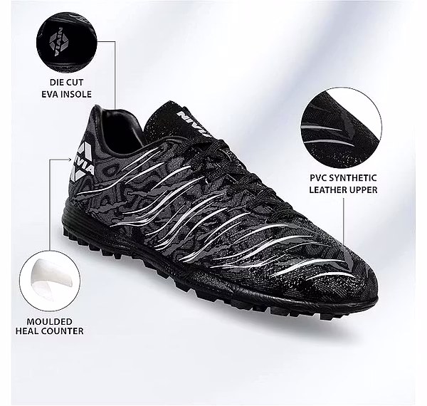 Nivia Premier Carbonite 5.0 Turf delivers enhanced grip and stability while you enjoy your favourite sport. You can use these studs for your daily practise sessions. They have a sole made from premium quality rubber material for enhanced durability and grip. PVC Synthetic leather provides excellent ball control and tackling. The upper will encase each foot in durable comfort. It creates a better, healthier environment for your feet to thrive in. The construction produces an irritation-free fit, reducing bulk, layers, and weight lacing system works to deliver an anatomically correct fit. Two layers of high-density foam line the collar and mould to the athlete's foot to create a personalised heel fit,adding soft support and custom comfort. standard adjustable nylon lace. A die-cut soft eva sockliner exists as an extra layer of plush,step-in comfort. More comfort and grip are provided by the die-cut light-weight insole. Rubber Studs deliver ultimate traction and deliver superior stability with an outsole specially designed for artificial turf surfaces.