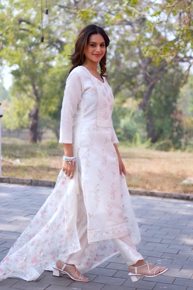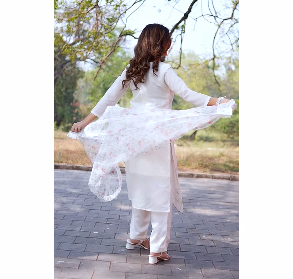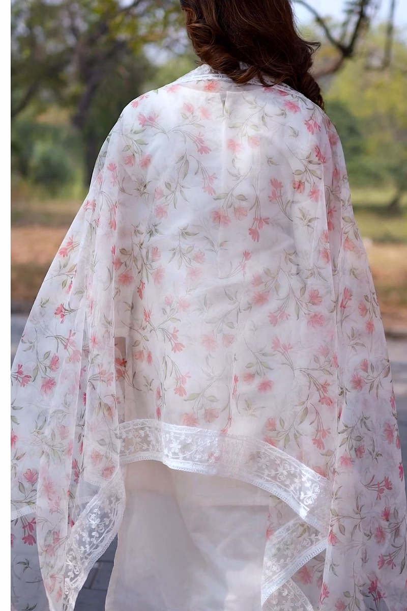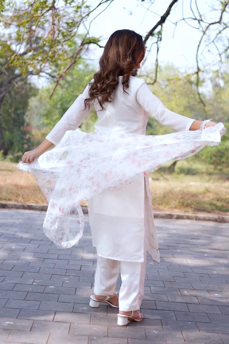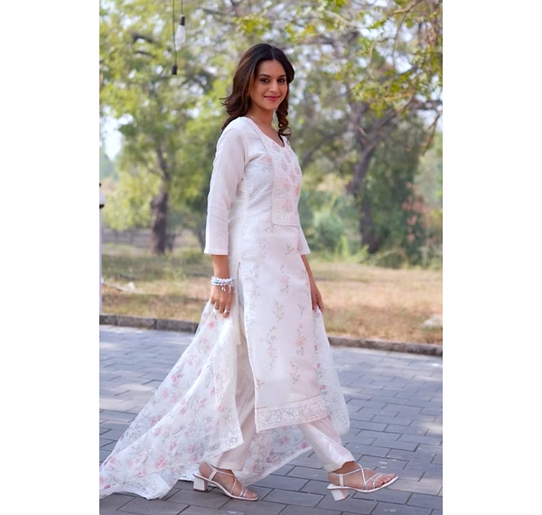 Elevate your wardrobe with our off-white chanderi suit featuring a stunning printed organza dupatta. Perfect for casual outings or special occasions.