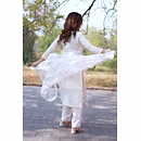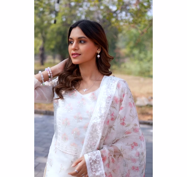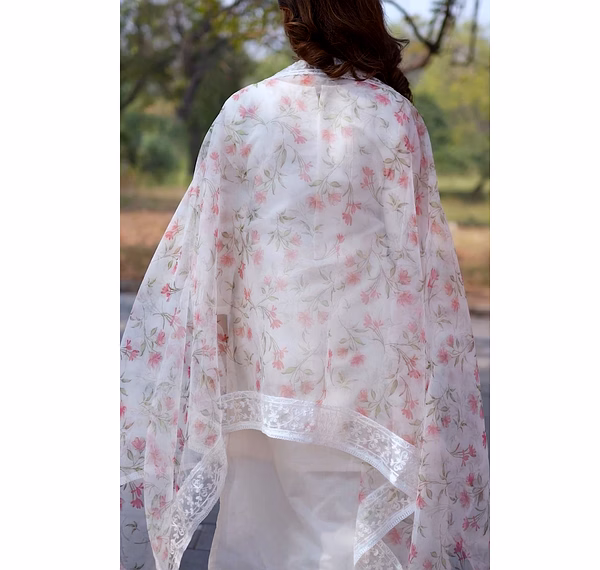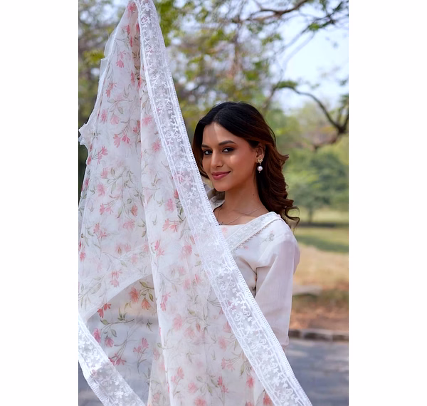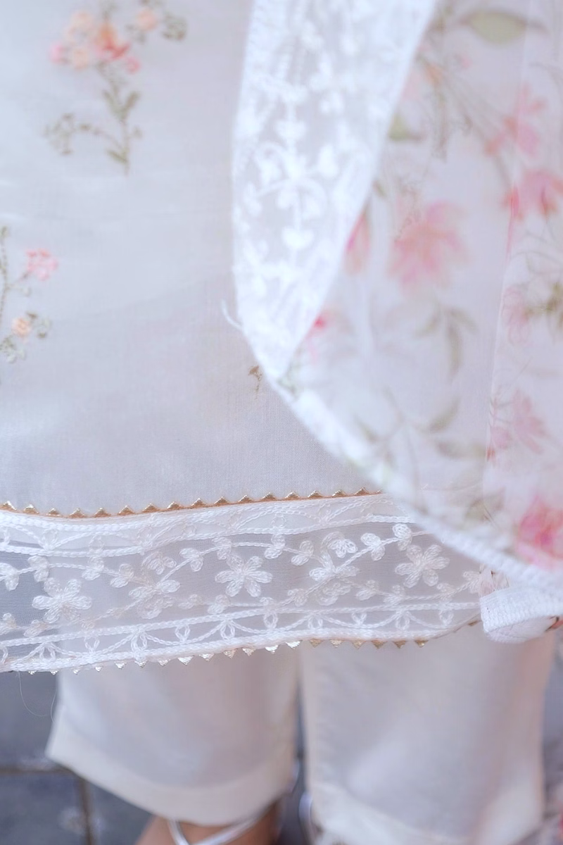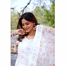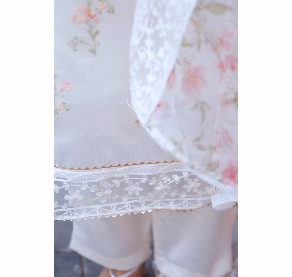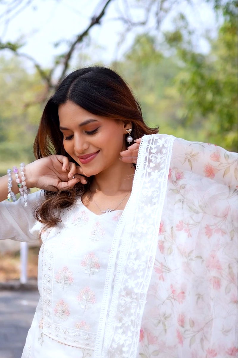 Elevate your wardrobe with our off-white chanderi suit featuring a stunning printed organza dupatta. Perfect for casual outings or special occasions.