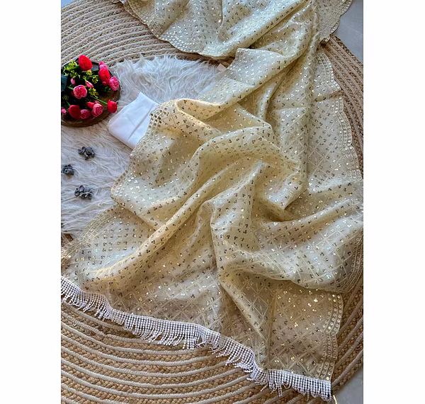 Immerse yourself in luxury with our Off-White Slub Organza Saree featuring delicate sequin embroidery that adds a touch of glamour to your ensemble. Each sequin is meticulously crafted to catch the light effortlessly, making you the center of attention at any event.