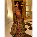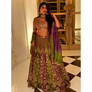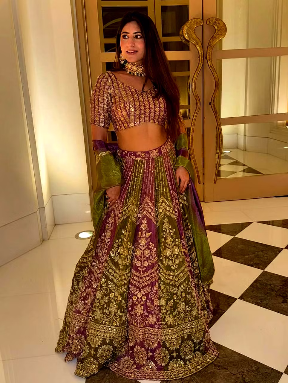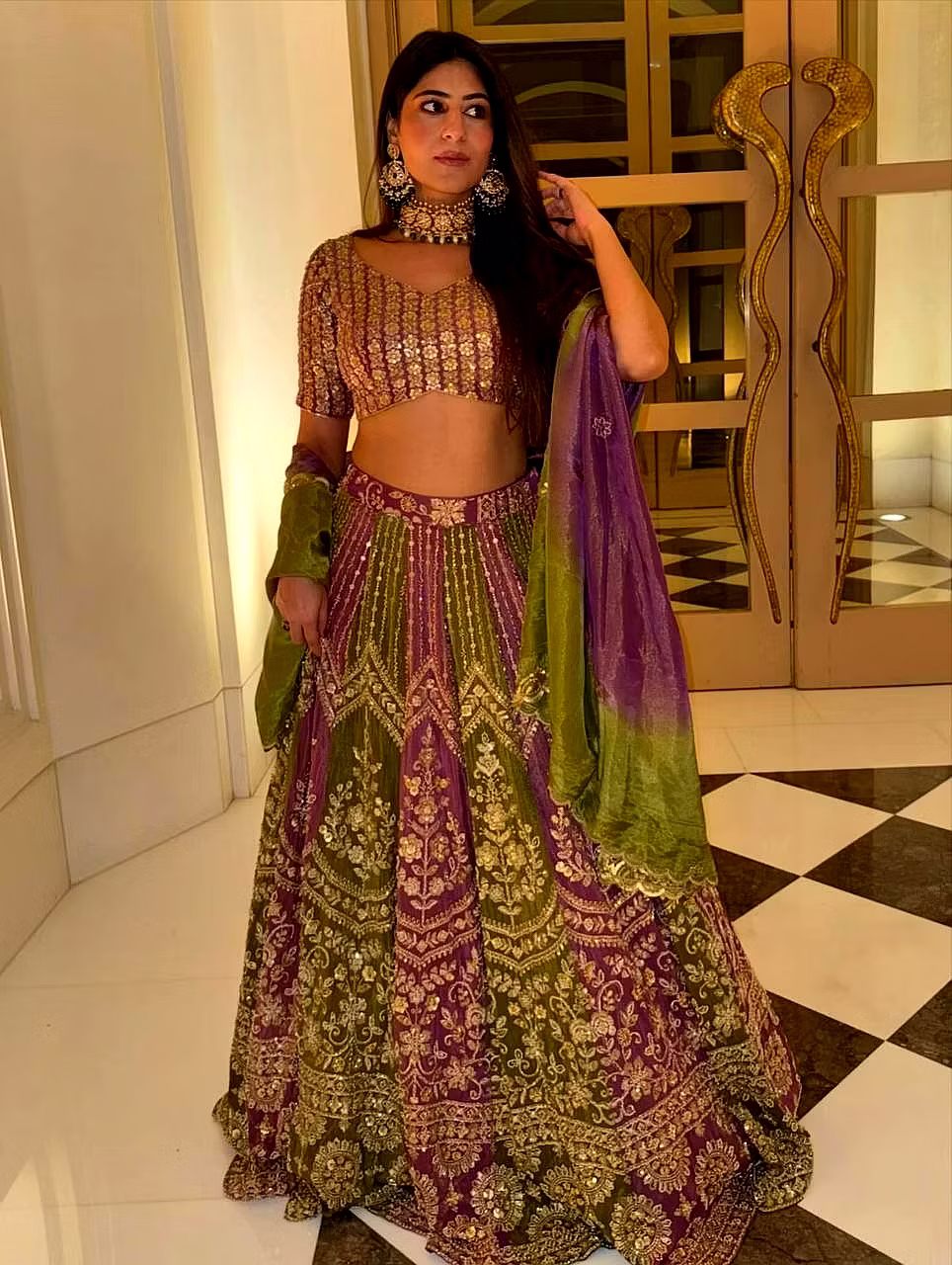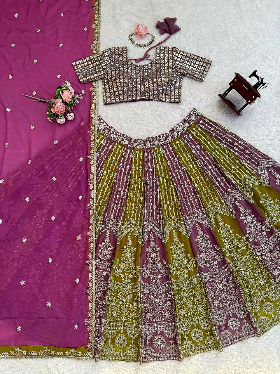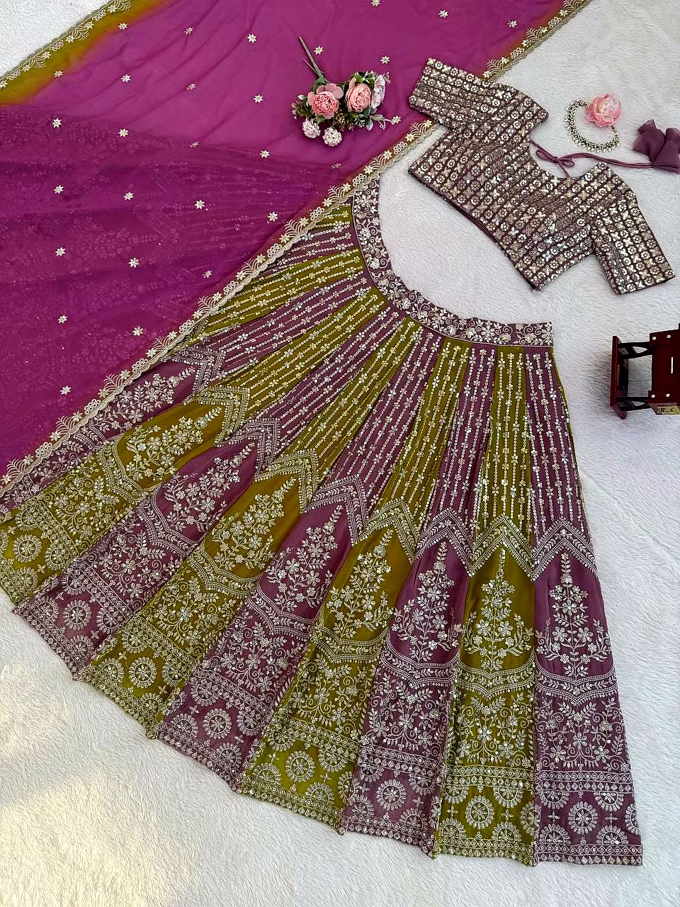 Elevate your ethnic wardrobe with the Olive Green and Purple Georgette Lehenga Choli with Dupatta featuring intricate golden embroidery and a regal color palette. Perfect for weddings, sangeet nights, and celebrations.