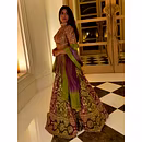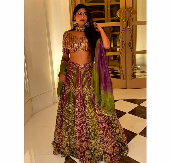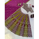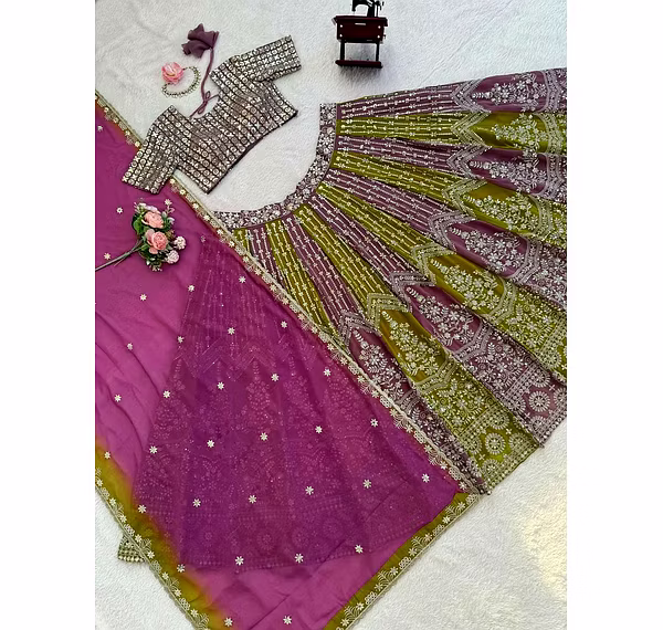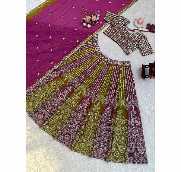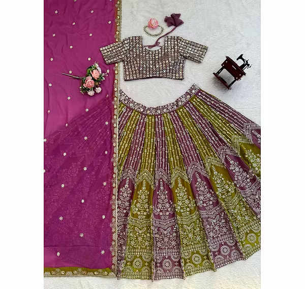 Indulge in the modern elegance of the Olive Green & Purple Georgette Lehenga Choli with Dupatta, a fusion of traditional artistry and contemporary glamour. The rich embroidery creates a royal look, perfect for special occasions.