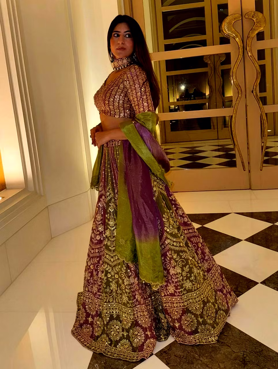 Designed for bridesmaids, fashion enthusiasts, and women seeking sophisticated ethnic wear, this ensemble captivates with its regal palette and shimmering details. The coordinated dupatta adds grace to every movement.