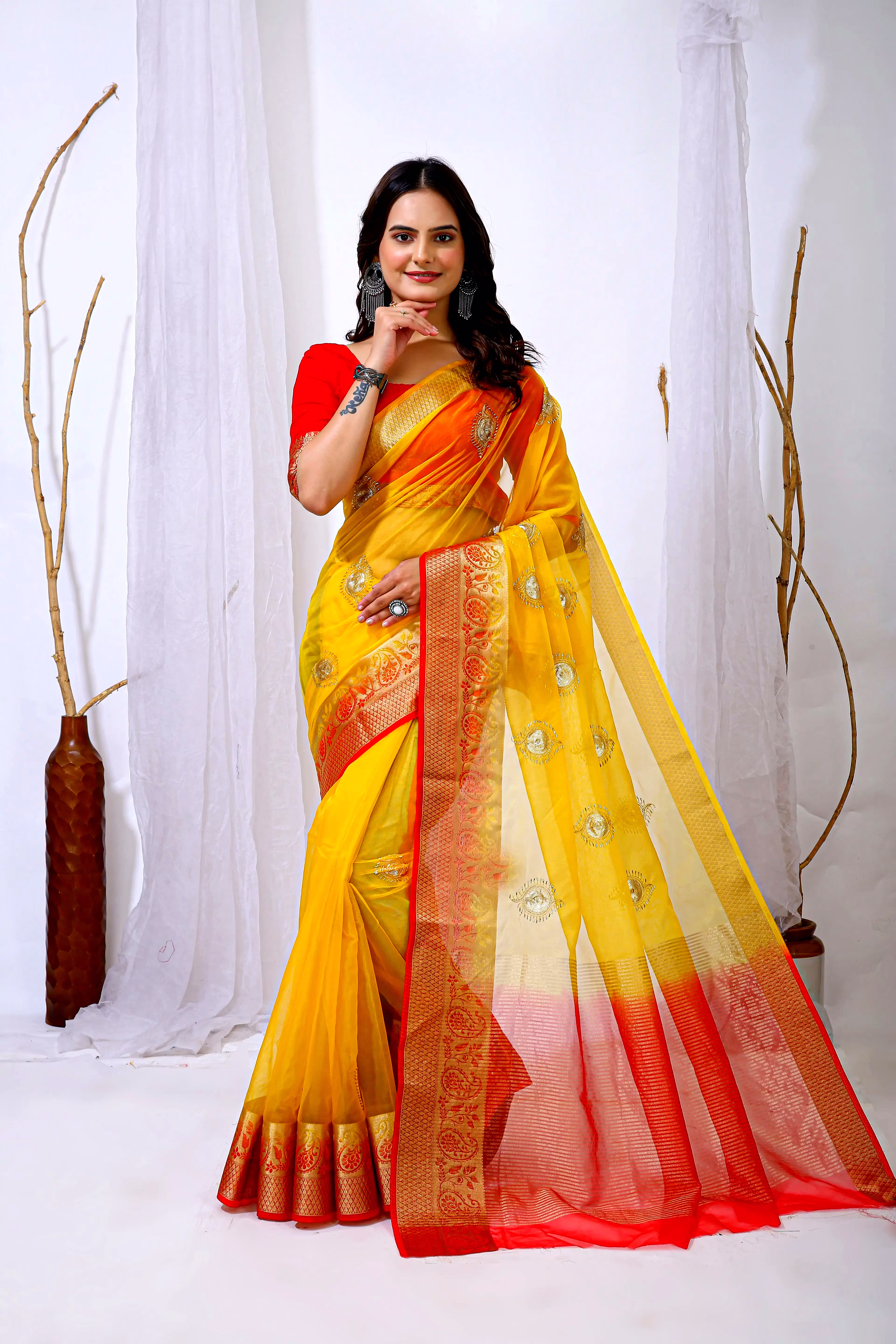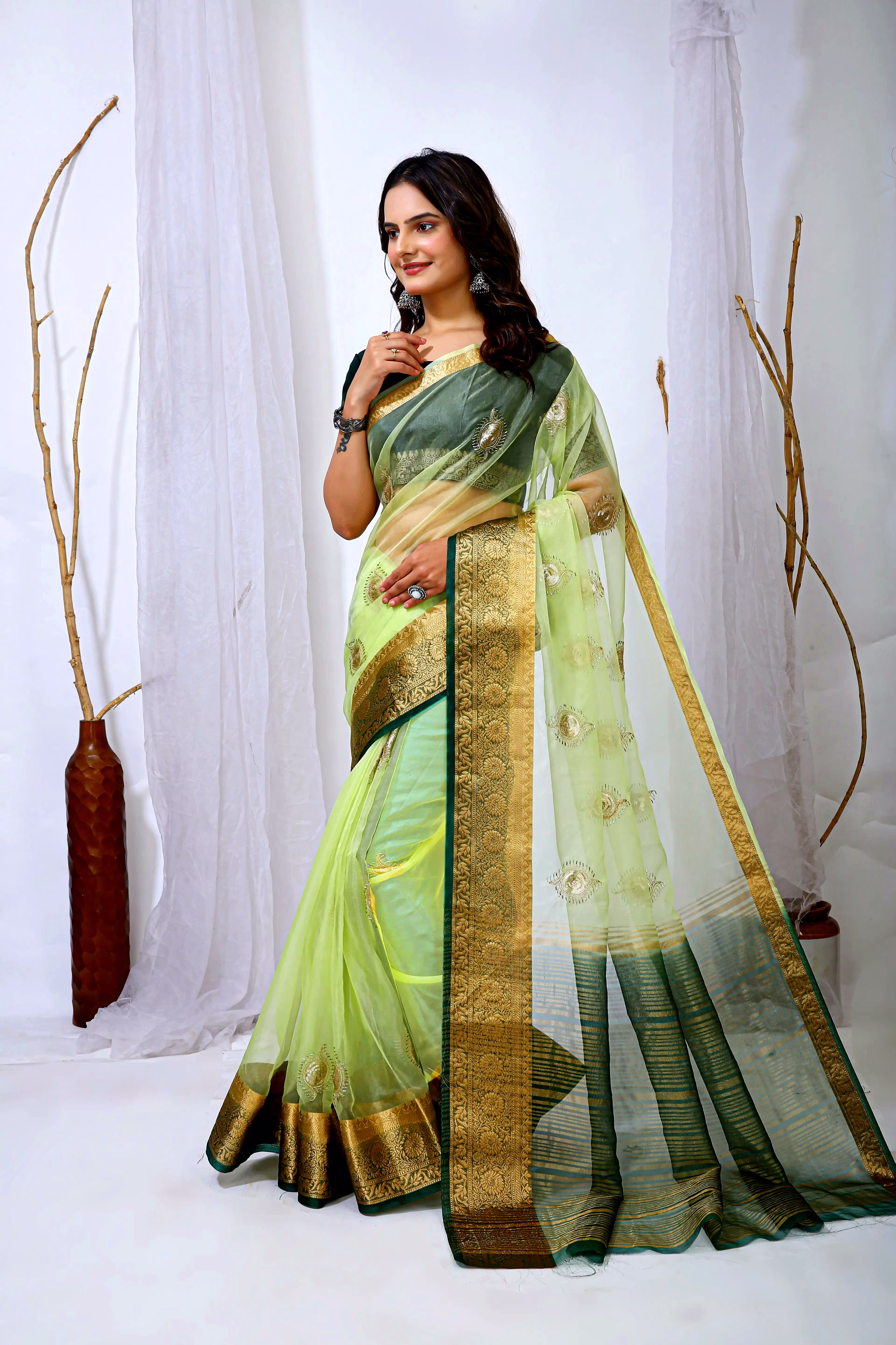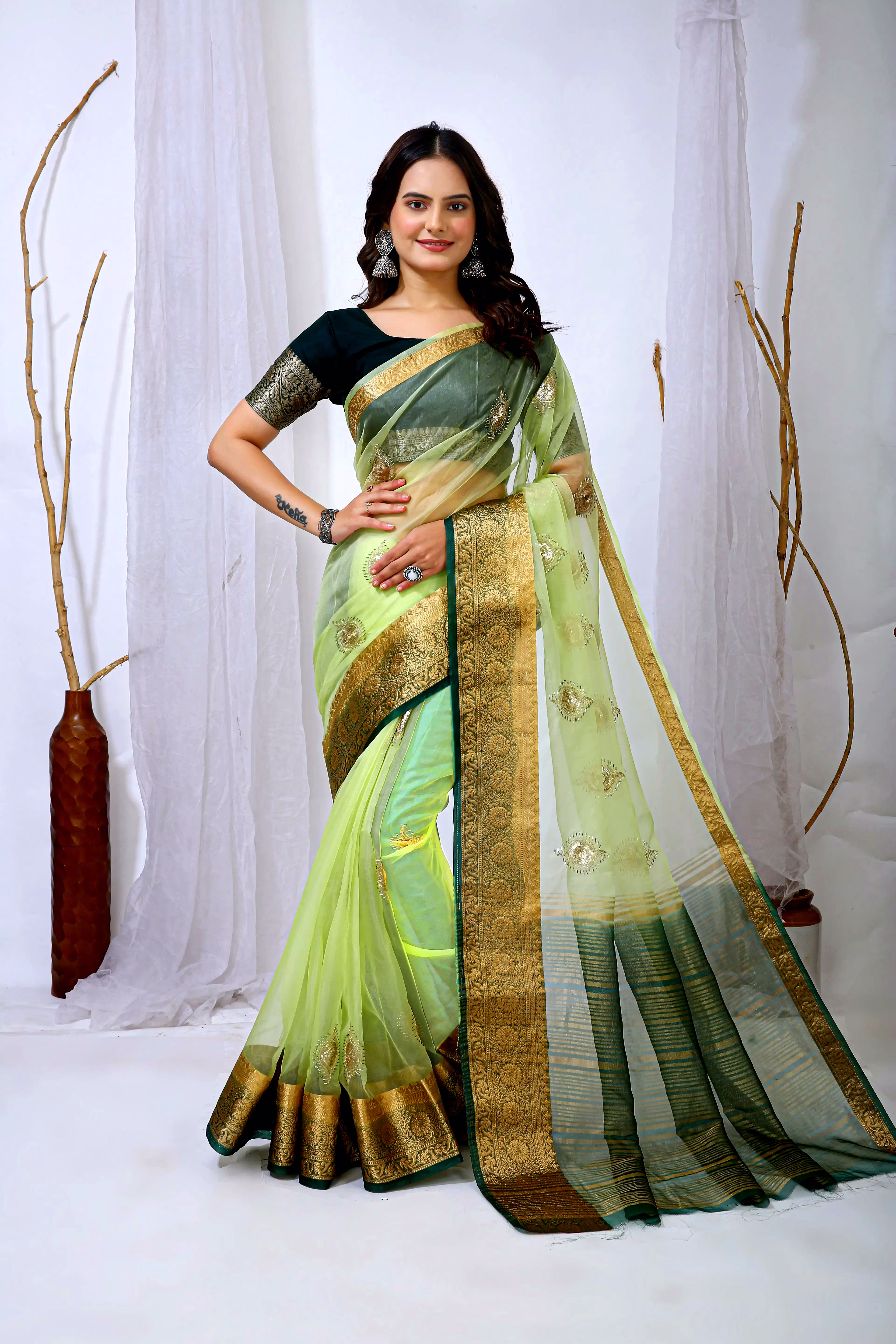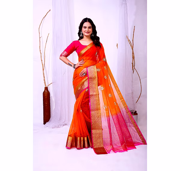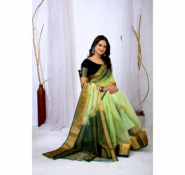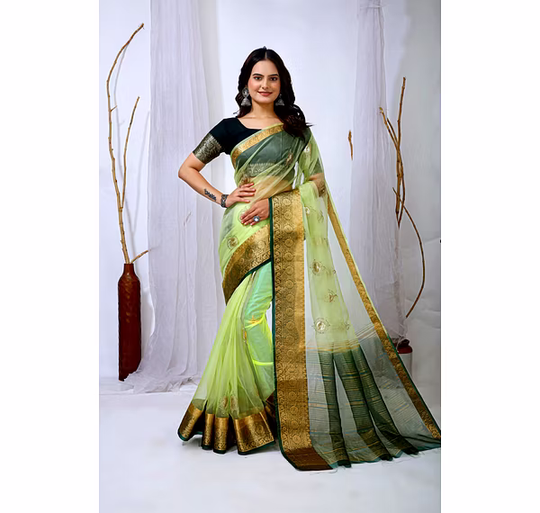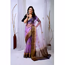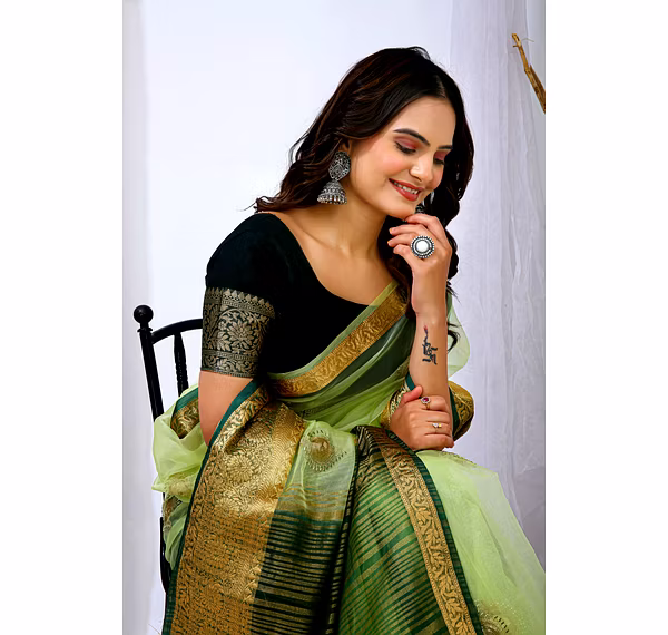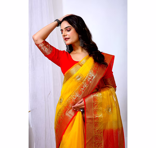Embrace the luxurious feel and ethereal look of our organza tissue silk saree, a perfect fusion of elegance and grace. Whether it's a festive celebration or a formal gathering, this saree is sure to make a statement.