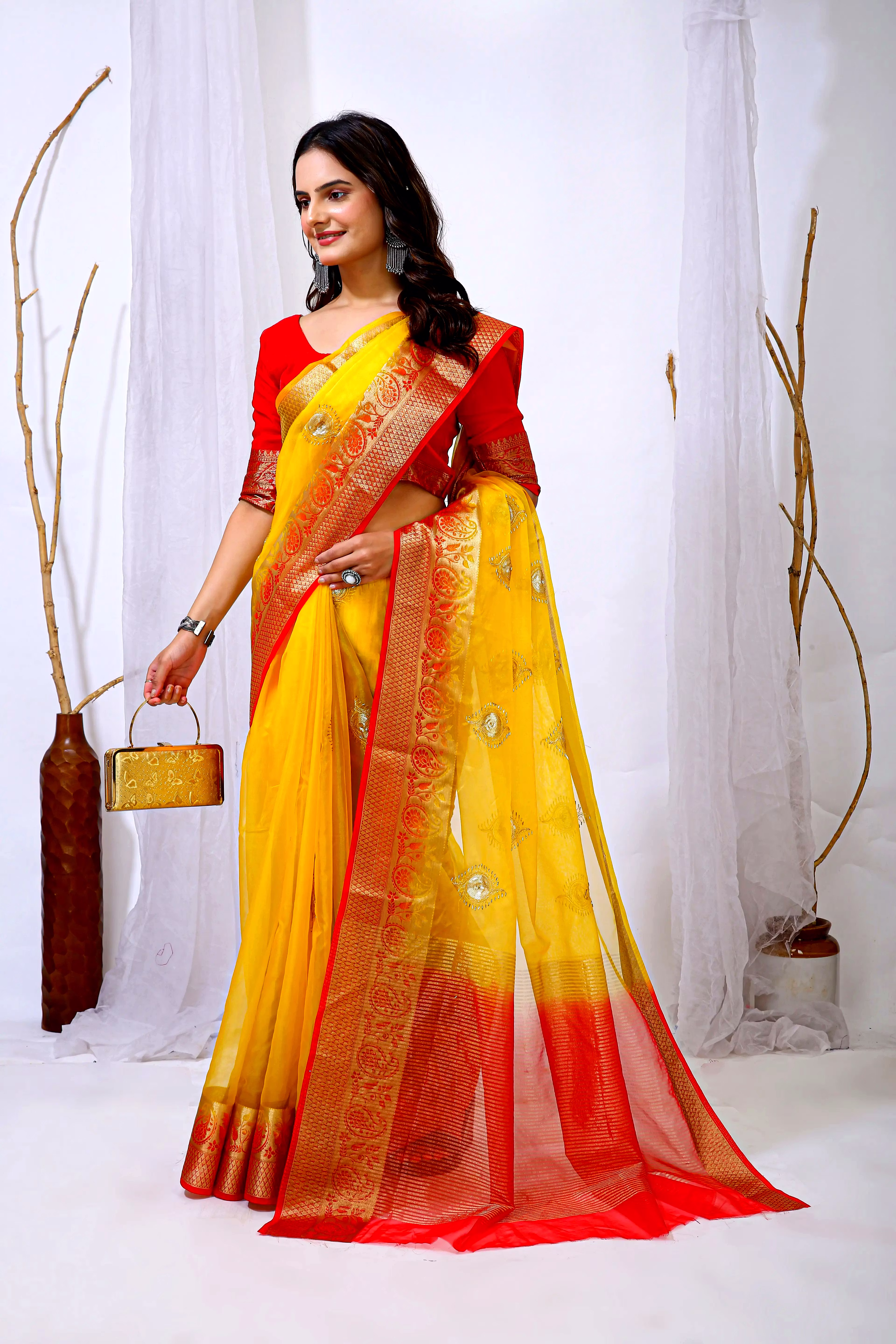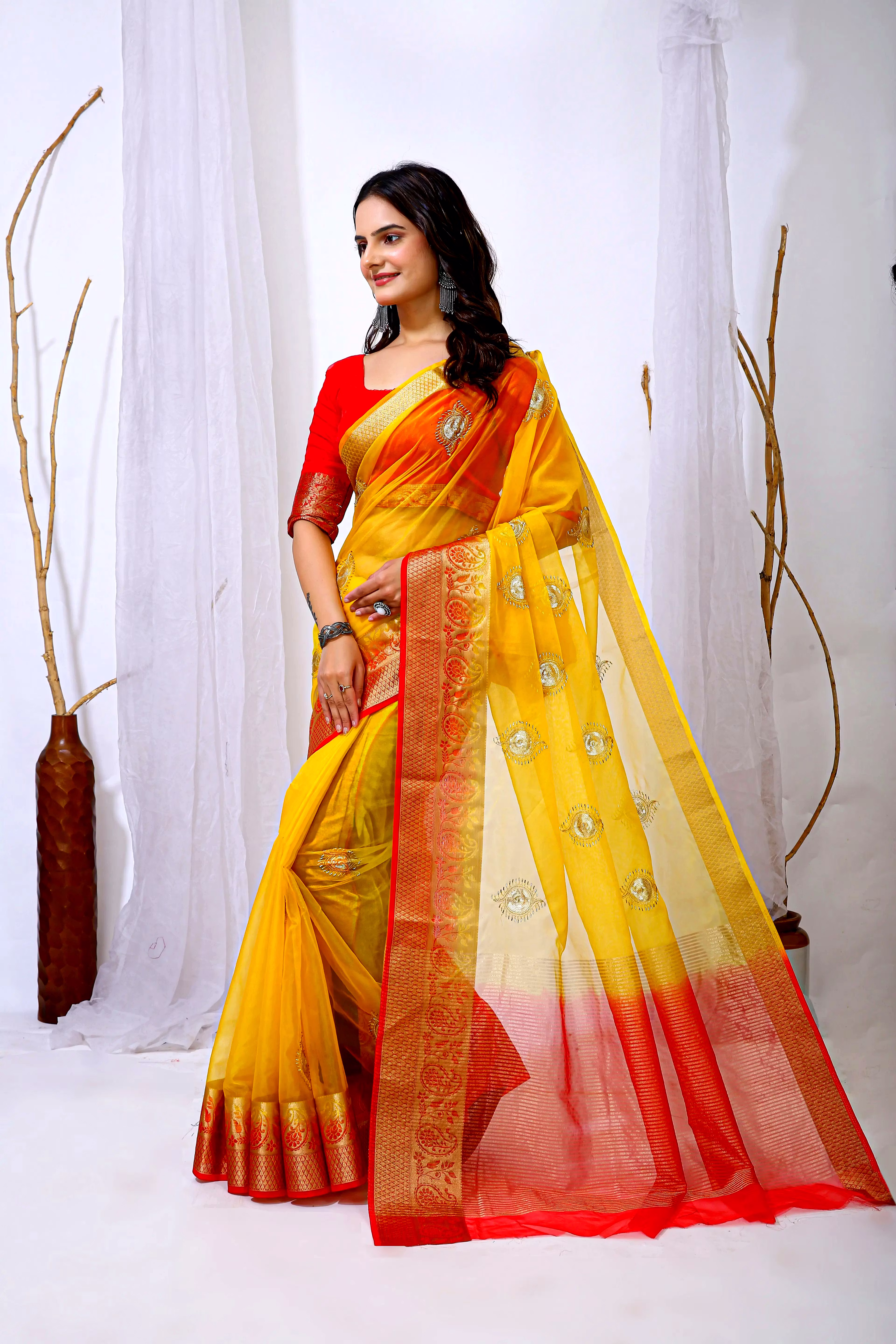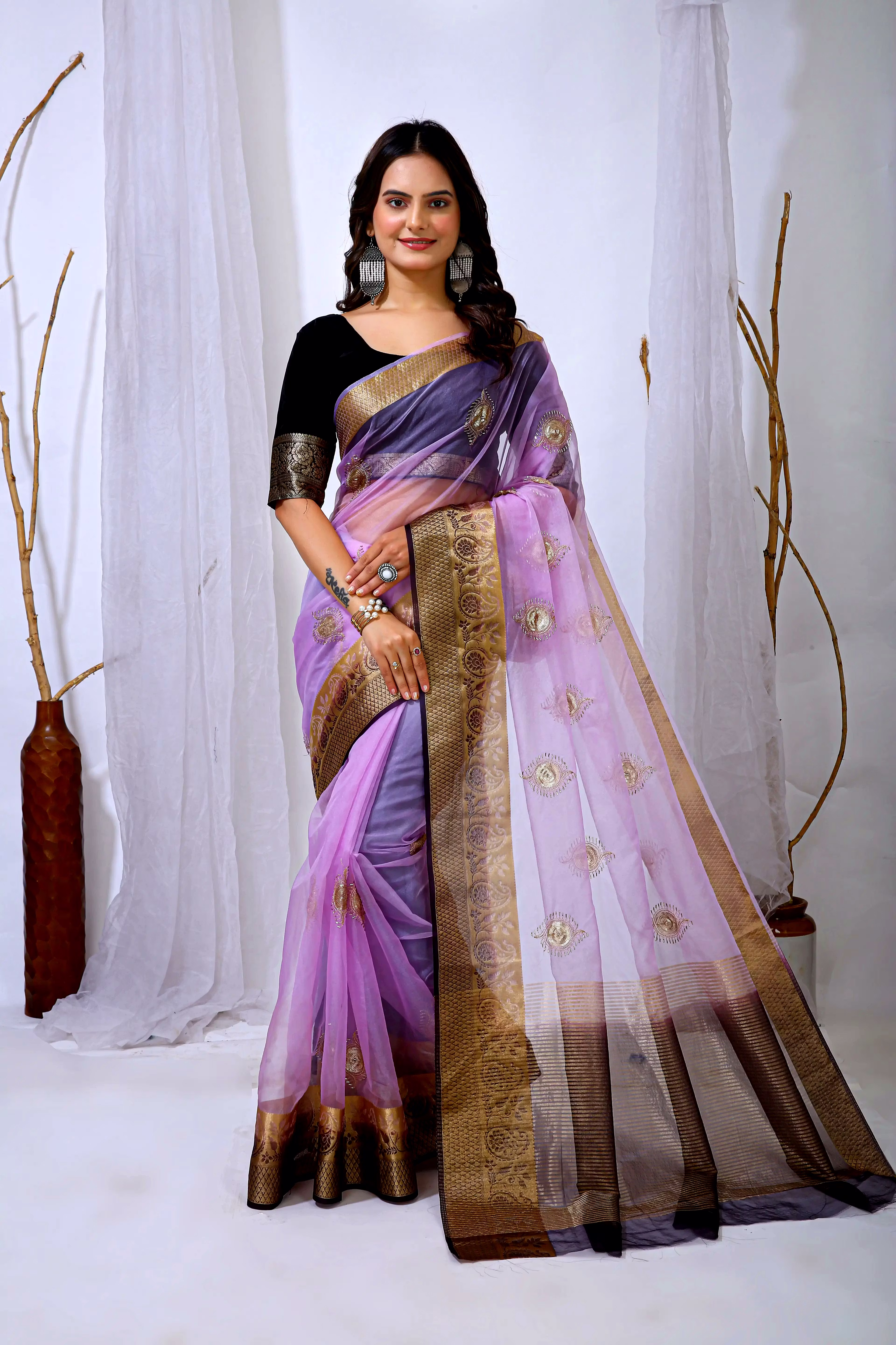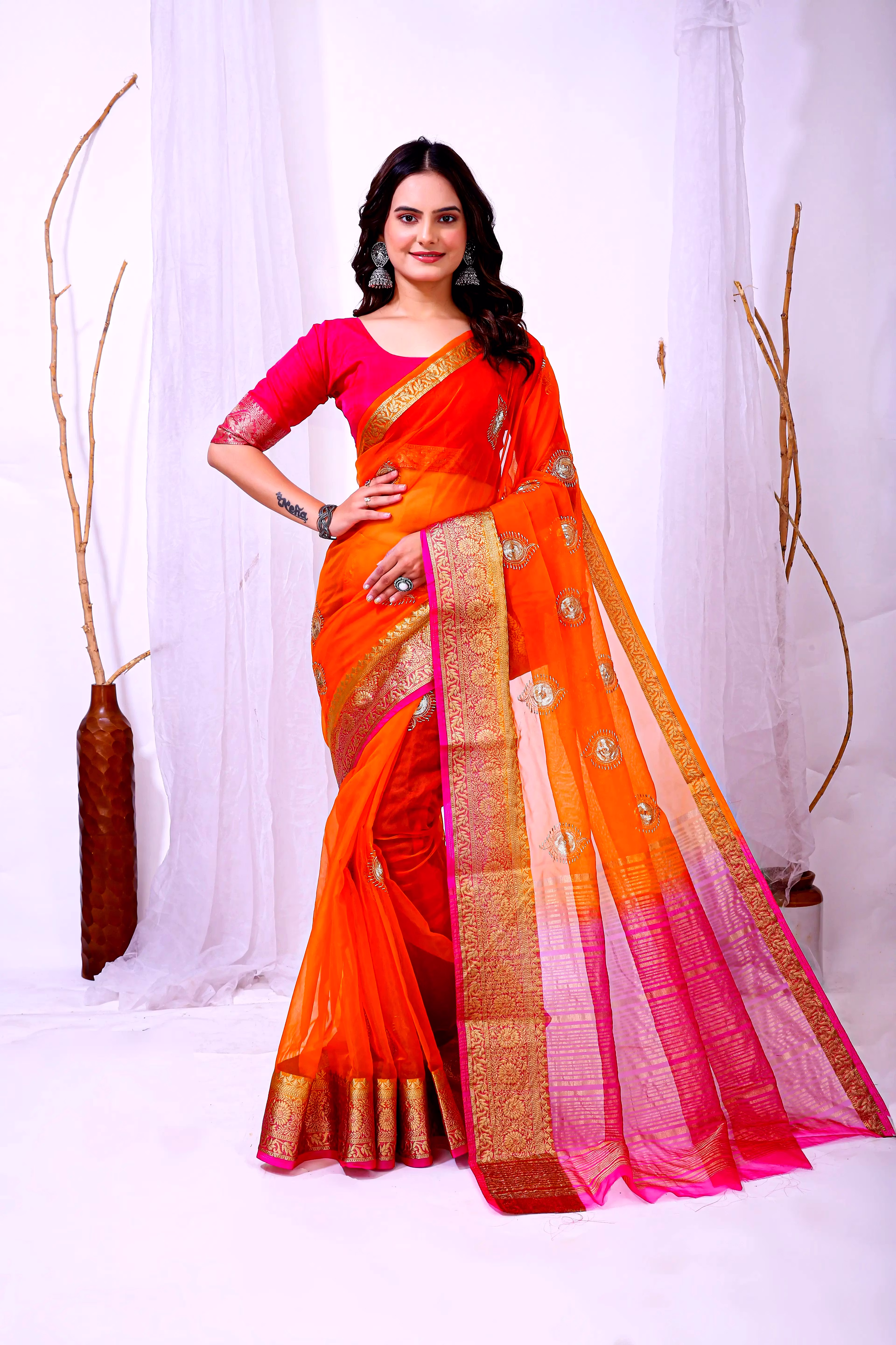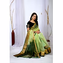 Embrace the luxurious feel and ethereal look of our organza tissue silk saree, a perfect fusion of elegance and grace. Whether it's a festive celebration or a formal gathering, this saree is sure to make a statement.