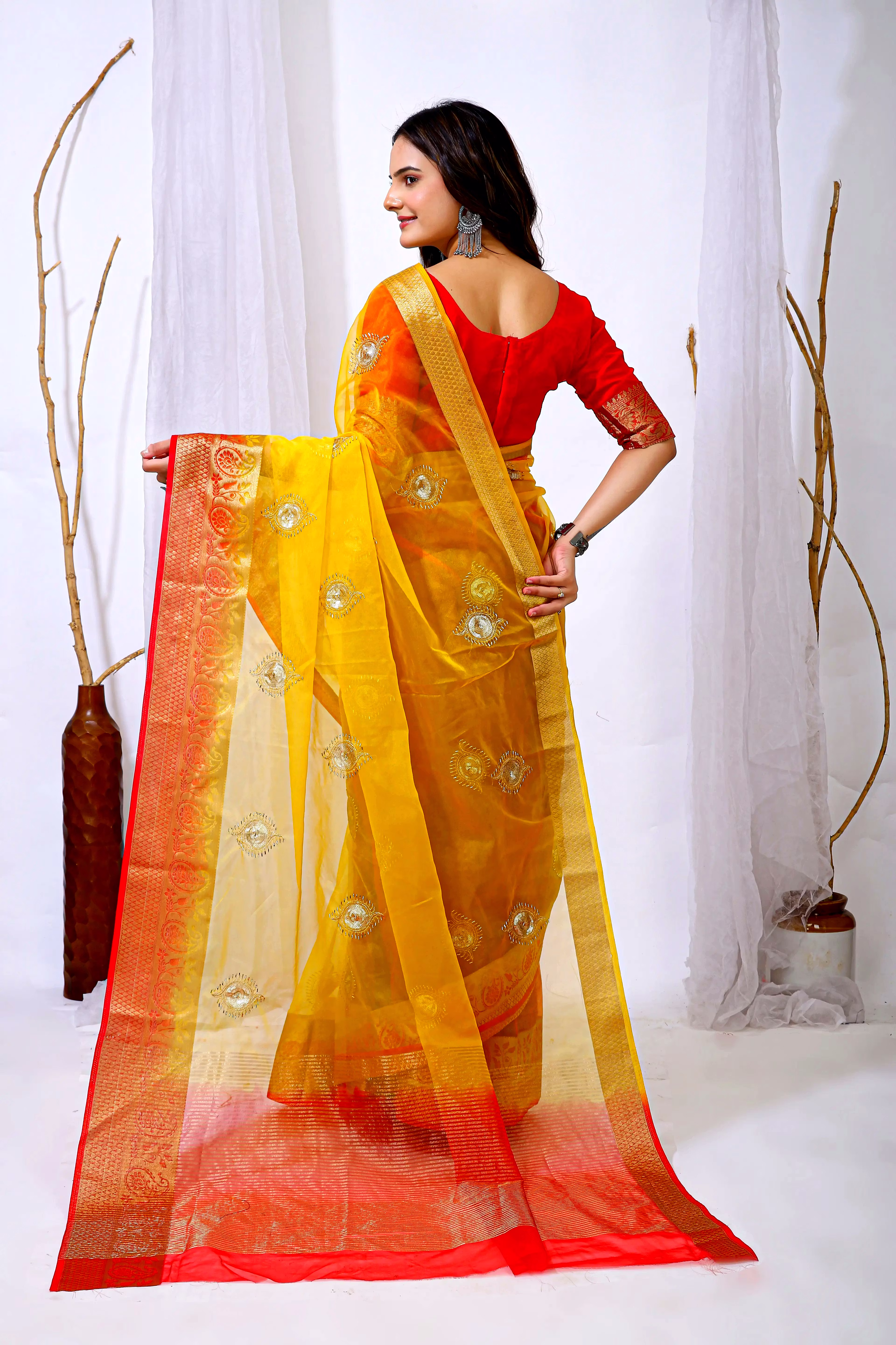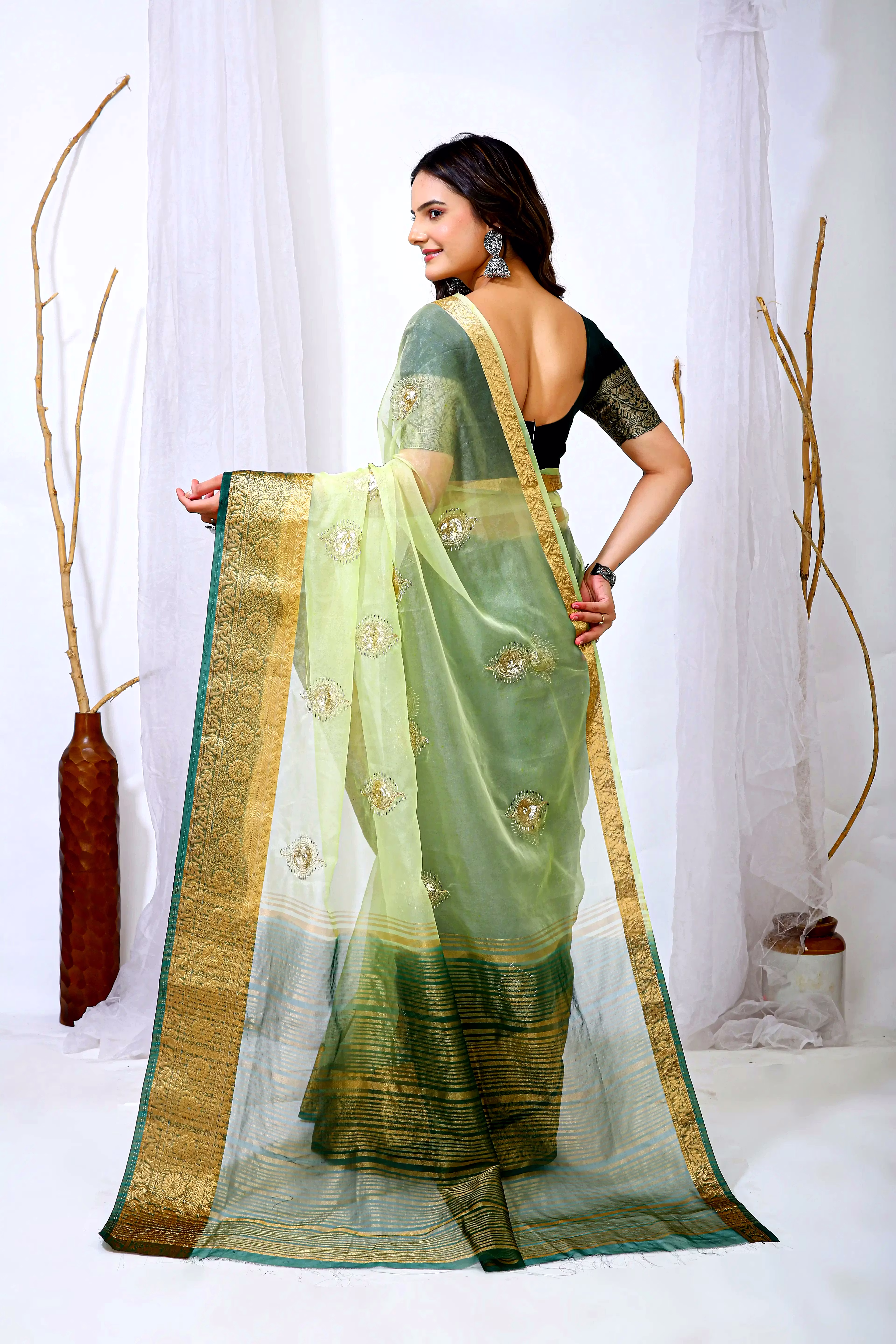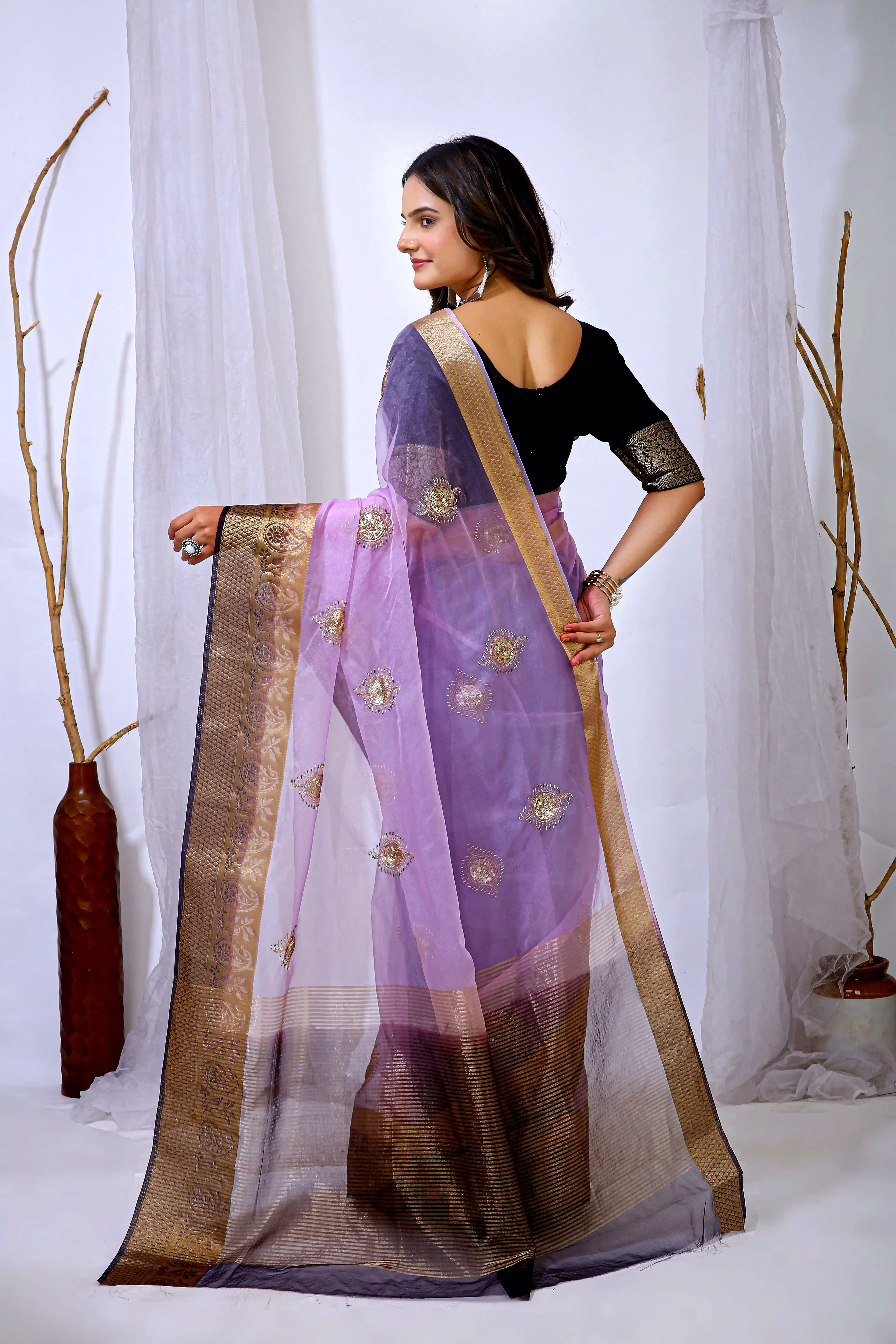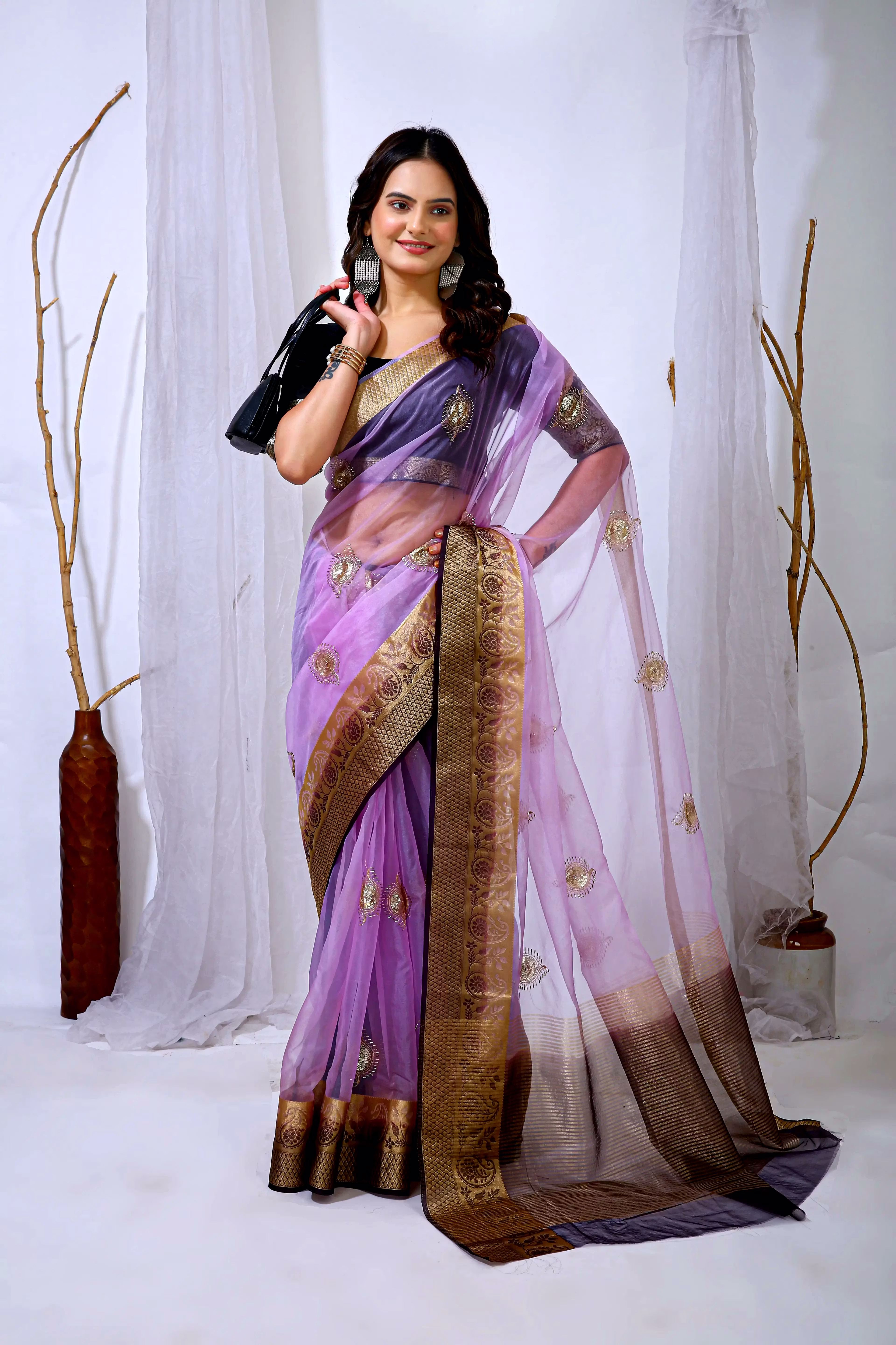 Embrace the luxurious feel and ethereal look of our organza tissue silk saree, a perfect fusion of elegance and grace. Whether it's a festive celebration or a formal gathering, this saree is sure to make a statement.