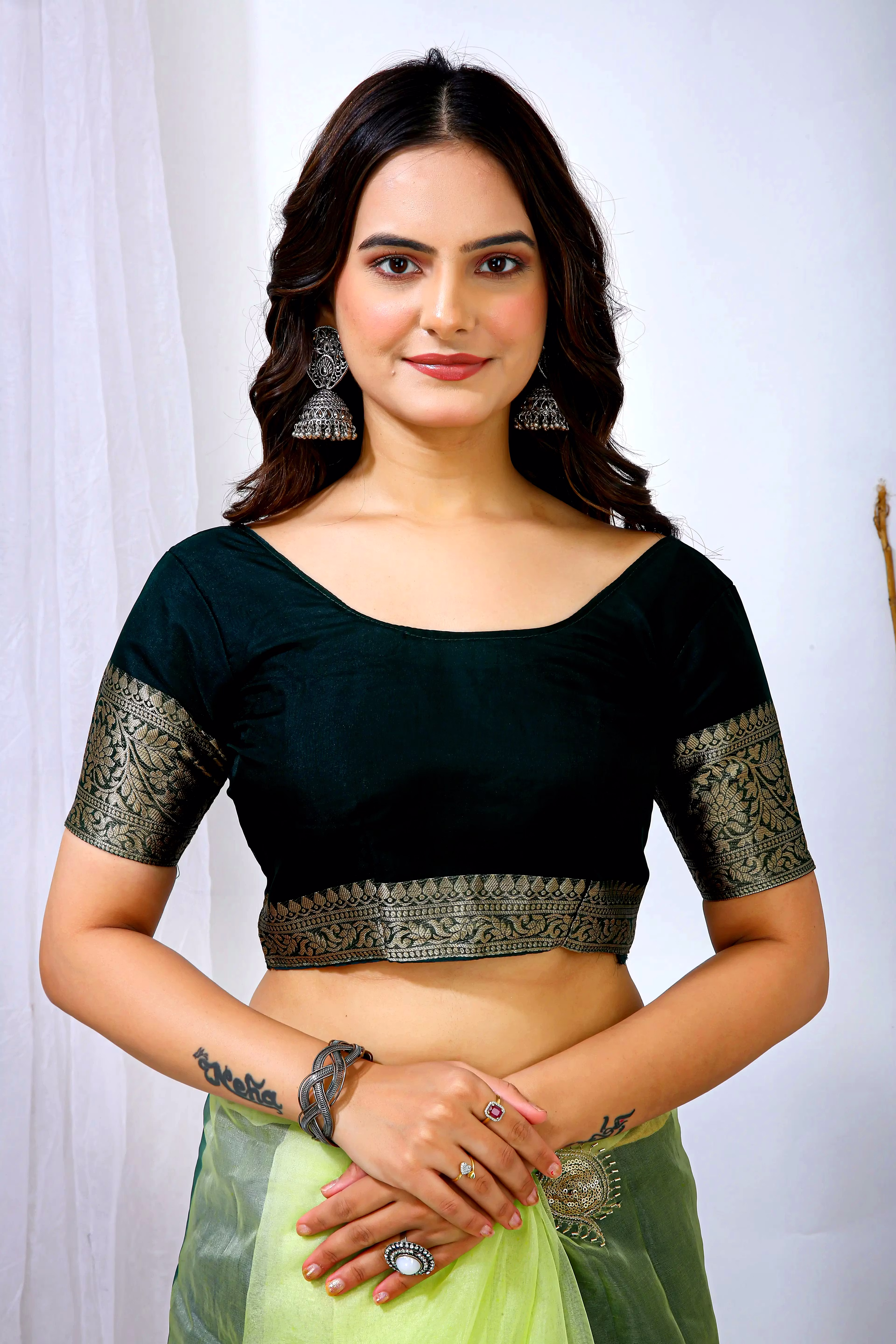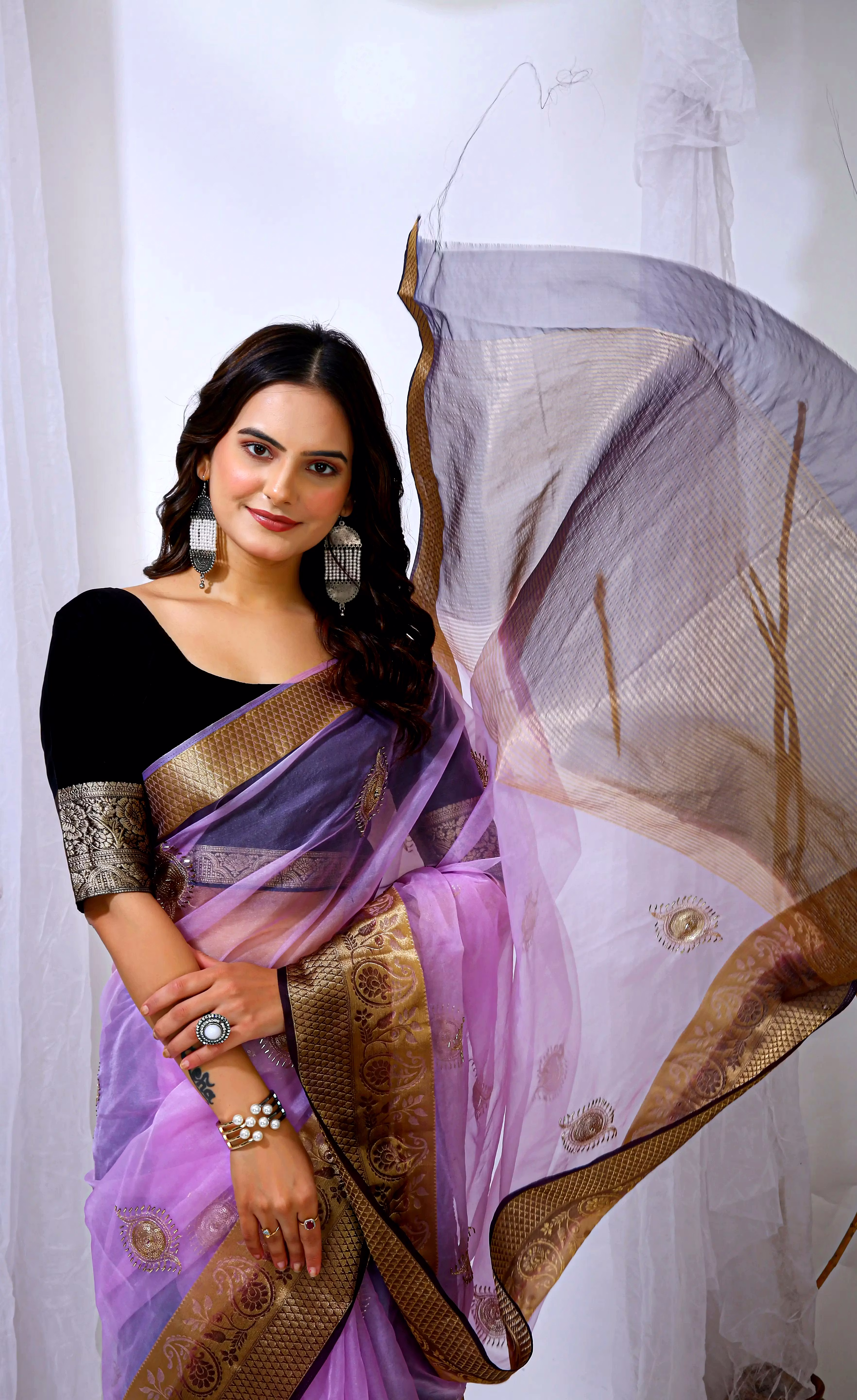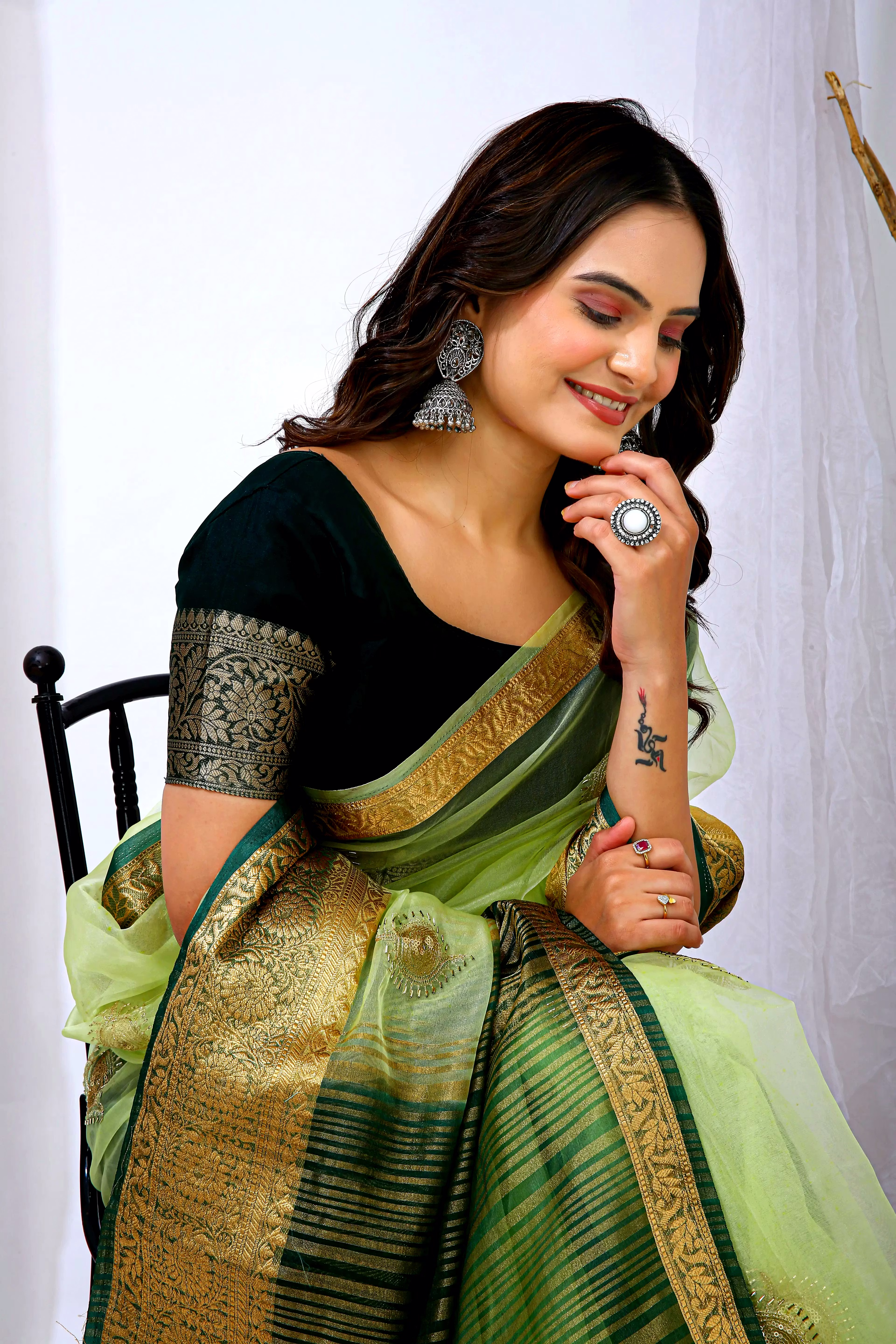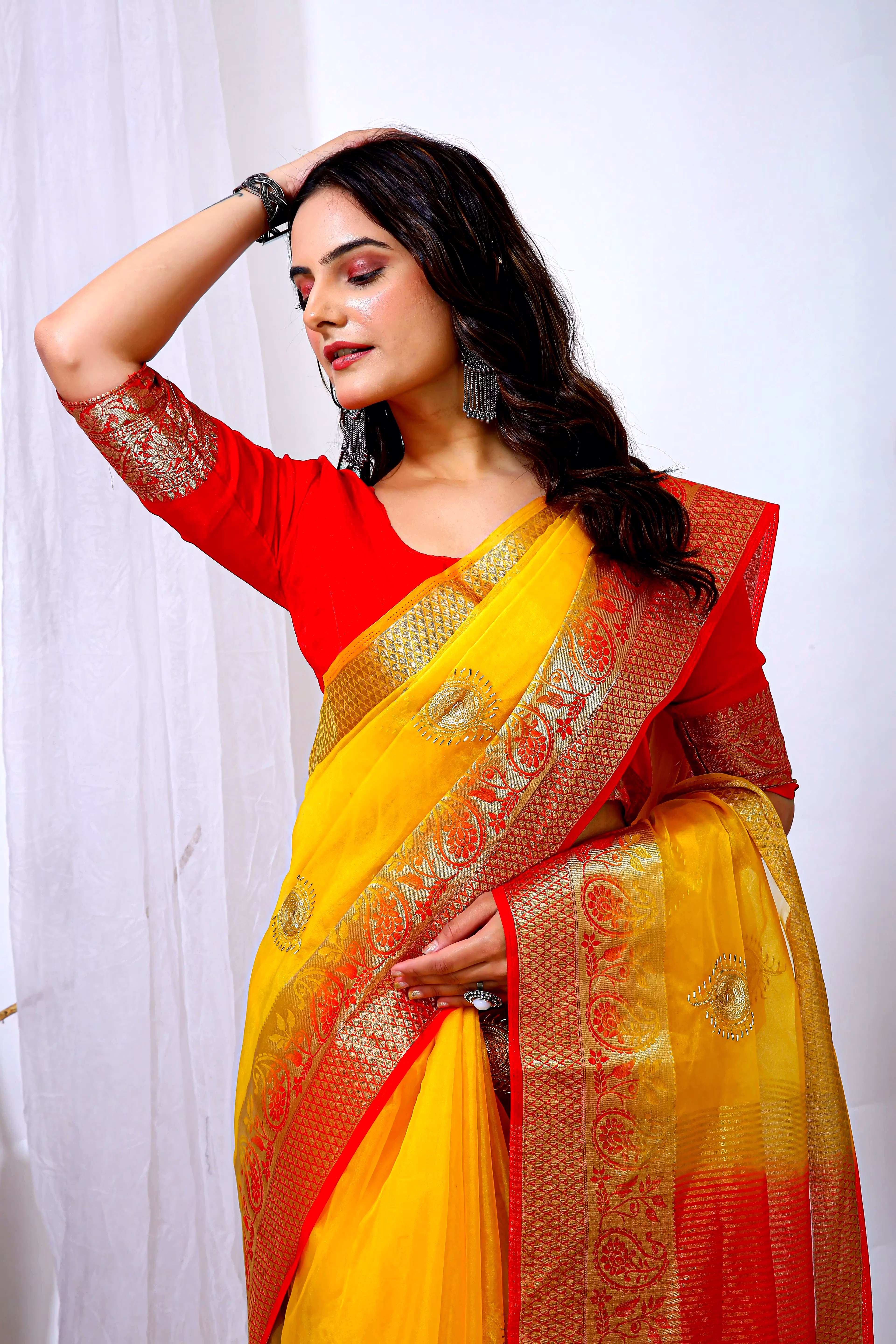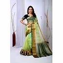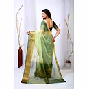Embrace the luxurious feel and ethereal look of our organza tissue silk saree, a perfect fusion of elegance and grace. Whether it's a festive celebration or a formal gathering, this saree is sure to make a statement.