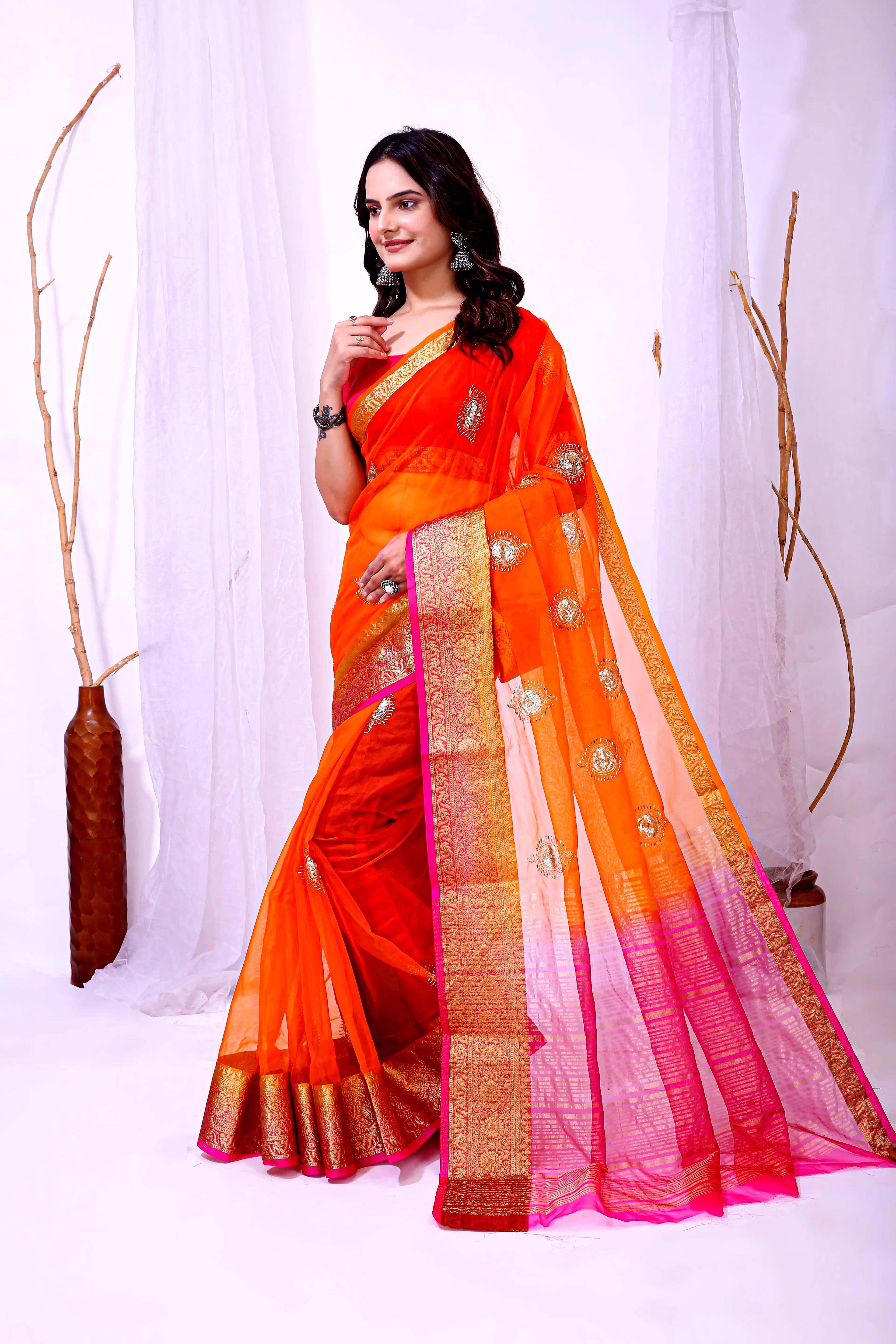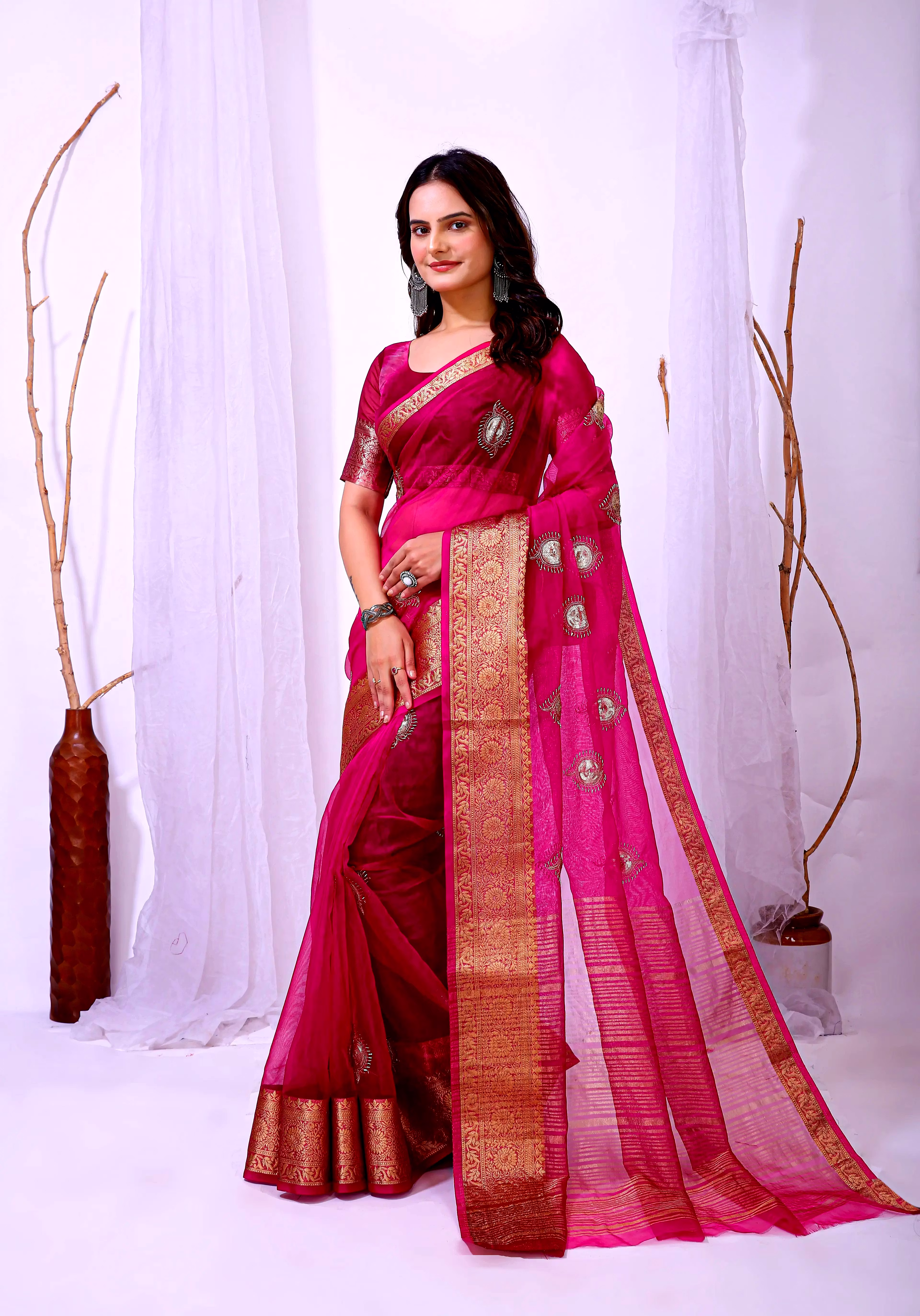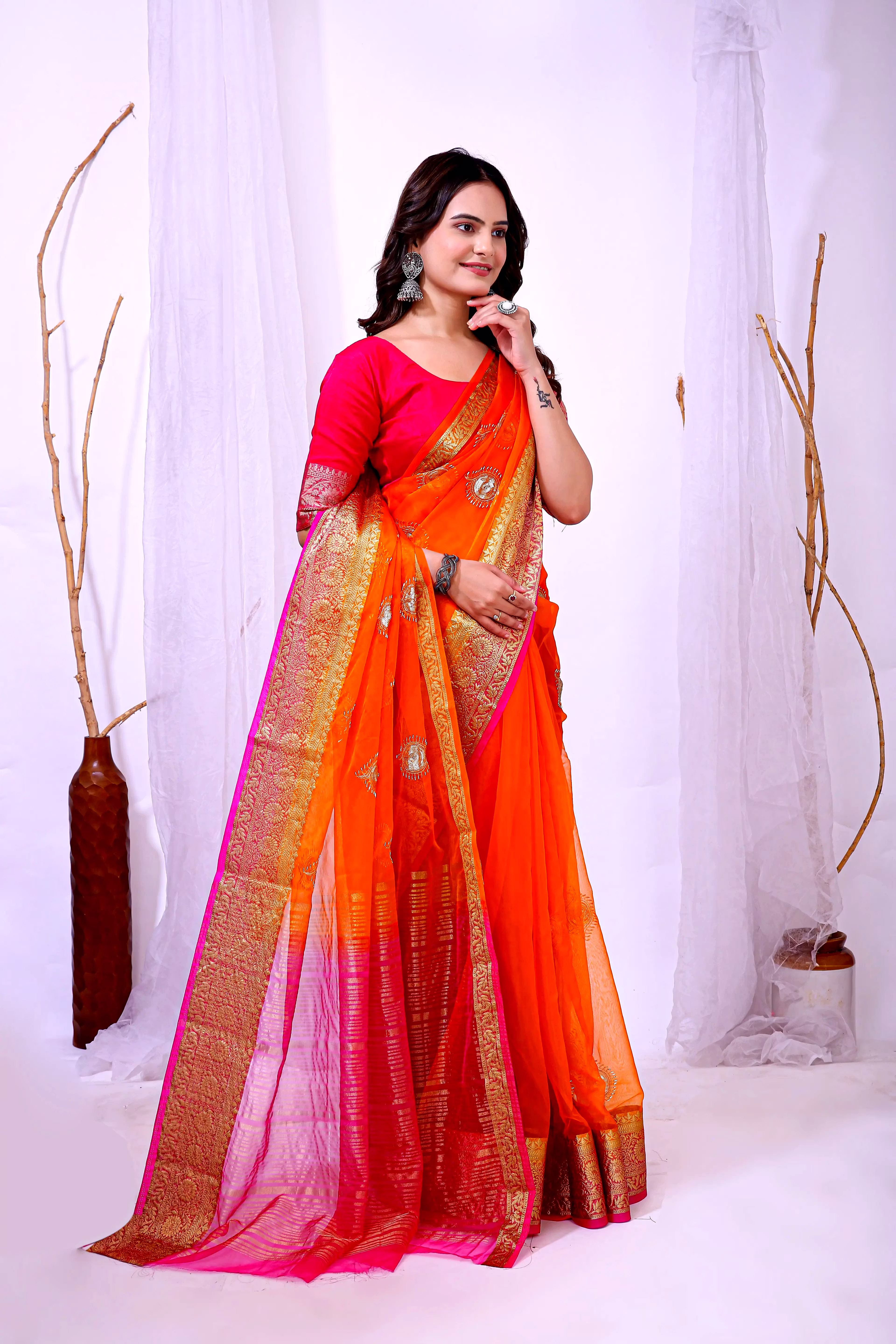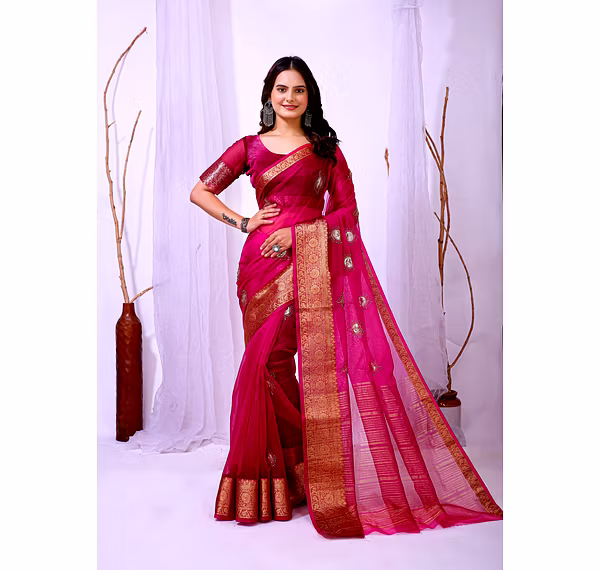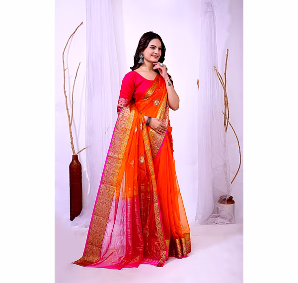 Elevate your ethnic attire with our stunning Organza Saree with Embroidery, a blend of traditional charm and modern elegance. Crafted with premium organza silk fabric, this saree is a perfect choice for special occasions.