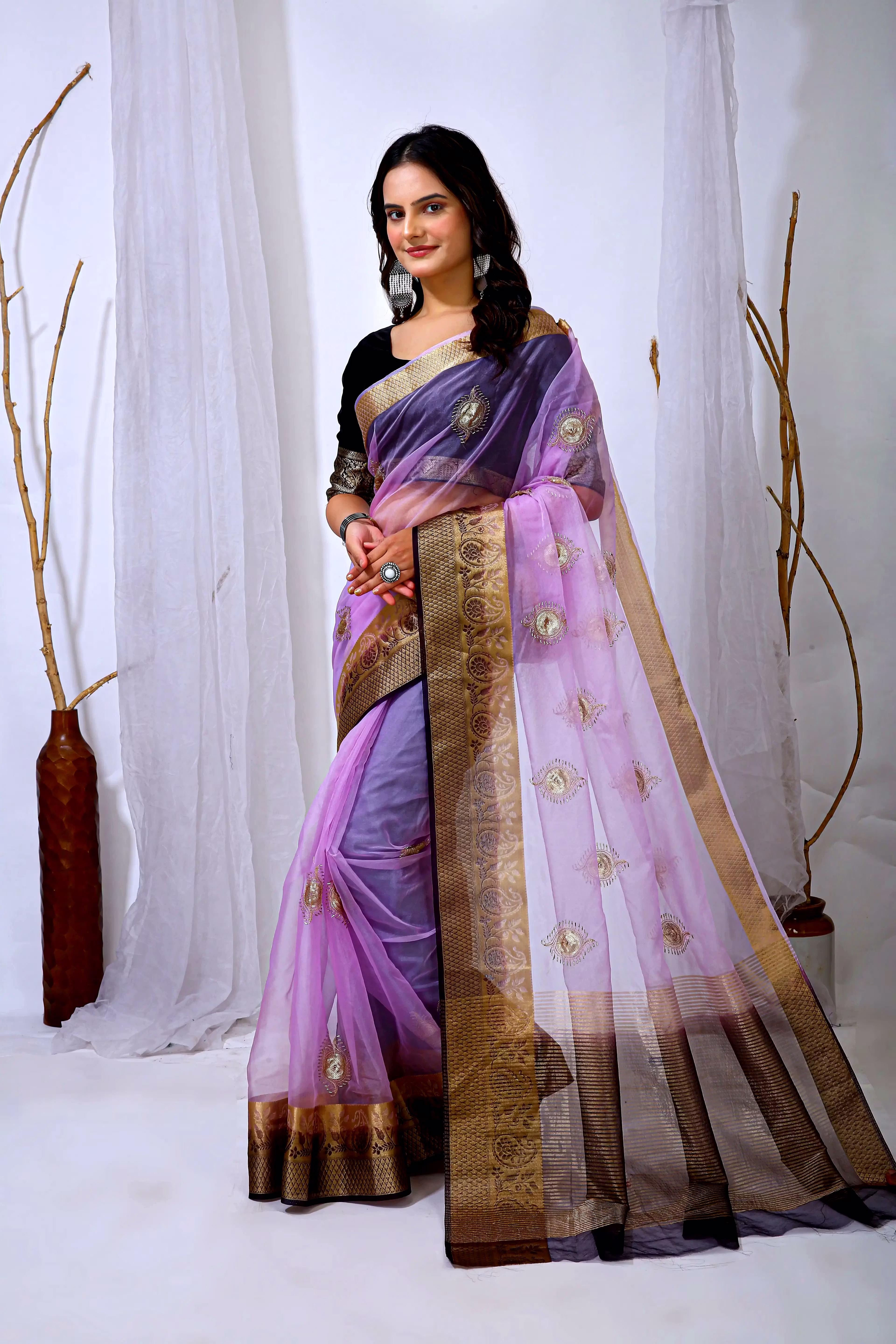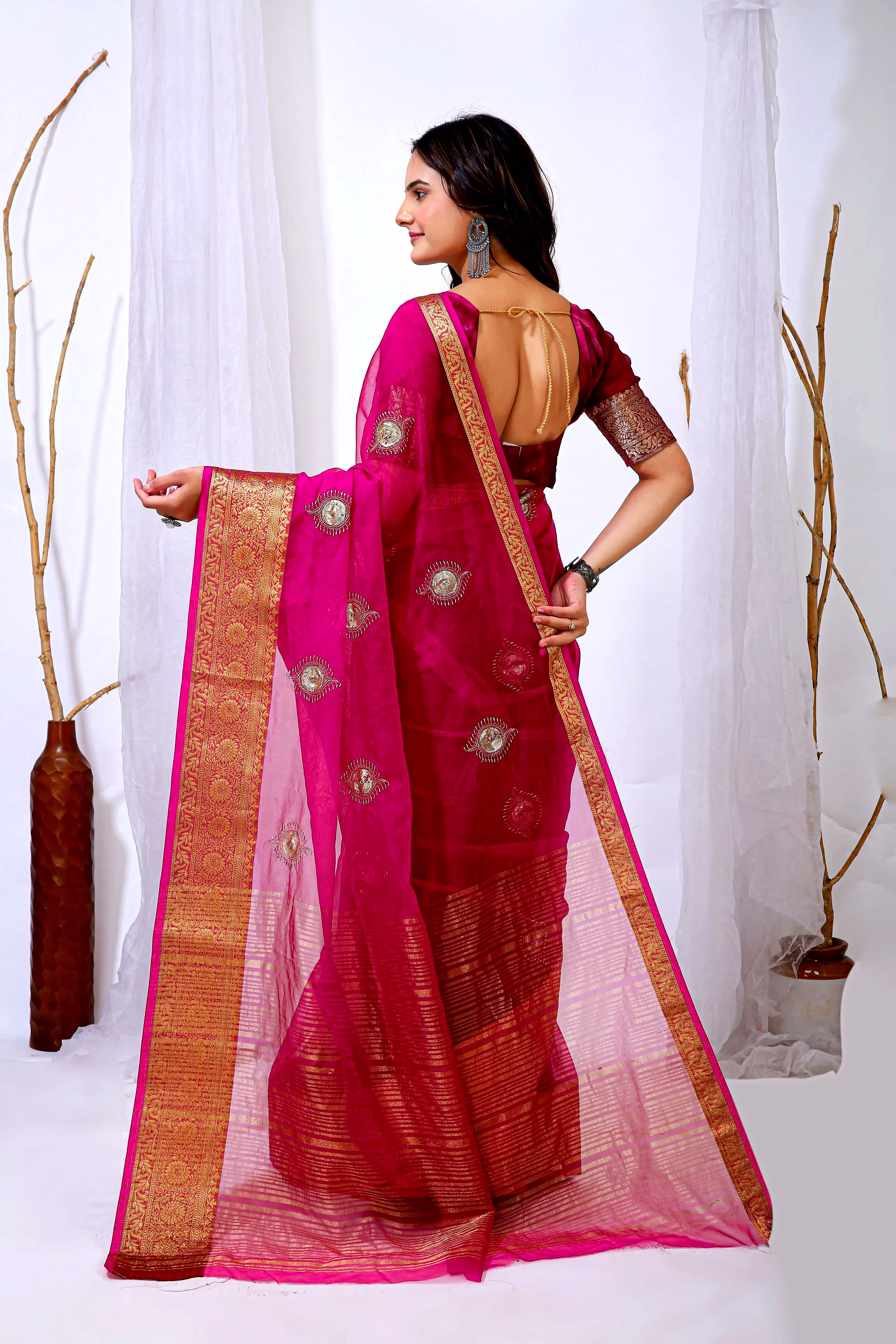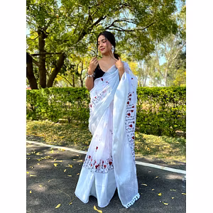 Indulge in the sheer beauty of our organza saree with intricate embroidery, designed to make you stand out at any event. The lightweight and flowing organza fabric drapes gracefully, adding a touch of sophistication to your ensemble.