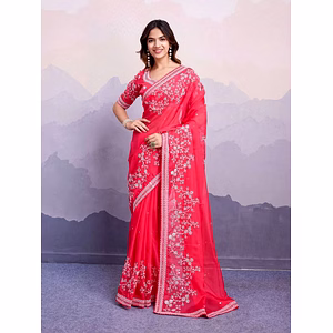 Introducing our exquisite Saree, crafted with utmost care and attention to detail. This stunning piece is designed to make you stand out and feel confident on any occasion. Made from light-weight organza silk, this Saree offers a luxurious and comfortable feel. The fabric drapes elegantly, enhancing your natural beauty and giving you a graceful silhouette. The standout feature of this Saree is the meticulous work done with 3mm sequins and cotton thread embroidery. The intricate designs and patterns created with these embellishments add a touch of glamour and sophistication to the overall look. The cut work border further accentuates the beauty of the embroidery, elevating the design to a whole new level. In addition to the Saree, the package includes a mono banglory blouse. The blouse features full embroidery on the front side, adding a touch of elegance and charm to the ensemble. Please note that the blouse is unstitched, allowing you the freedom to customize it to your preference. This Saree is more than just a piece of clothing; it is a work of art that showcases your unique style and personality. Whether you're attending a wedding, a festive celebration, or any special event, this Saree will make you the center of attention. Embrace the beauty and grace of our Saree. With its exceptional craftsmanship, luxurious fabric, and intricate embroidery, it is a true testament to the fine art of Indian fashion. Elevate your wardrobe with this timeless piece. Order our Saree today and experience the allure of traditional Indian fashion like never before.