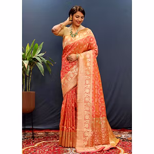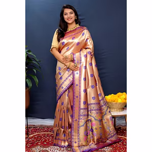 Introducing the Paithani Silk Saree, a true embodiment of elegance, luxury, and craftsmanship. Made from pure silk with exquisite gold Jari embellishments, this saree is a timeless masterpiece that will leave you mesmerized. Crafted with utmost care and precision, each Paithani Silk Saree reflects the rich heritage and cultural heritage of India. The intricate gold Jari work adds a touch of opulence and grandeur, making it perfect for special occasions and celebrations. The key feature of this saree is its pure silk fabric, which not only feels incredibly soft against your skin but also drapes flawlessly, accentuating your curves and adding a touch of grace to your silhouette. The luxurious texture of silk exudes a sense of luxury and sophistication, setting you apart from the crowd. But the Paithani Silk Saree is not just about its stunning aesthetics. Its unique selling point lies in its versatility and adaptability. Whether you're attending a wedding, a traditional event, or a festive celebration, this saree will effortlessly elevate your style and make you the center of attention. In addition to its enchanting beauty, this saree offers numerous benefits. Its lightweight and breathable fabric ensure maximum comfort, allowing you to move with ease throughout the day. The gold Jari embellishments are meticulously woven, ensuring their durability and long-lasting shine. Investing in a Paithani Silk Saree is not just purchasing a piece of clothing; it is embracing a rich cultural legacy and owning a symbol of timeless beauty. With its exceptional quality, craftsmanship, and attention to detail, this saree is a true heirloom that can be passed down from one generation to another. Indulge yourself in the sheer luxury and elegance of the Paithani Silk Saree. With its unparalleled beauty, versatility, and superior craftsmanship, this saree is a must-have for every woman who appreciates the finer things in life. Experience the allure of pure silk and the radiance of gold Jari, and make a statement that will be remembered for years to come.