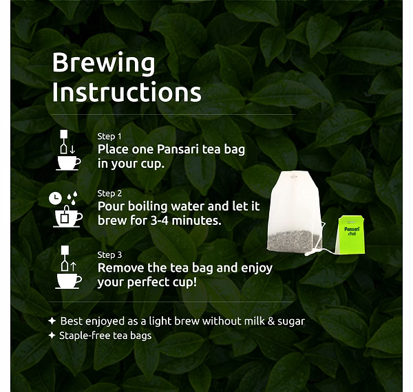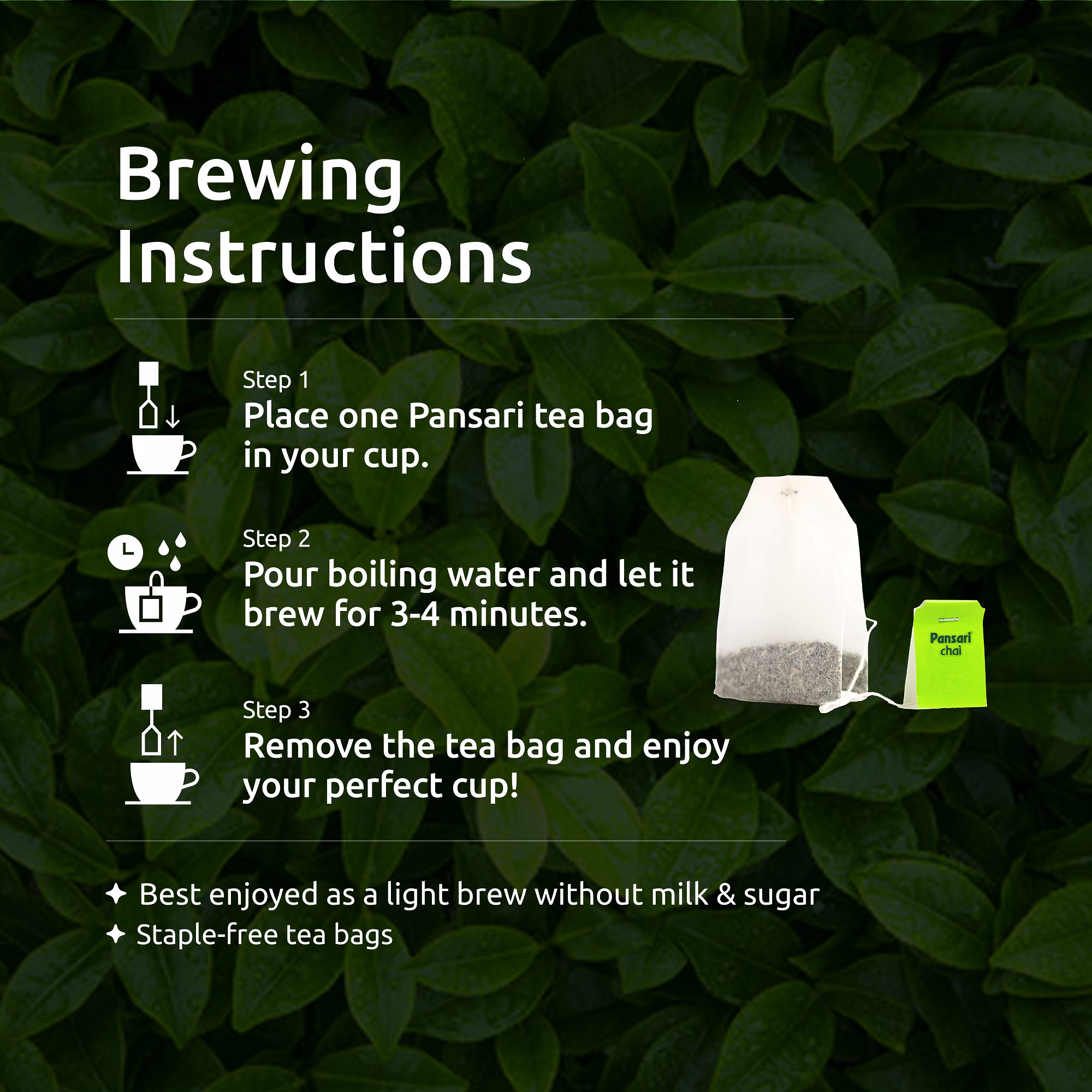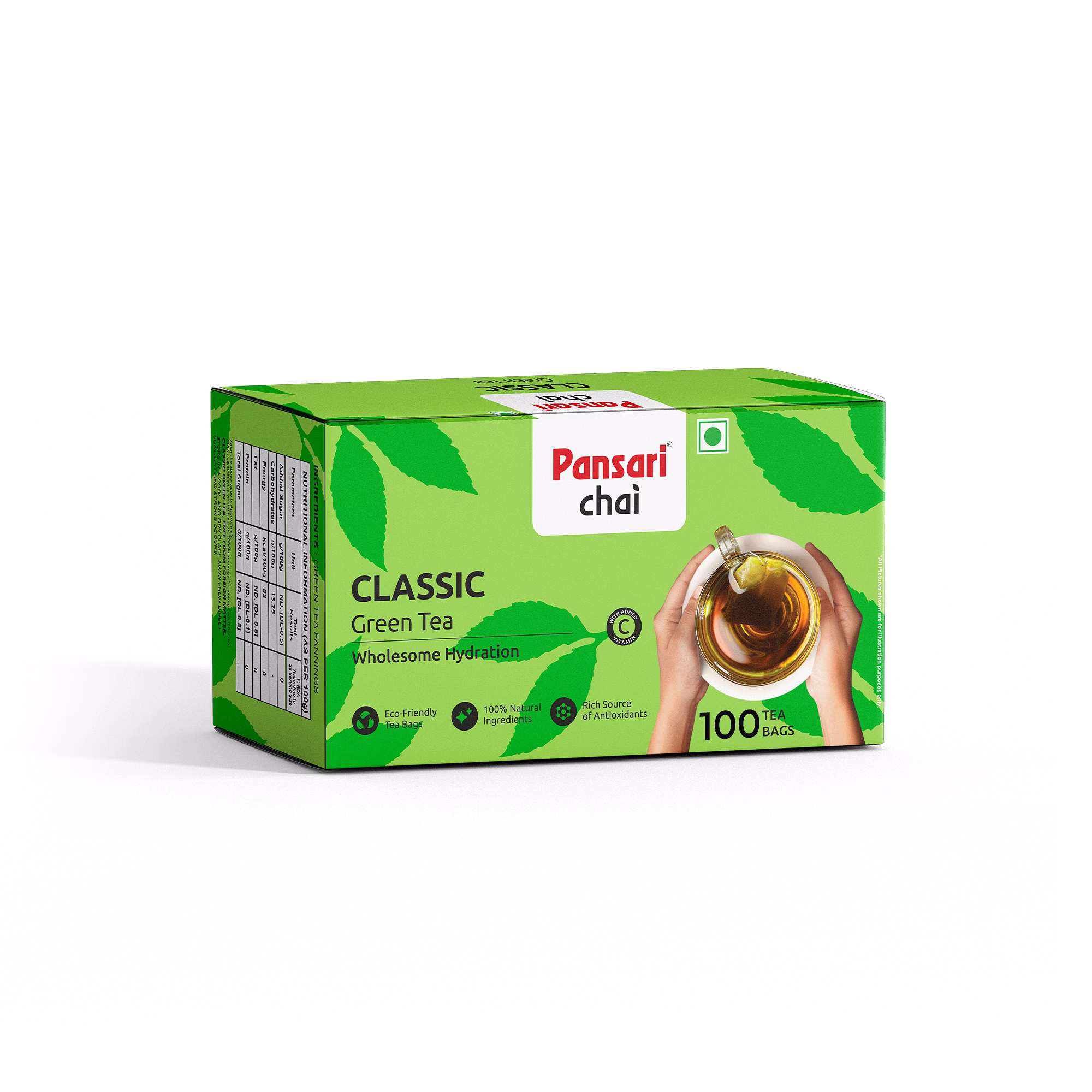 Pansari Natural Green Tea – 1.5g x 100 Tea Bags is a high-quality pure green tea known for its light taste and refreshing character.