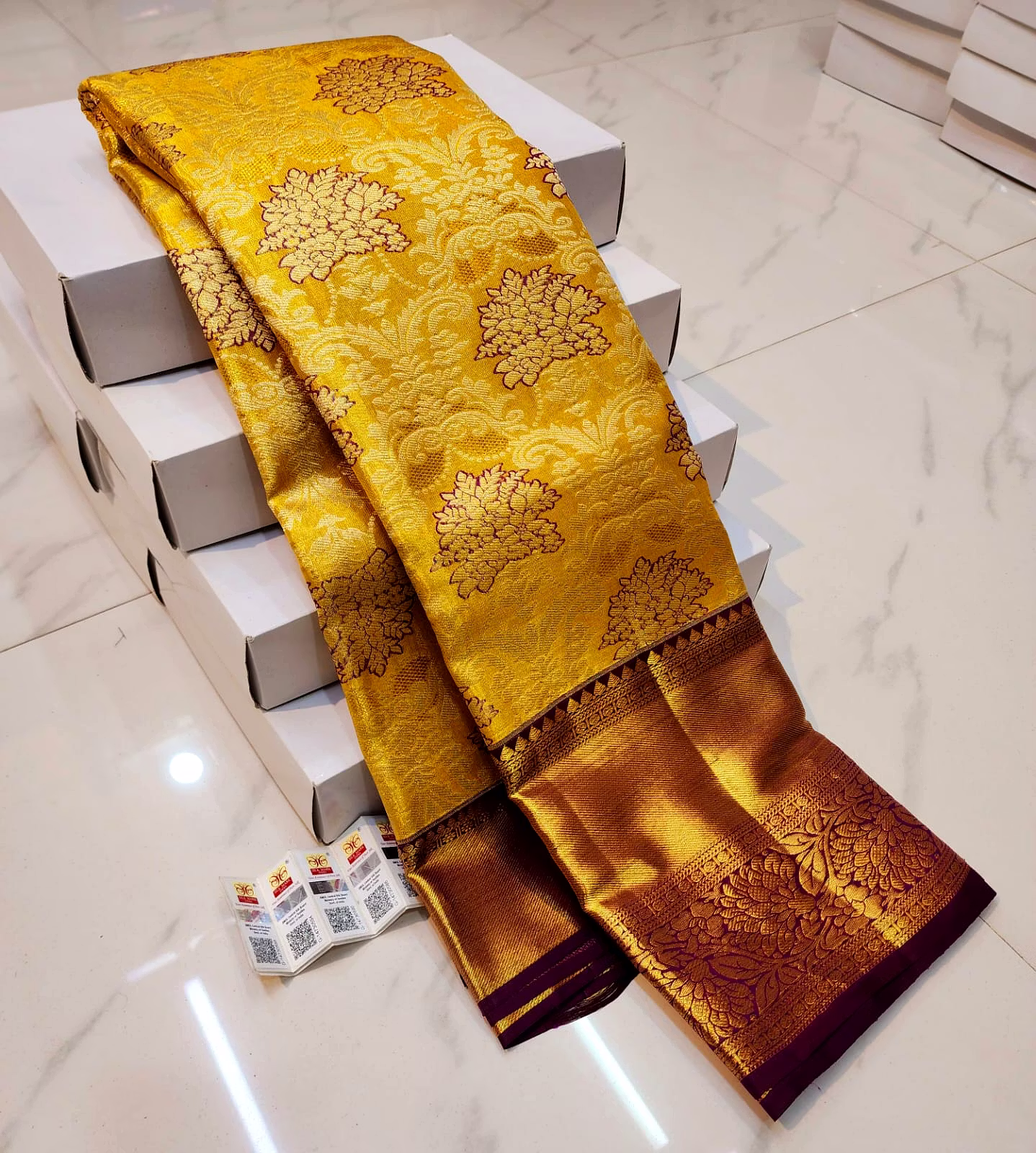 Elevate your style with our stunning Kanchi Silk Yellow Wedding Sari, crafted for special family ceremonies. Embrace tradition with this exquisite handloom silk sari.