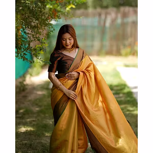 Step into the spotlight in our Kanchi silk yellow wedding sari, a masterpiece designed to exude elegance. This sari, woven with intricate craftsmanship and rich silk fabric, will make you the center of attention at any event.