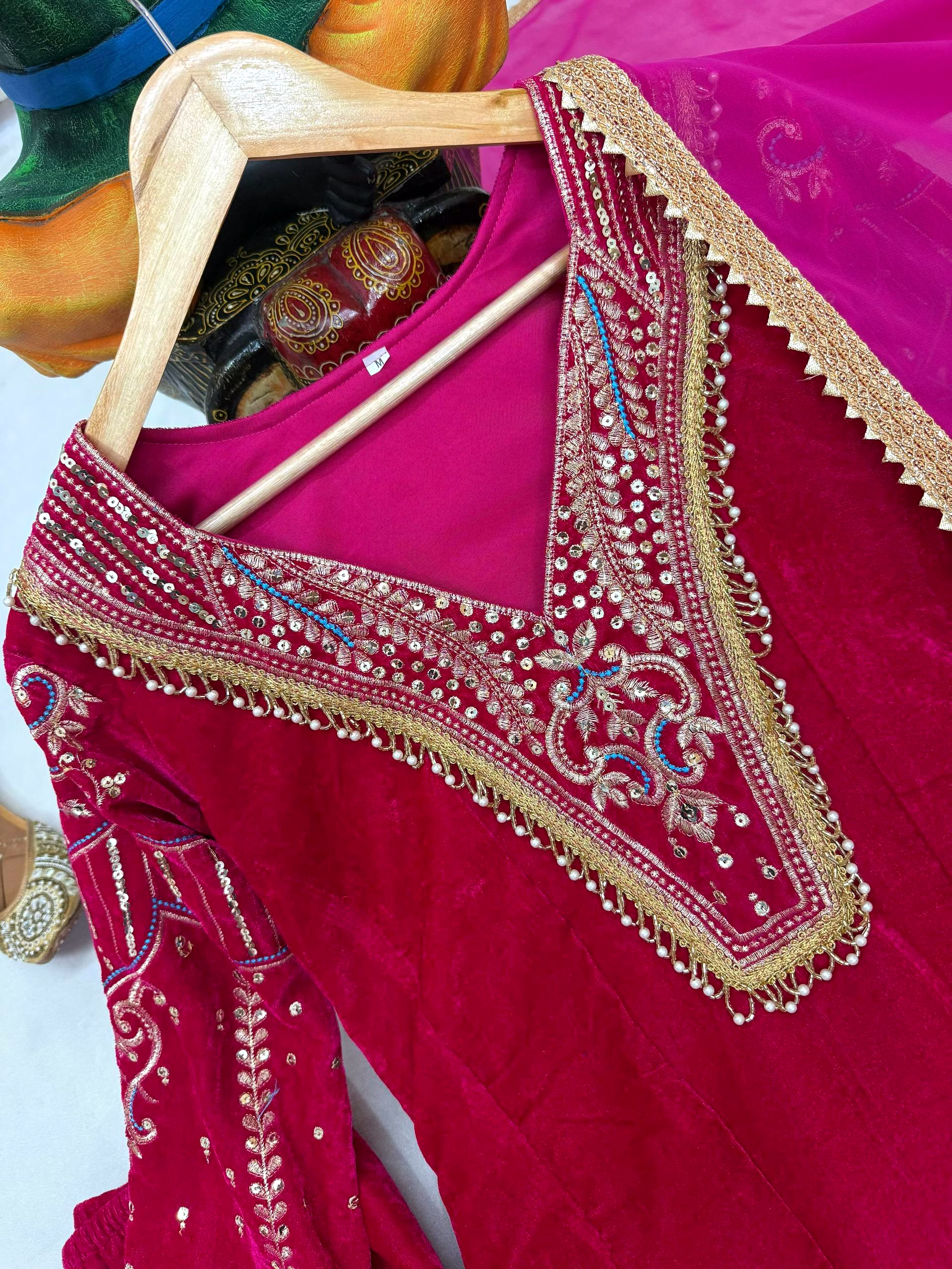 Pair this vibrant pink set with silver jhumkas or traditional Polki jewelry to highlight the Zari work. Complete the look with embellished juttis or metallic heels and a sleek clutch. For a winter wedding, the velvet fabric naturally keeps you warm while looking effortlessly chic.