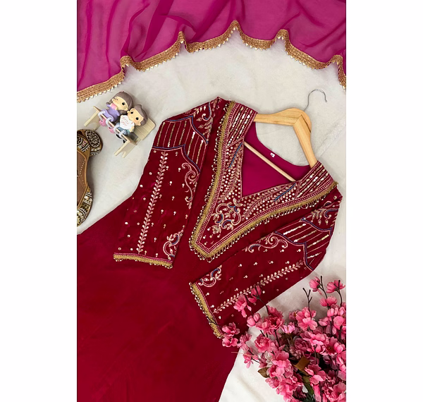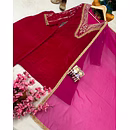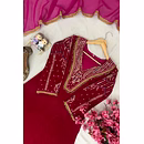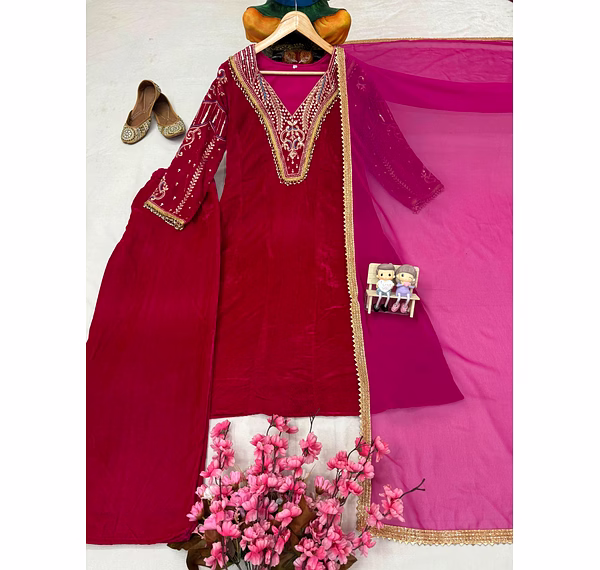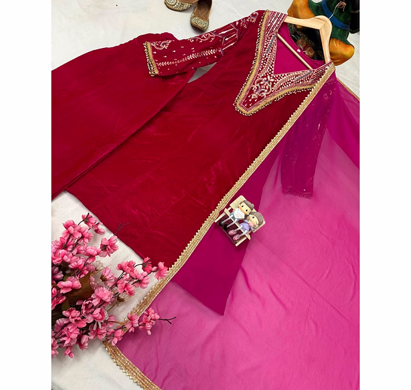 Indulge in the plush feel of Premium Velvet. This set features a beautifully crafted Kurti lined with soft Micro fabric for all-day comfort. The design is elevated by meticulous 5mm sequins and Zari embroidery, complemented by exquisite handwork lace. The matching velvet pants provide a seamless silhouette, while the lightweight Georgette dupatta with fancy lace borders adds a touch of airy elegance.