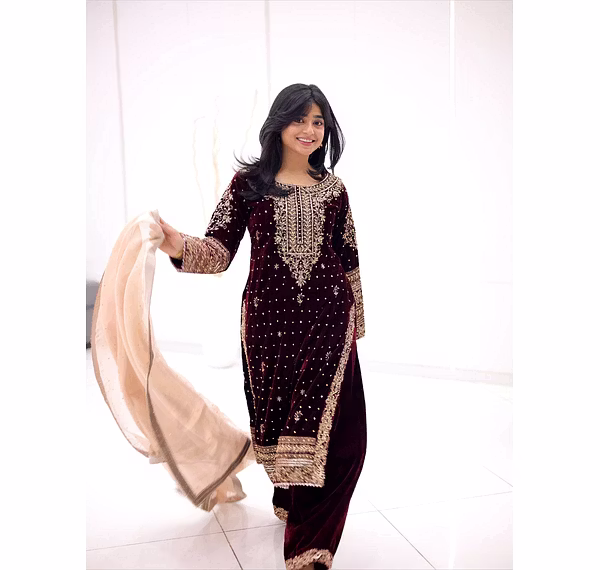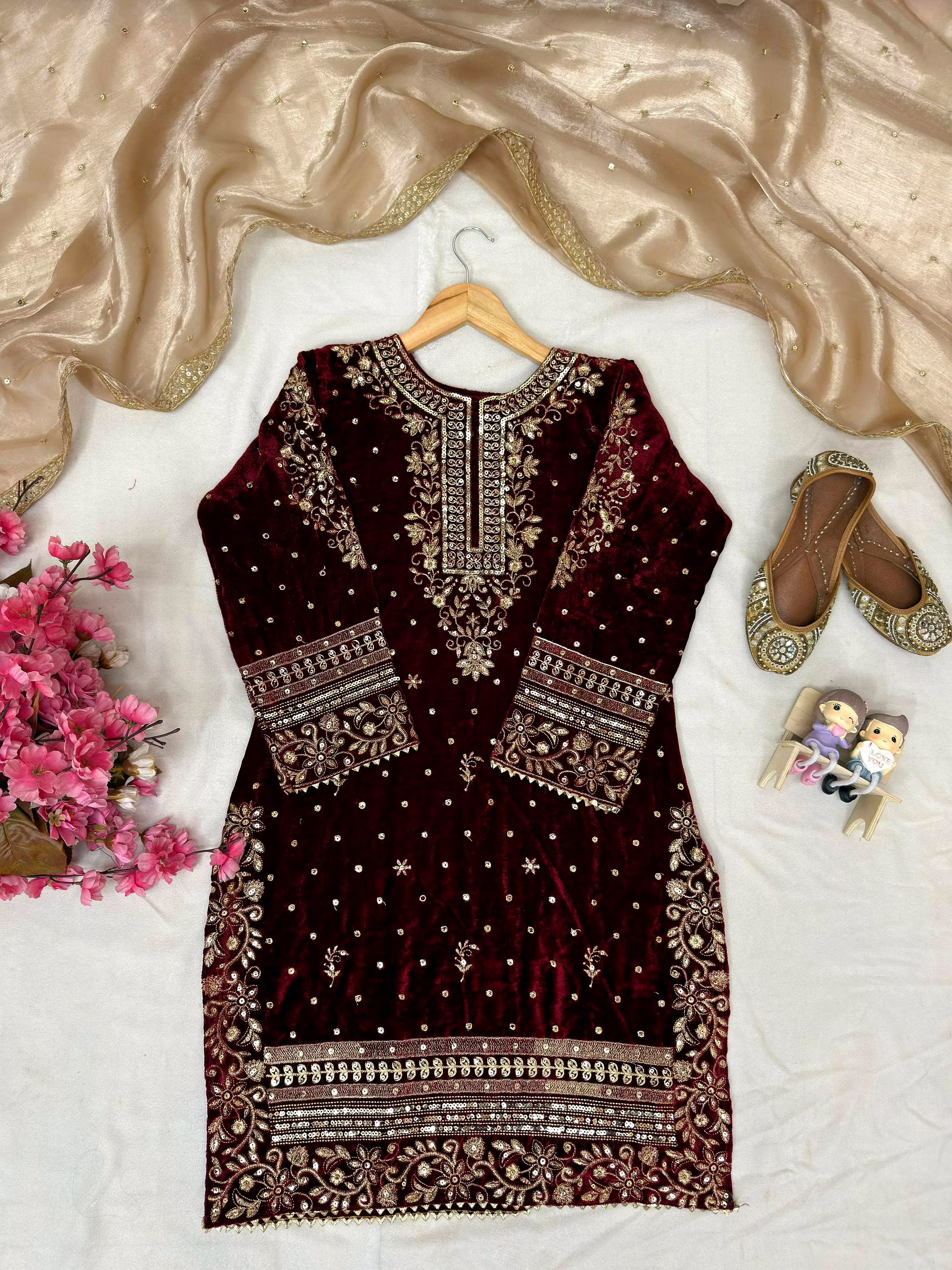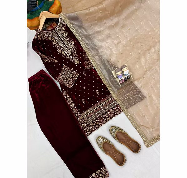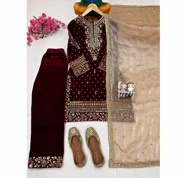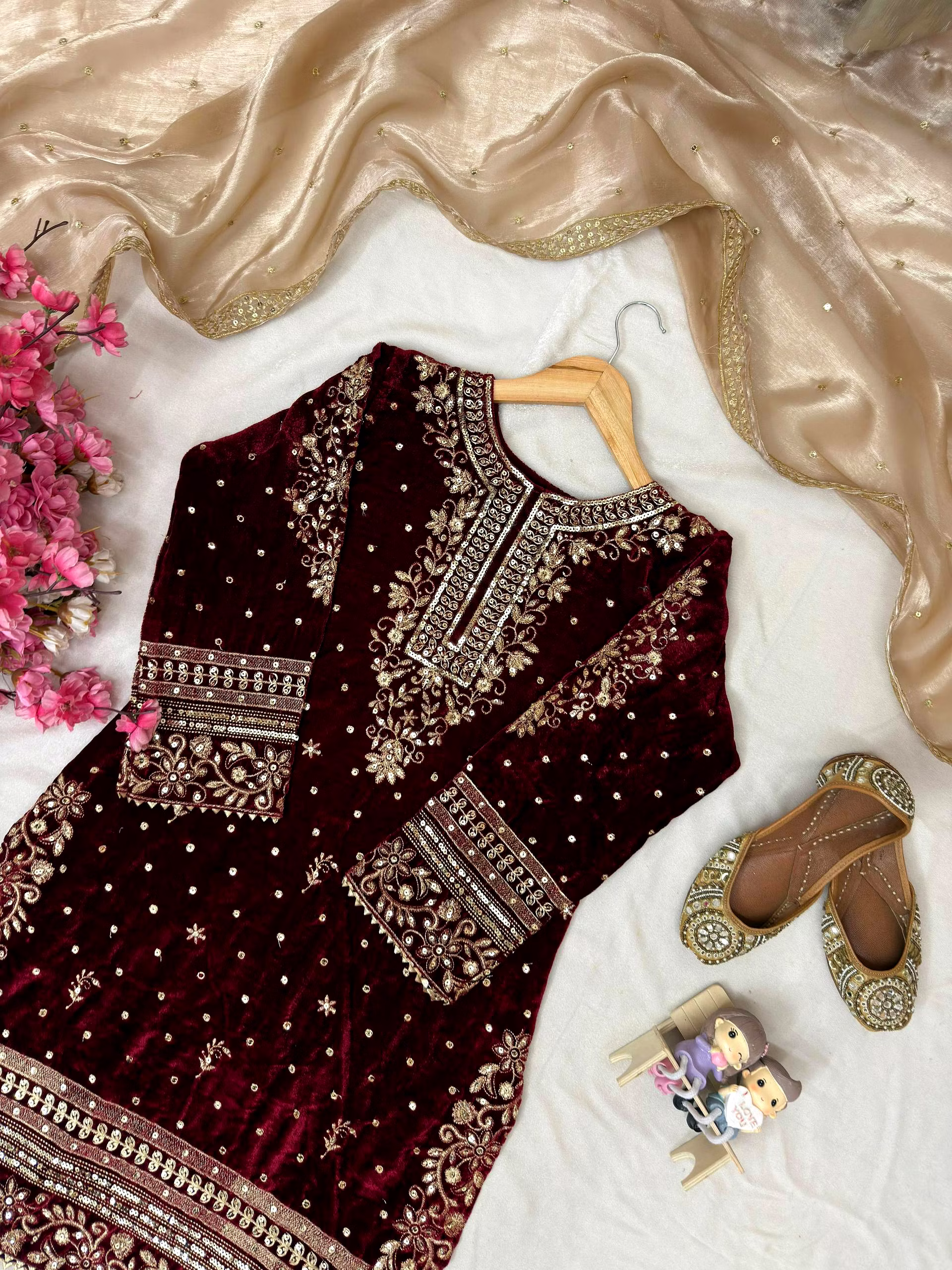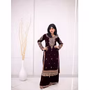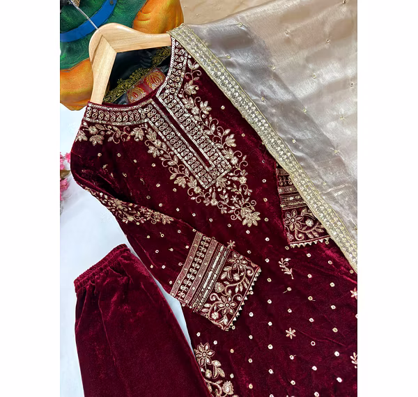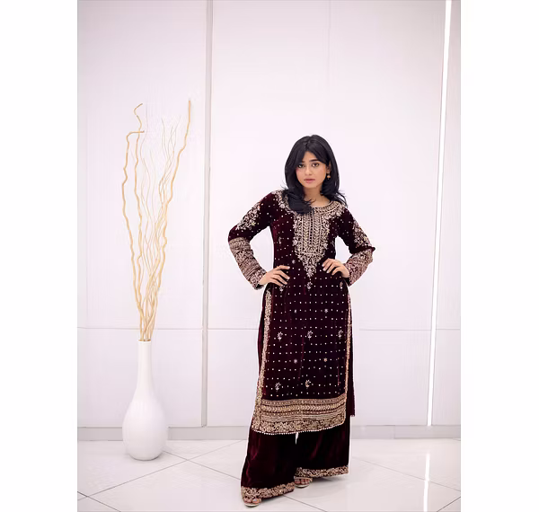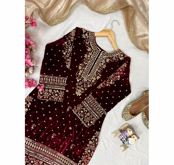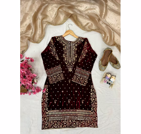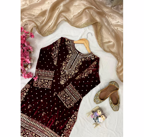Each Plain Velvet Kurti Set comes with a fully stitched Kurti, Palazzo, and Dupatta, ensuring a hassle-free and fashionable look. The exquisite 5mm sequins and Zari embroidery work further enhance the appeal of this ensemble, making it a must-have for your winter wardrobe.