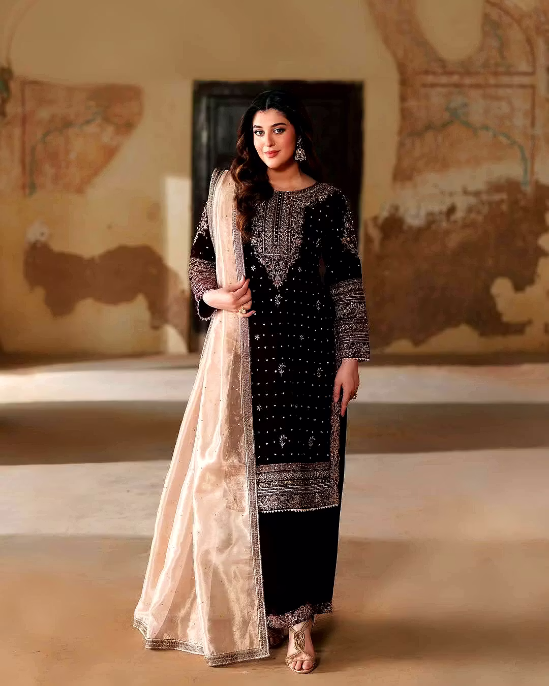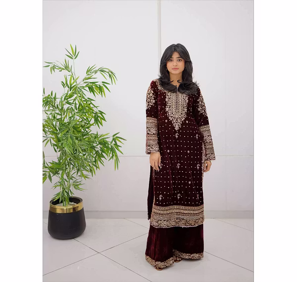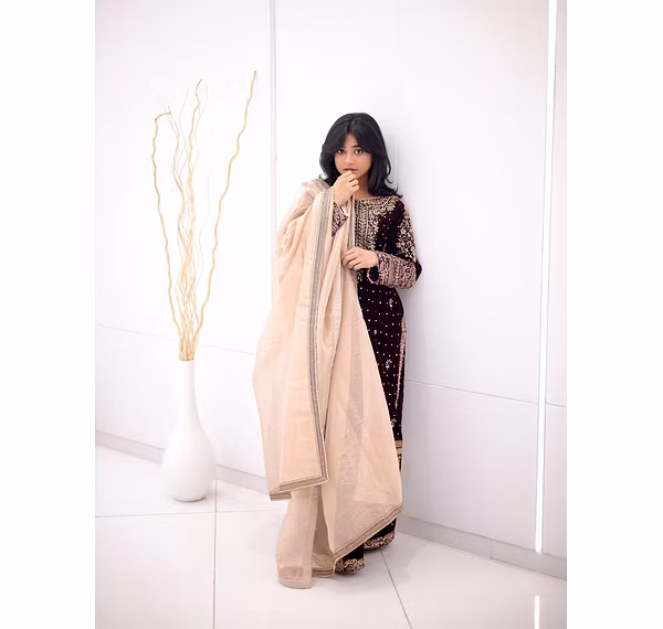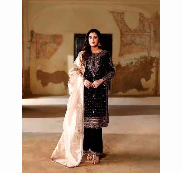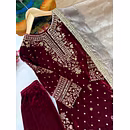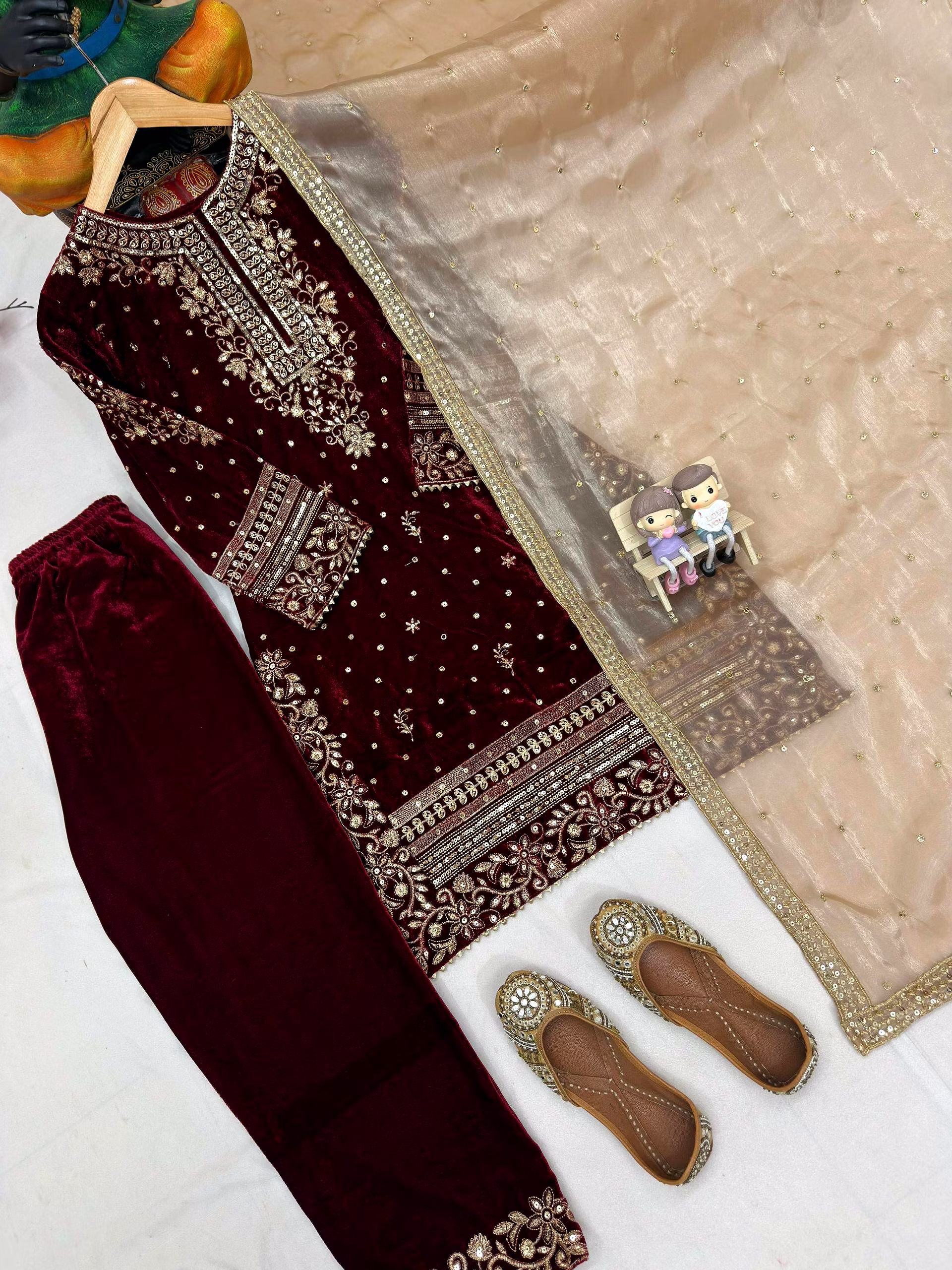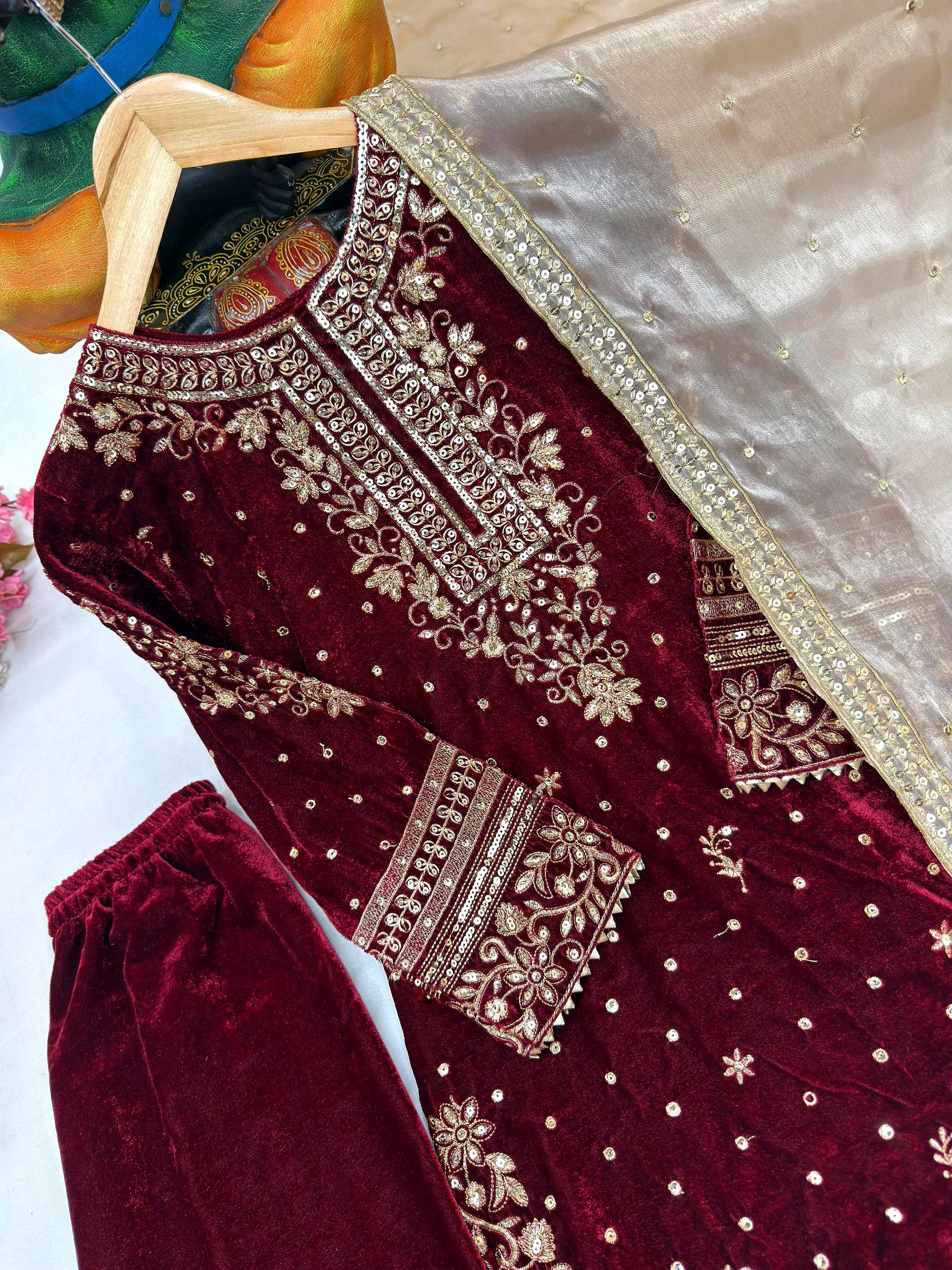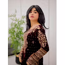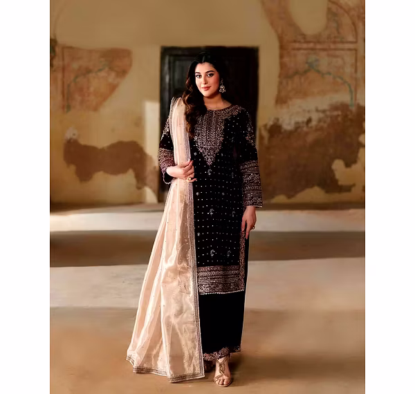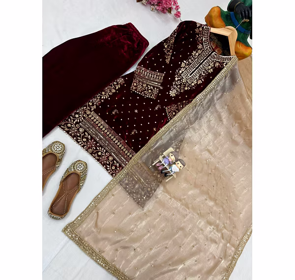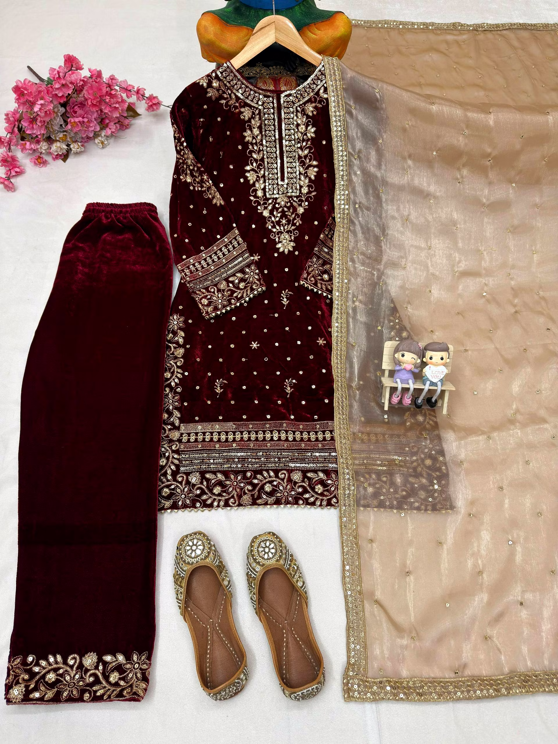Each Plain Velvet Kurti Set comes with a fully stitched Kurti, Palazzo, and Dupatta, ensuring a hassle-free and fashionable look. The exquisite 5mm sequins and Zari embroidery work further enhance the appeal of this ensemble, making it a must-have for your winter wardrobe.