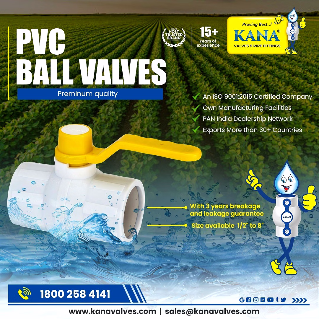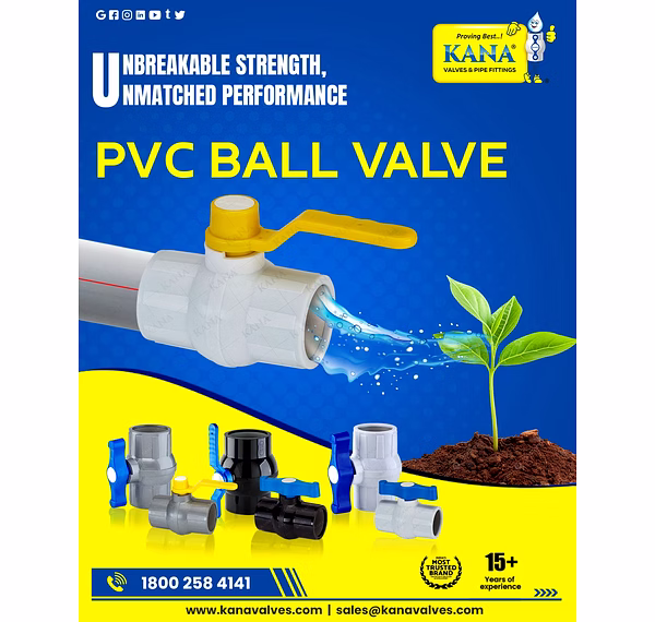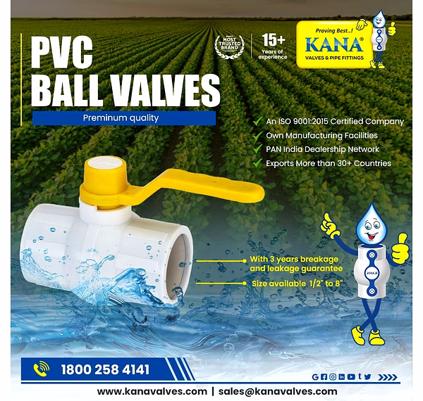 KANA VALVES PVT. LTD. is a trusted manufacturer delivering high-quality plastic valve solutions across India and global markets. Our PVC Ball Valves are designed to meet industry standards while offering durability, affordability, and performance you can rely on for agriculture, plumbing, and industrial use.