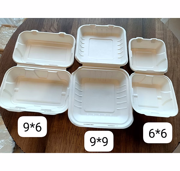 Tailored to meet your needs, our Bagasse Clamshell containers come in convenient sizes of 6*6, 9*6, and 9*9. Whether packing a snack or a full meal, these containers provide the perfect fit for various dining occasions.