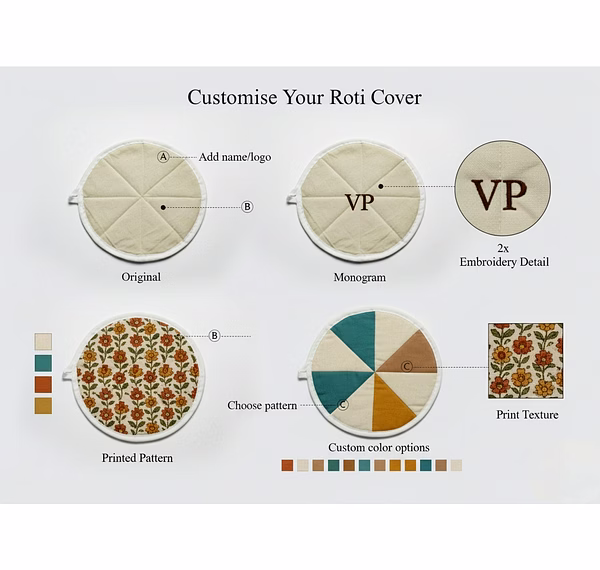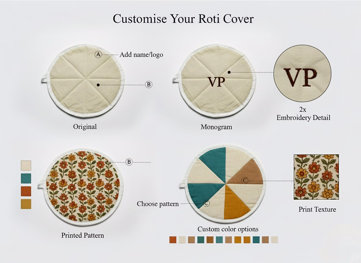 Keep your rotis/chapatis fresh and warm for longer with this Premium Cotton Roti Warmer Pad Set. Made from high-quality, food-safe cotton fabric, this pad is perfect for Indian kitchens as well as global kitchens for tortillas, naan, pita bread, parathas and more. Ideal for both everyday use and gifting.