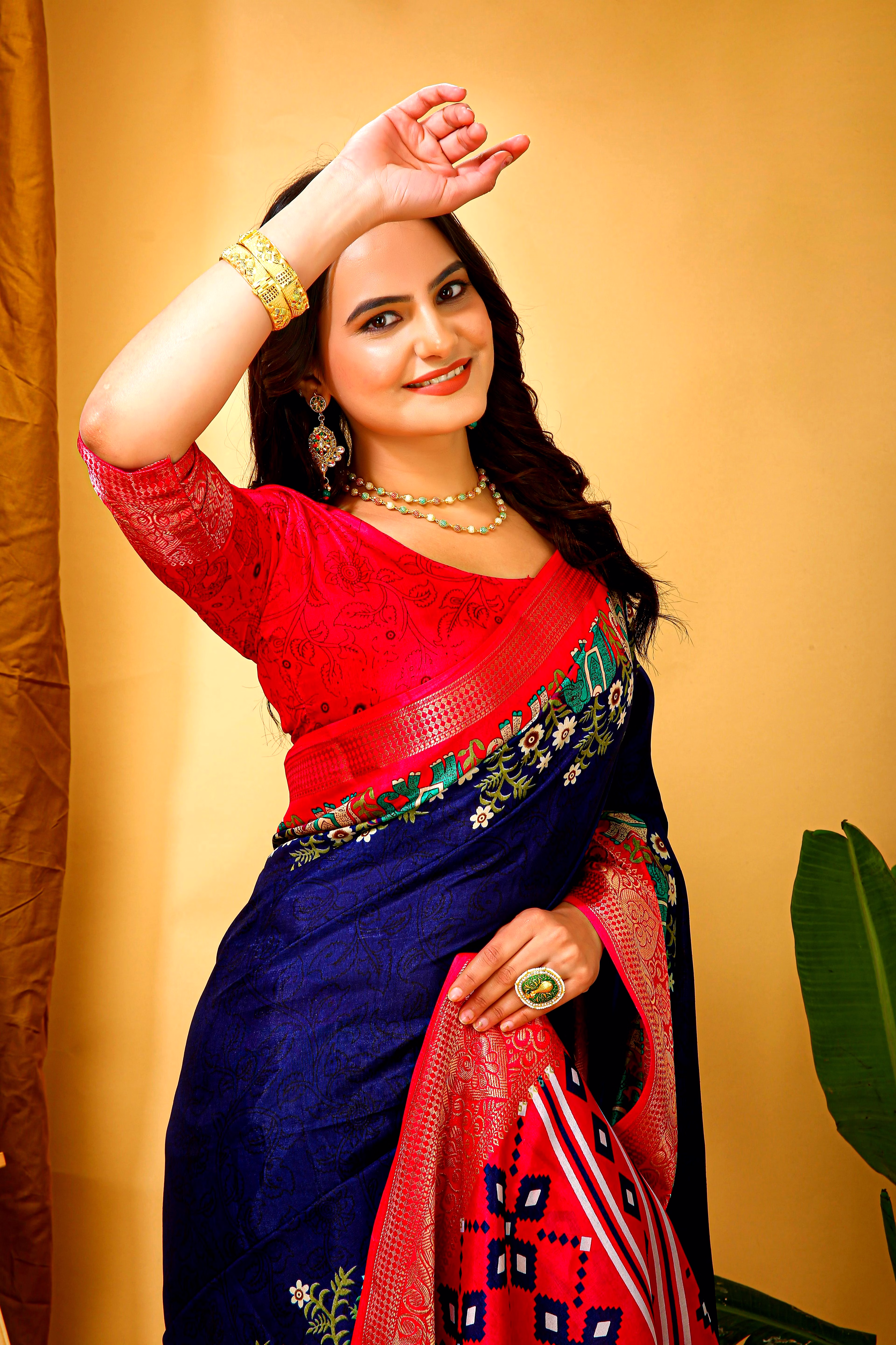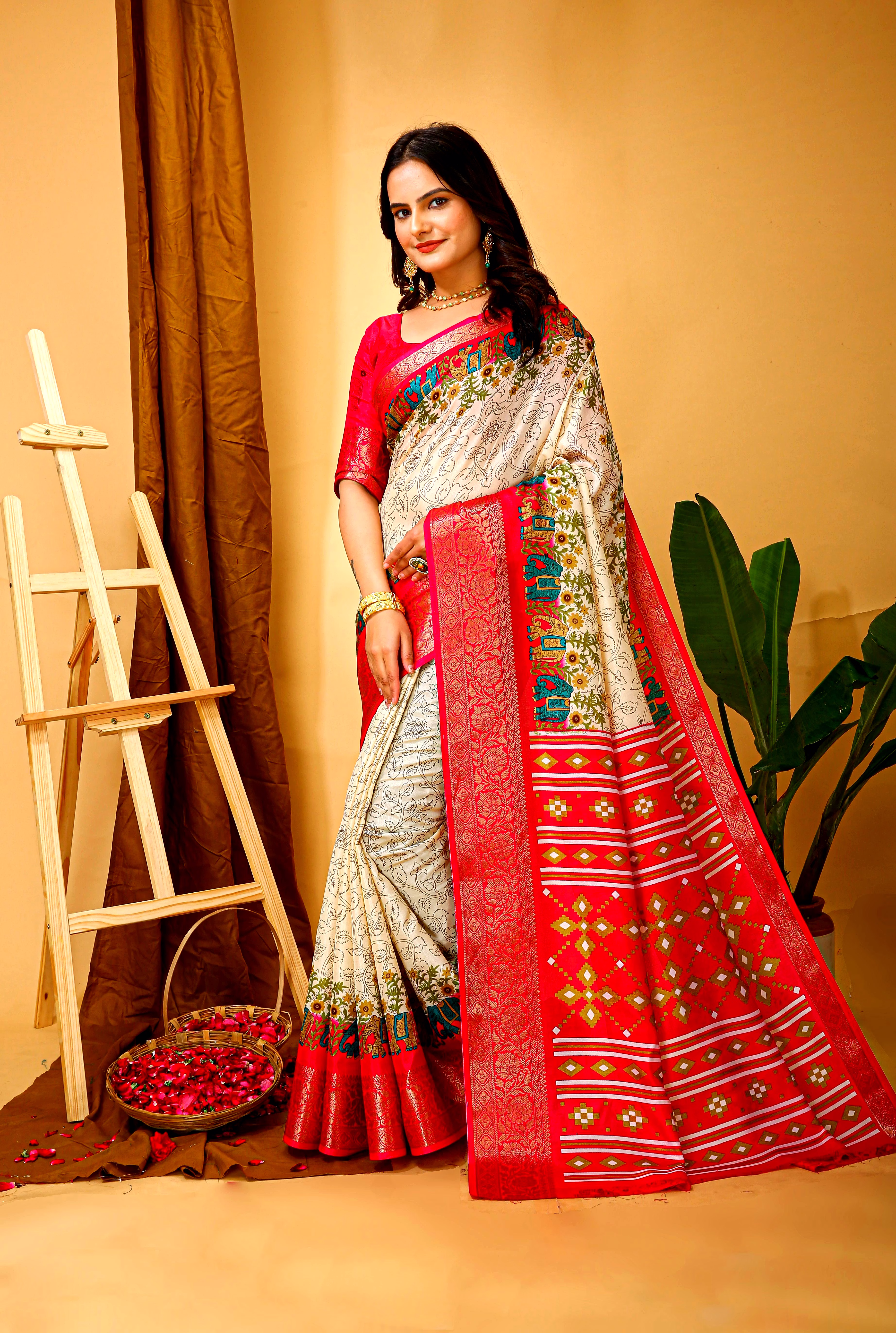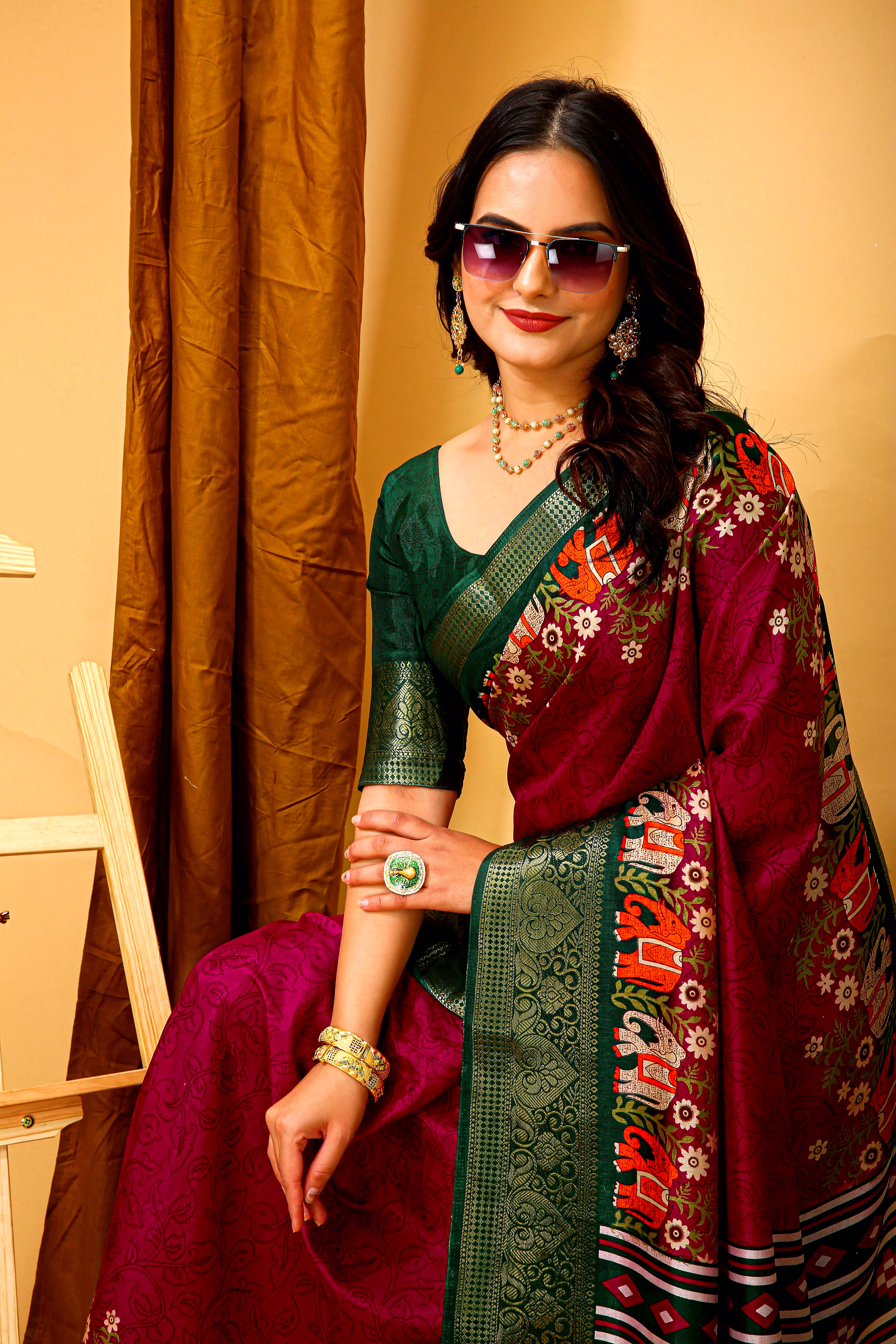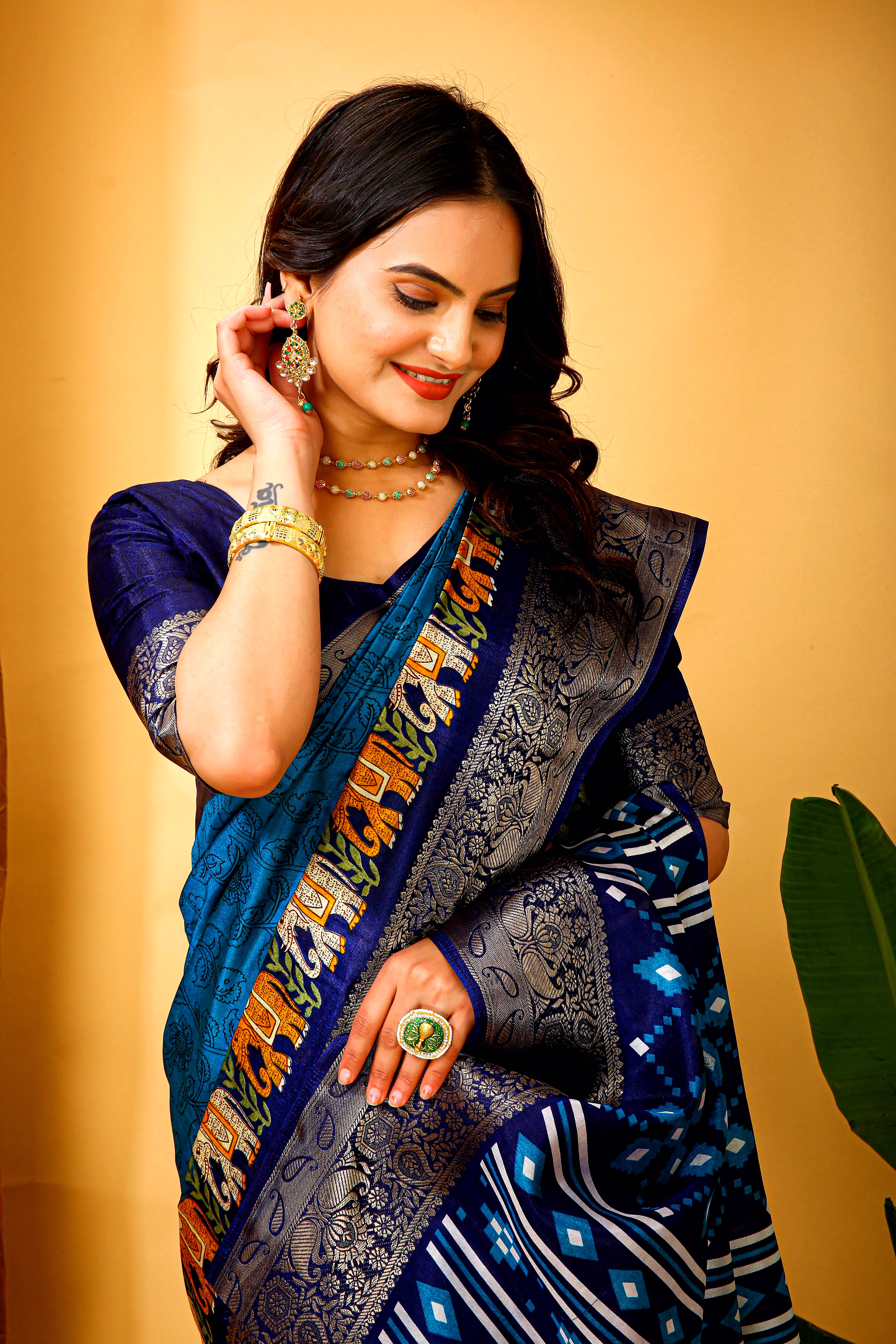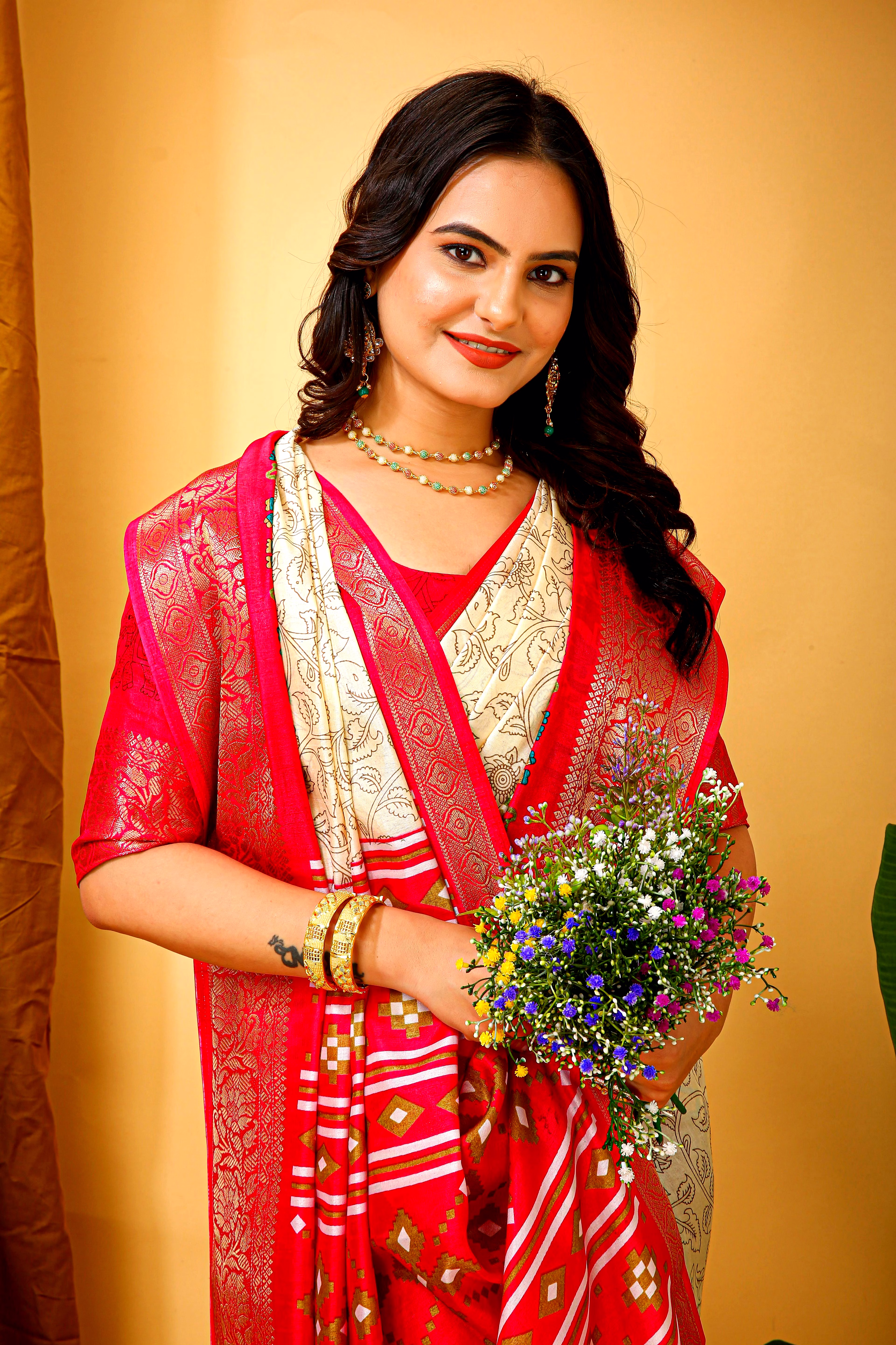 Embrace tradition with a touch of modernity as you adorn this Dola Silk Saree. From intricate blouse designs to contemporary draping styles, this saree is a perfect blend of heritage and trend, ideal for women seeking a fusion of classic elegance and contemporary fashion.