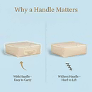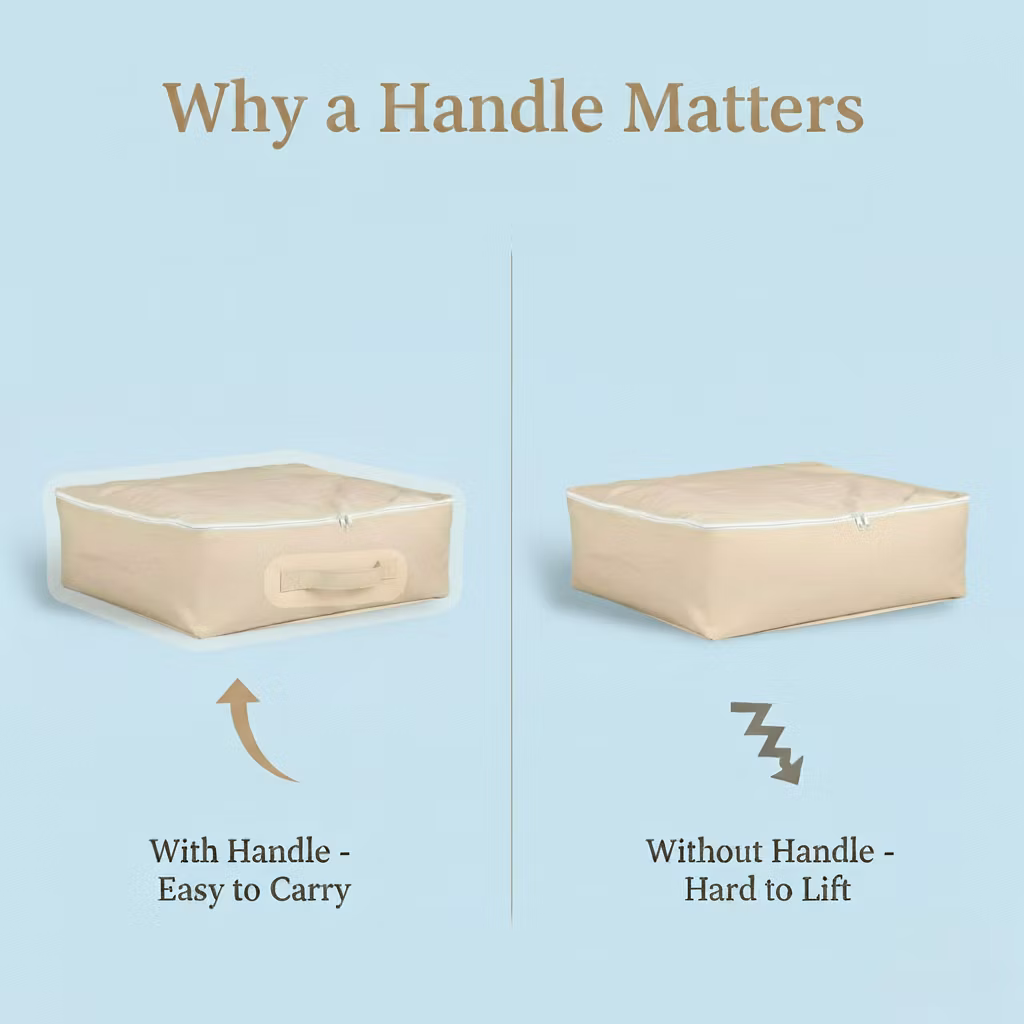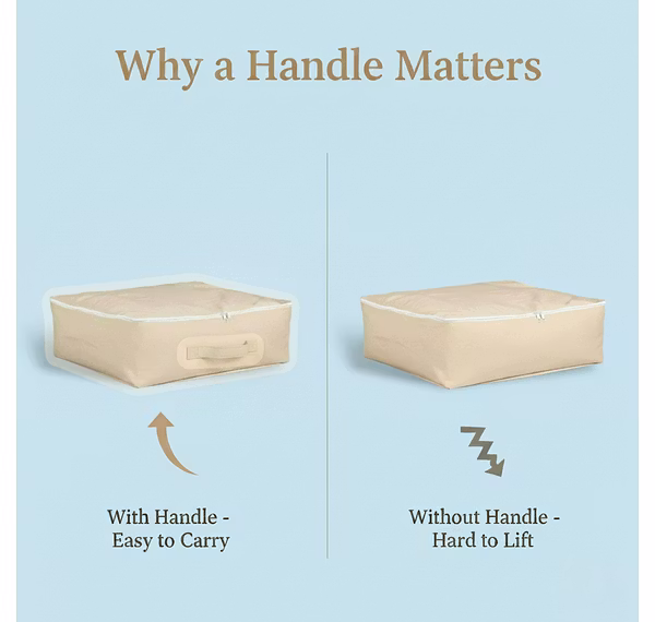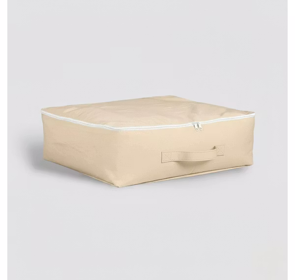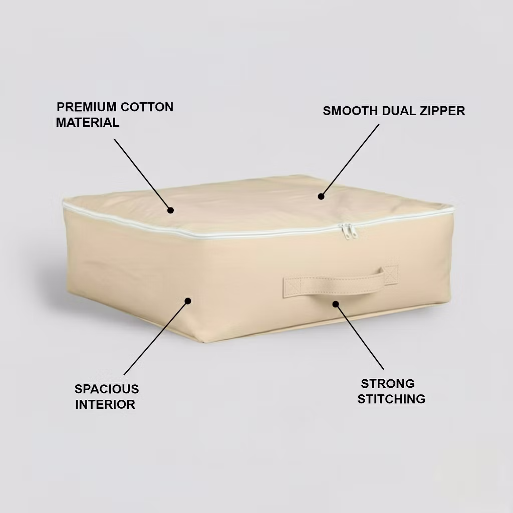 This fabric storage bag is built for long-lasting and practical wardrobe organization. Made from premium stitched fabric, it protects clothes from dust while keeping your wardrobe neat. The reinforced handle allows easy lifting even when the bag is fully packed. Its wide, spacious interior fits sarees, dresses, sweaters, bedsheets, and other garments. The smooth zipper ensures secure closure, and the bag folds flat when not in use, making it ideal for wardrobes, shelves, and under-bed storage.